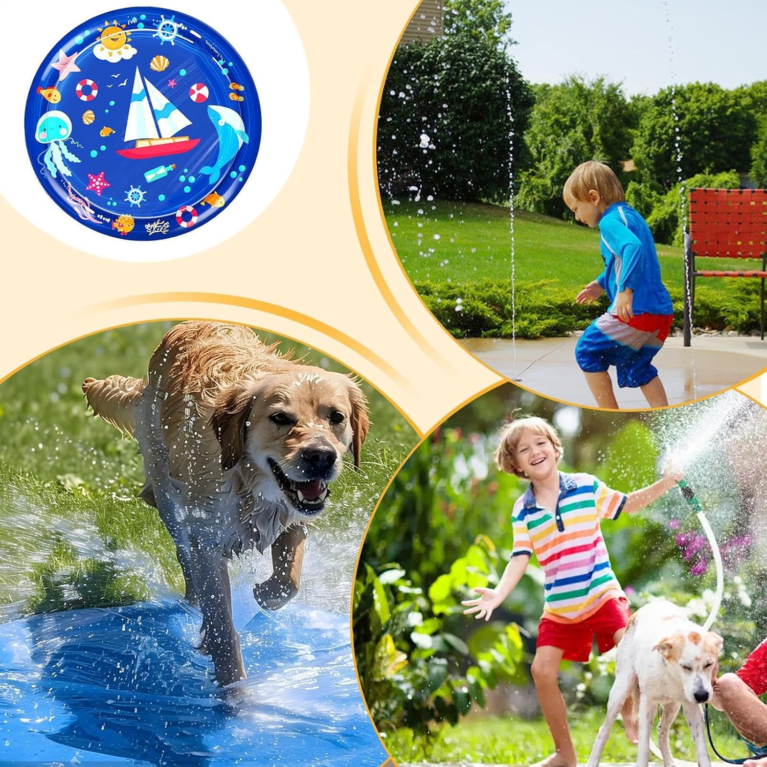 Flusso efficiente: Progettato per tubi standard da 1/2 pollice, abilita riempimento veloce e interazione costante con fontana circolare, amplificando la versatilità di gioco esterno per garantire coinvolgimento immediato e dinamico divertimento sul tappeto spruzzatore Materiale Sicuro: Ottimizzato con design antiscivolo e durabilità del PVC rinforzato, offre resistenza a graffi e usura, insieme a tenuta stagna, per supporto affidabile alle attività all'aperto. Installazione Rapida:Configurazione semplice per uso immediato e adattabile, ideale per attività all'aperto improvvisate con gli animali domestici di Stampa: Ottieni una maggiore bellezza esterna con tonalità durevoli resistenti sbiadimento e tecnologie di stampa avanzate progettate per ambienti da giardino dalla Noia: Contrasta l'irrequietezza con getti d'acqua divertenti che rinfrescano i pet e aumentano la loro energia durante le attività all'aperto