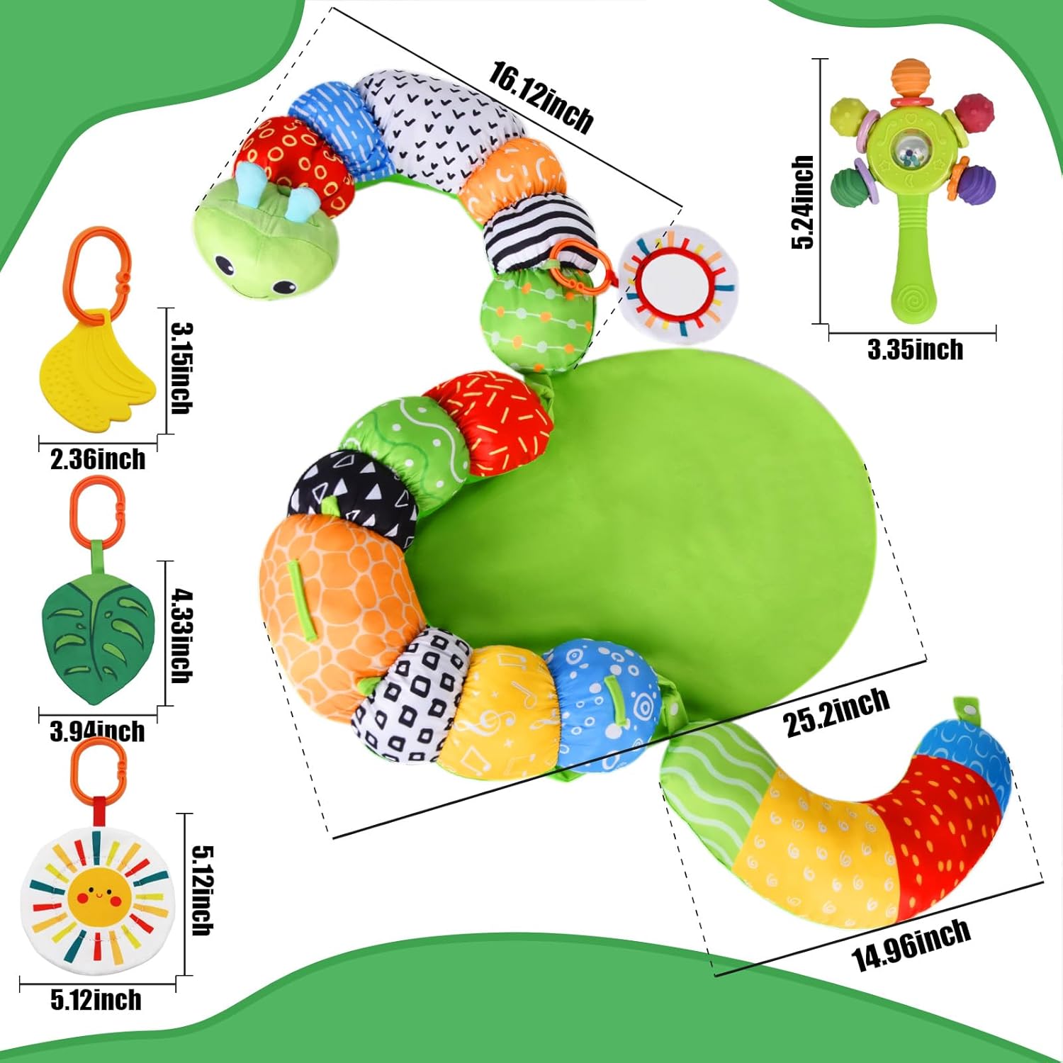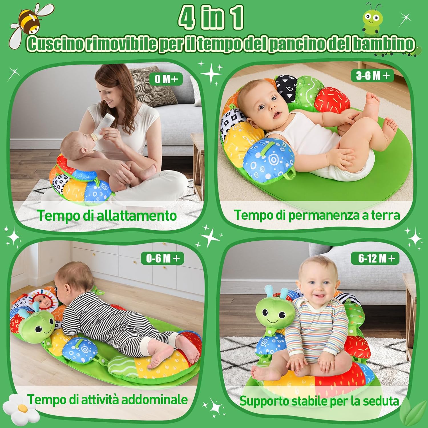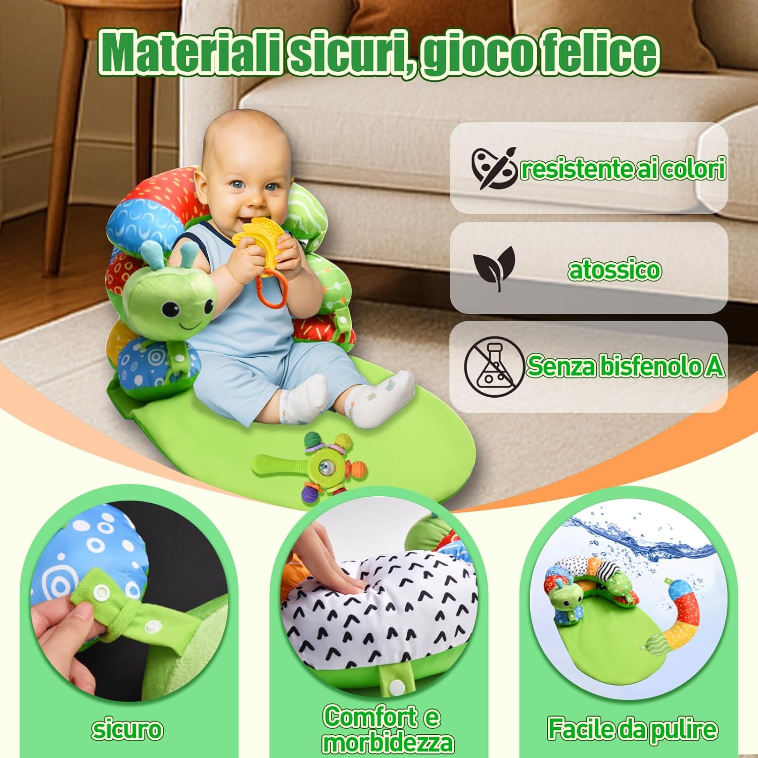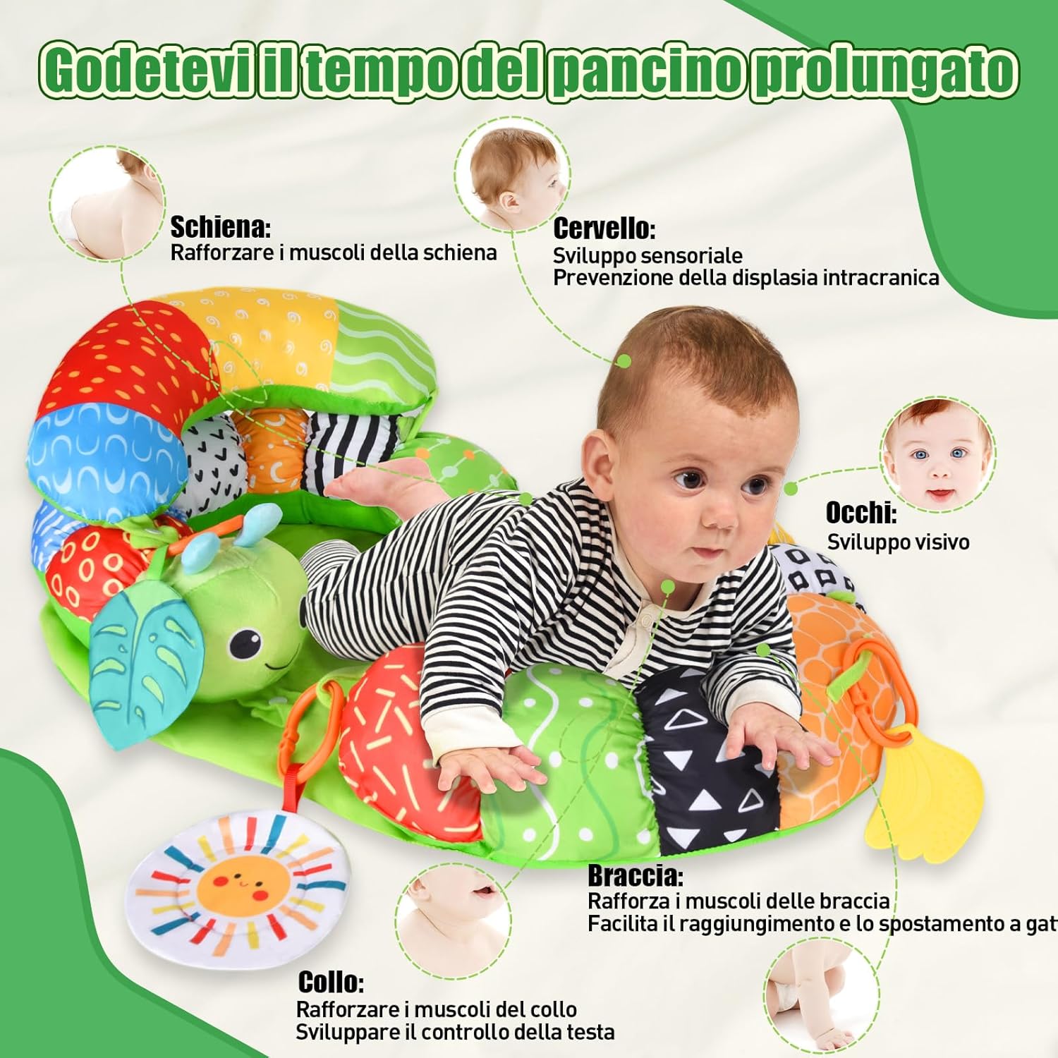 🌈【Tappeto gioco neonato a forma di bruco】Questo colorato tappeto gioco neonato a forma di simpatico bruco accompagna il tuo bambino in ogni fase della crescita: dal tummy time neonato fino ai primi tentativi di stare seduto. Il design ergonomico sostiene delicatamente la muscolatura del collo e del tronco, mentre la morbida forma a C avvolge il piccolo offrendo comfort e stabilità. Un tappeto tummy time neonati perfetto per incoraggiare il movimento in modo naturale e divertente. 🎨【Giocattolo interattivo per neonati dai 0 mesi】Dotato di dettagli accattivanti come un foglio frusciante, un sonaglino, uno specchietto e un anello da dentizione, questo set intrattiene il neonato con attività sempre nuove. Le diverse texture e superfici favoriscono la coordinazione mano-occhio e spingono il bambino ad afferrare, scuotere e osservare. Tutti gli elementi sono facilmente accessibili anche per i più piccoli, rendendo il tappeto gioco perfetto per giochi attivi già dai primi mesi. 🧸【Comfort in ogni posizione】Grazie alla sua imbottitura morbida e alla forma curva, il tappeto offre un supporto stabile durante ogni fase, accompagnando il bambino durante il tummy time e oltre. Il cuscino tummy time neonato integrato aiuta a rinforzare delicatamente la muscolatura e rende ogni momento passato sul tappetino ancora più confortevole. Il fondo antiscivolo assicura stabilità su ogni superficie. 🧼【Facile da usare e pensato per l’uso quotidiano】Questo tappeto tummy time neonati è progettato per integrarsi perfettamente nella routine familiare. I giocattoli si rimuovono facilmente e possono essere conservati o puliti separatamente. La struttura compatta e resistente lo rende ideale per l’utilizzo in casa o durante le uscite. Leggero e comodo da trasportare, è il compagno ideale per ogni avventura quotidiana. 🎁【Un regalo perfetto per ogni occasione】Questo set curato nei dettagli unisce gioco, sostegno e comfort in un solo prodotto. È il regalo perfetto per nascita, baby shower, Natale, Pasqua, Capodanno o il primo compleanno. Il tappeto gioco neonato cresce con il bambino, offrendo divertimento e supporto in ogni fase dello sviluppo.