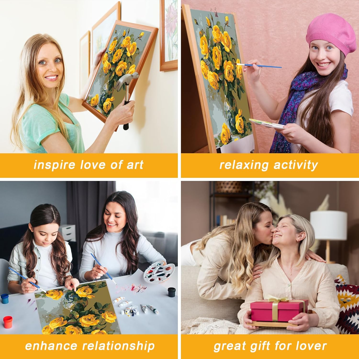 Tela colorata: la nostra pittura con i numeri utilizza tela colorata, che è diversa dalla normale tela. La tela colorata è più facile distinguere le aree digitali e non sarà stanca quando si dipinge per un lungo periodo di tempo, ed è più efficiente completare la pittura ad olio. Rilassamento e decompressione: dipingere con i numeri ti permette di rilassarti e goderti il tuo spazio. Puoi dipingere con i tuoi figli per stimolare la loro creatività e capacità cognitive; puoi interagire con amici e parenti per aumentare l'intimità e i bei ricordi. Facile pittura numerica: i numeri sulla scatola di vernice corrispondono ai numeri sulla tela per dipingere il proprio stile artistico. Aprire la vernice per iniziare a dipingere, e si prega di coprirla saldamente quando non in uso. Credeteci, godrete dell'orgoglio e della gioia di completare il dipinto. Regalo perfetto: la pittura con numeri adulti è un ottimo regalo per compleanni, Natale, Ringraziamento, San Valentino, ecc. Che tu sia un principiante o no, la pittura digitale fai da te è un hobby semplice e interessante che soddisfa il desiderio di dipingere. Soddisfacente post-vendita: è possibile ottenere 1 tela numerata (senza cornice), 1 set di colori acrilici, 3 pennelli, 1 piccola immagine a colori, 1 carta numerata, 2 ganci e 2 viti.