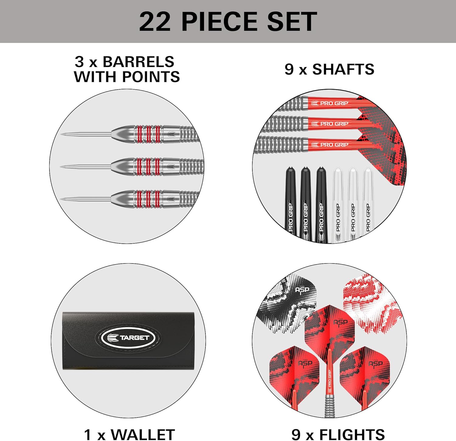 | Contenuto della confezione | 3 barilotti in ottone con punte fisse in acciaio (argento, 26 mm) 9 aste Pro Grip (corte, 34 mm) 9 alette Pro Ultra n. 2 1 custodia pieghevole per freccette |