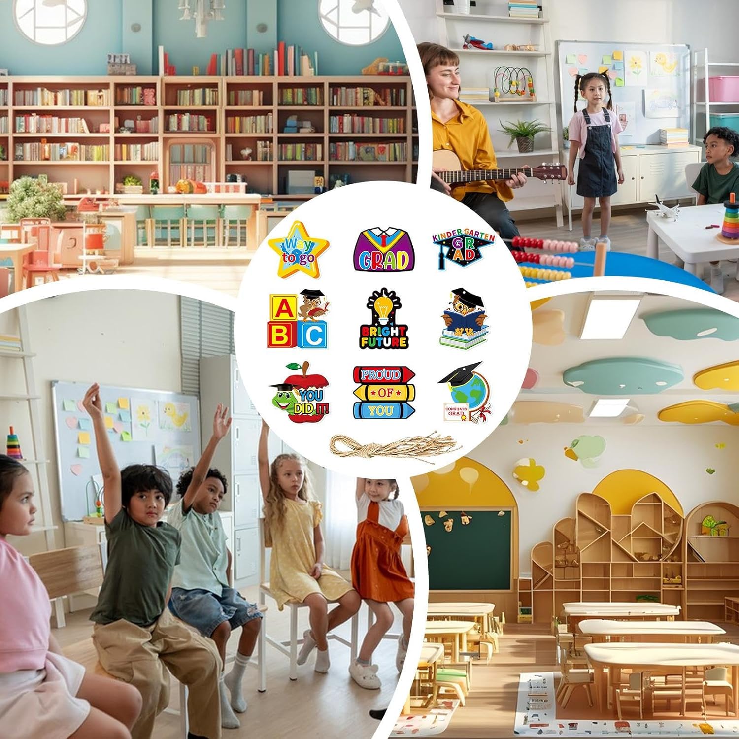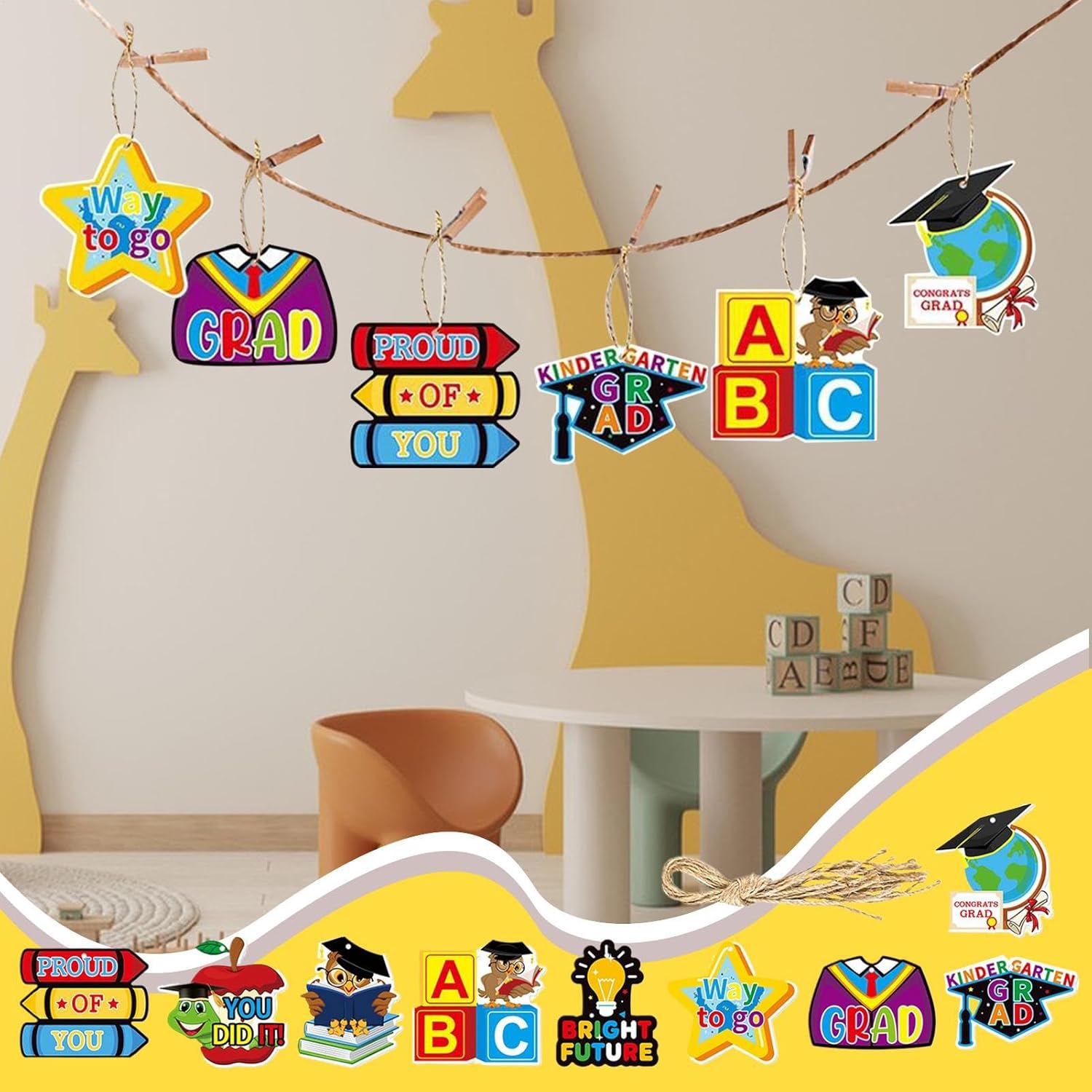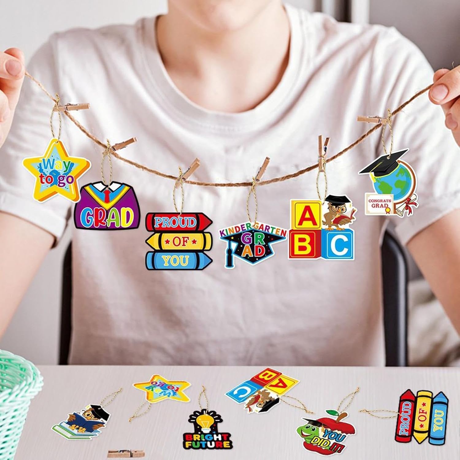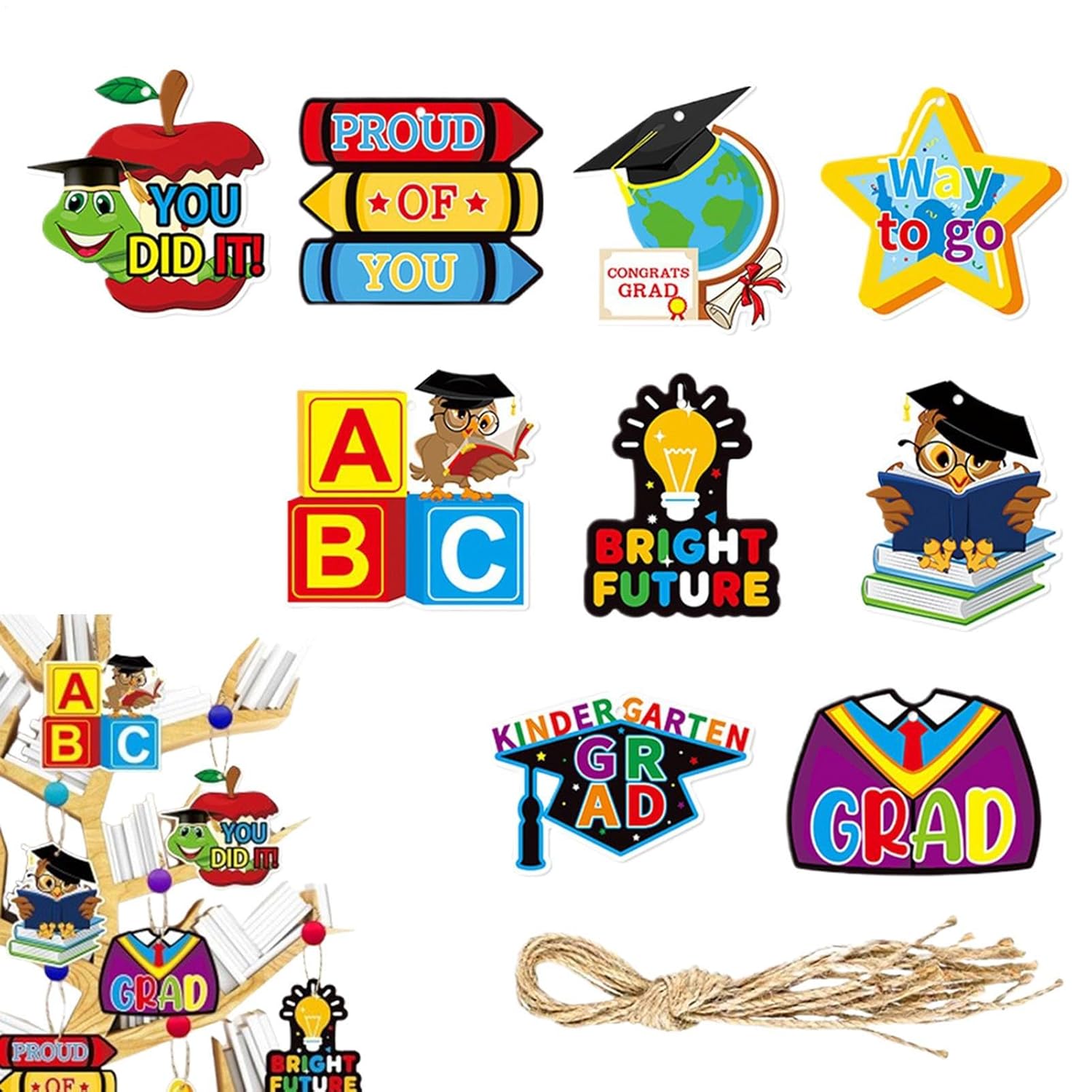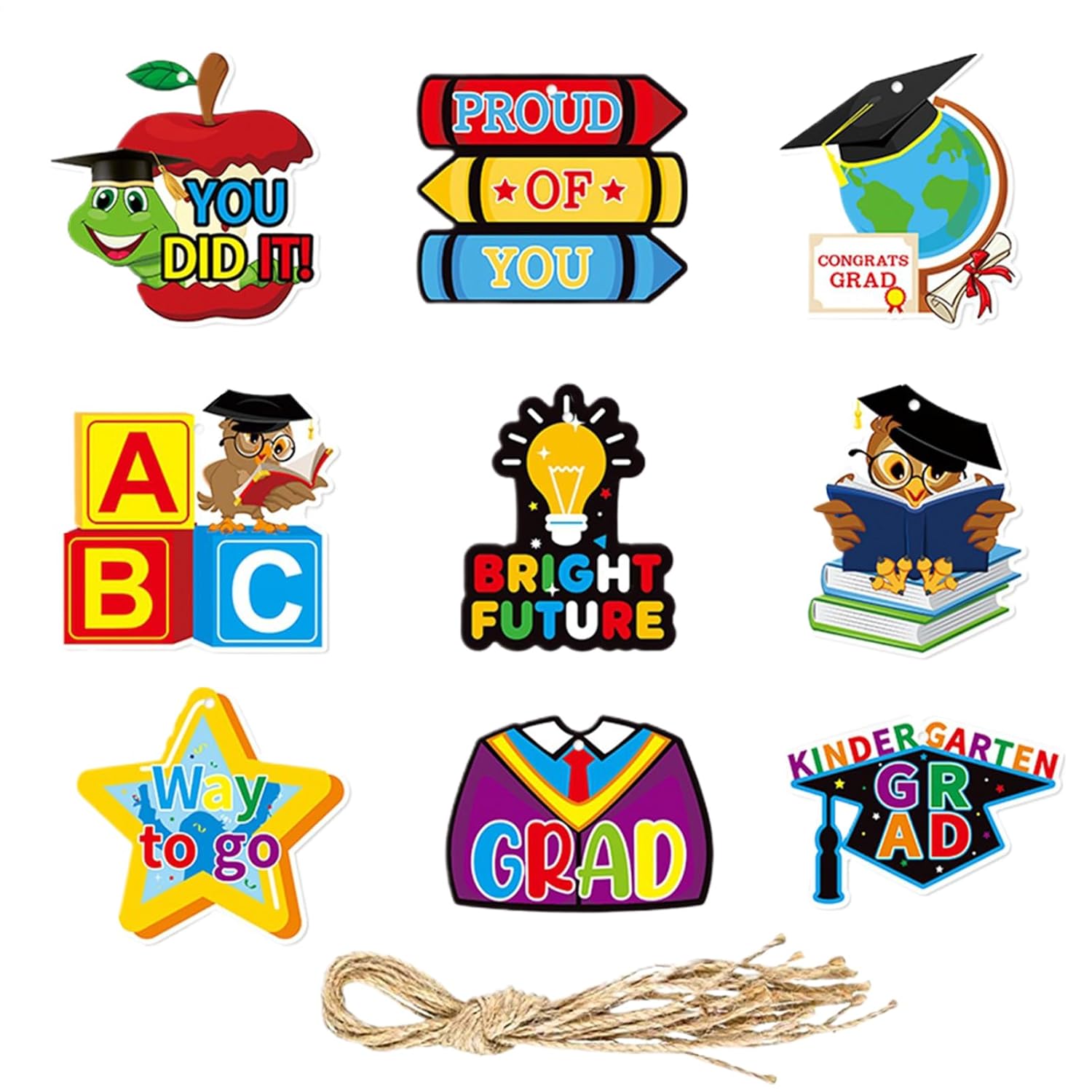 Organizzazione salva-spazio: I pezzi modulari offrono un effetto decorativo stratificato, si adattano a spazi ridotti e consentono infinite combinazioni per allestimenti creativi e dinamici Materiale Resistente: Progettate per durare, le targhe uniscono una texture delicata, tonalità a lunga tenuta, cartoncino spesso rinforzato e bordi perfettamente rifiniti, ideali per eventi memorabili come la cerimonia di fine anno. Praticità d'uso: La combinazione di materiali leggeri e cordino naturale garantisce un'installazione istantanea per sospensioni decorative stabili, ideale per allestire scenografie per feste di fine anno scolastico Bigliettini Festosi: Portate un tocco caloroso e giocoso alla cerimonia del vostro bambino attraverso bigliettini creativi, con tema laurea e completi di allegri messaggi di auguri Artigianato pregiato: Bordi arrotondati e strato protettivo opaco assicurano maneggevolezza sicura e durabilità, arricchiti da stampa ad alta risoluzione e arte dettagliata per una nitidezza eccellente