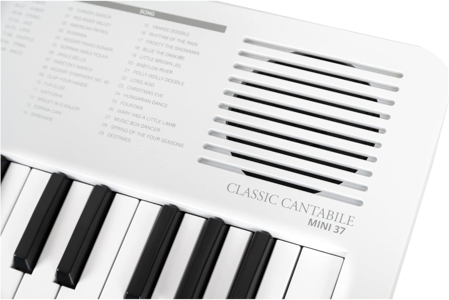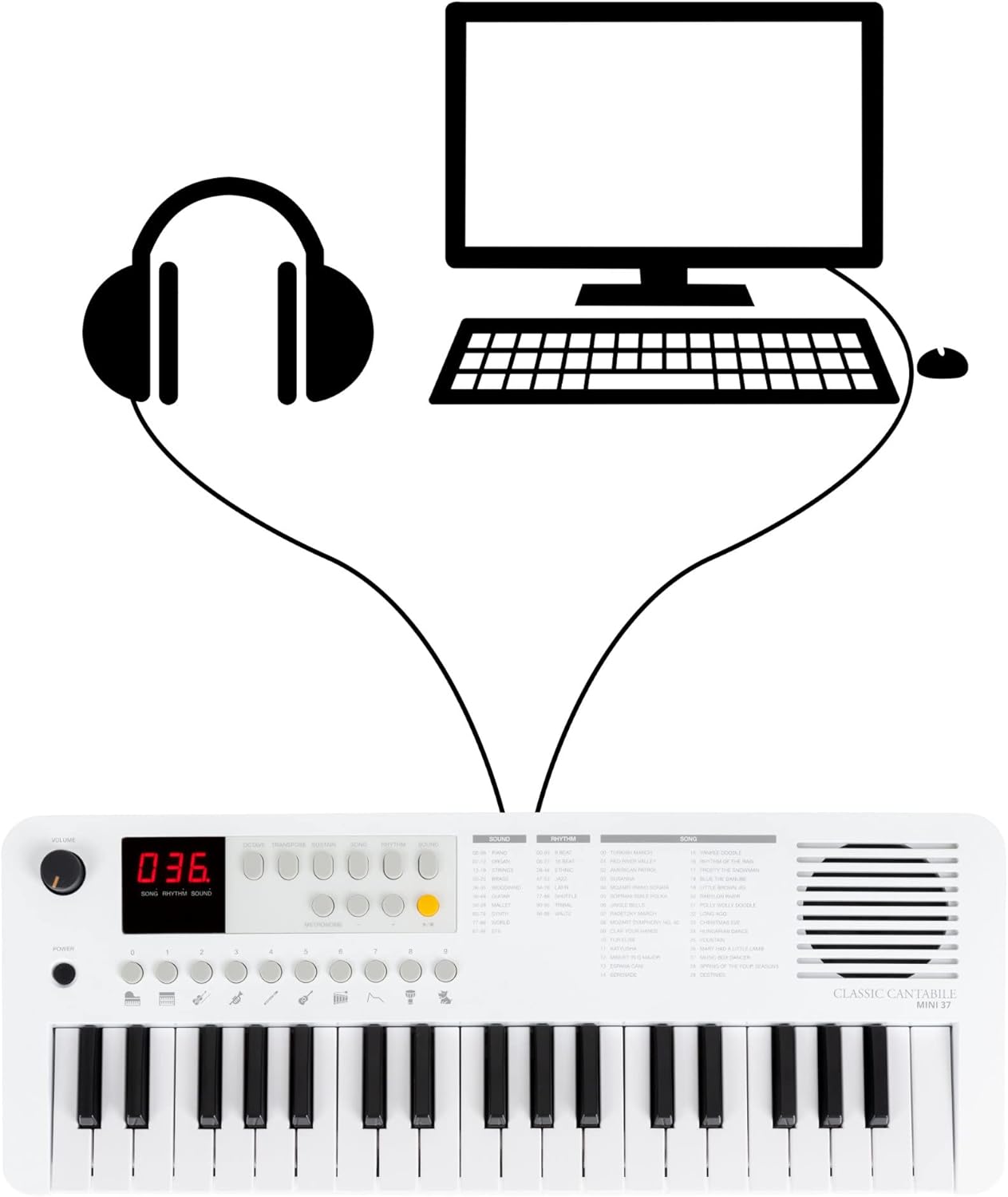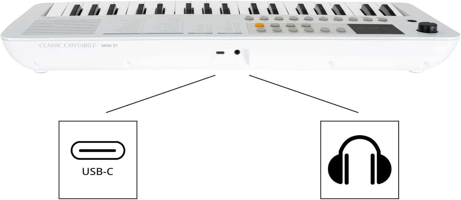 37 mini pulsanti, 100 suoni (divisi in 10 gruppi), 100 ritmi, 30 brani (la voce della melodia può essere disattivata), polifonia 32x, manopola di controllo del volume, alimentazione tramite USB-C (5 V/500 mA) o batterie (4x AA, non incluse), funzione ottava (±1 ottava), funzione trasposizione (±1 semitono), funzione accordatura (±50 centesimi), funzione di sostegno (on/off), metronomo: 30 - 280 bpm, volume regolabile separatamente, 0 - 16 battute, avvio sincronizzato per accompagnamento ritmico, spegnimento automatico (5, 10, 15, 30, 60, 120 min, off), altoparlante interno, collegamenti: USB-C (per alimentazione e USB-MIDI), jack stereo da 3,5 mm (uscita cuffie) Potenza amplificatore: 2 Watt, colore: bianco, incluso cavo da USB-A a USB-C, 1 m di lunghezza, dimensioni (LxPxA): 490 x 185 x 61 mm, peso: 990 g