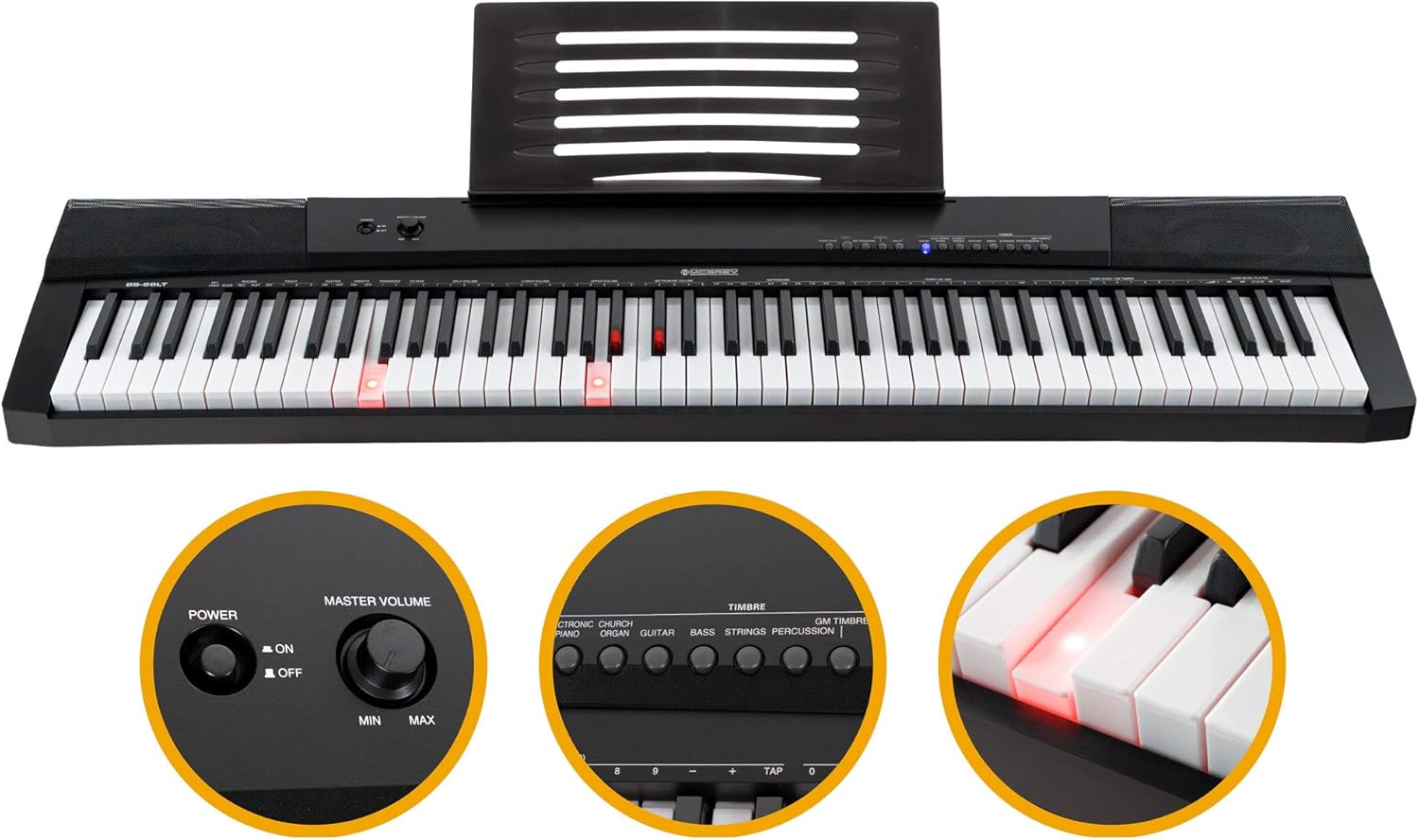 PROGETTATO CHIARAMENTE - Quasi tutte le impostazioni vengono effettuate utilizzando la tastiera. Tutti gli 88 tasti sono dotati di LED rossi che si accendono quando viene premuto il tasto. GRANDE VARIETÀ DI SUONI CON EFFETTI - È possibile selezionare un totale di 146 suoni diversi. Ogni suono può anche essere rifinito con un sostegno o un vibrato. FUNZIONE SPLIT, LAYER E TWINOVA - Queste impostazioni offrono molte sfumature sonore e possibilità per suonare con due persone. LETTORE MULTIMEDIALE INTEGRATO - Il lettore integrato può riprodurre file MP3 da una chiavetta USB direttamente attraverso gli altoparlanti. OPZIONI DI CONNESSIONE - È possibile collegare uno smartphone, un tablet o un altro lettore MP3 alla presa jack per riprodurre i propri brani preferiti. La musica riprodotta viene riprodotta direttamente attraverso gli altoparlanti.