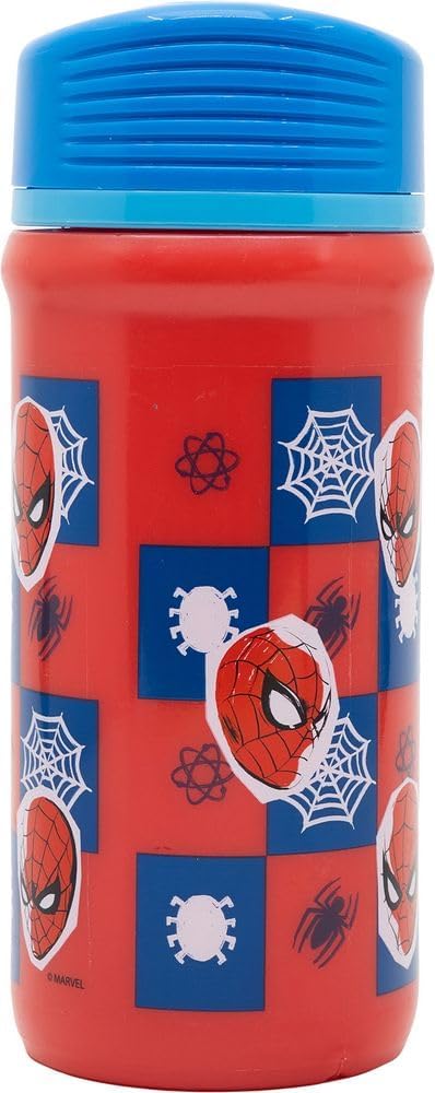 Capacità: 390 ml, adatto ai bambini dai 4 anni in su Materiale: plastica alimentare riciclabile (BPA free), non lavabile in lavastoviglie e non utilizzabile in microonde Borraccia con chiusura antigoccia Altezza: 16 cm, Diametro: 6 cm Facile da pulire, con grafiche Spiderman, licenza ufficiale MARVEL