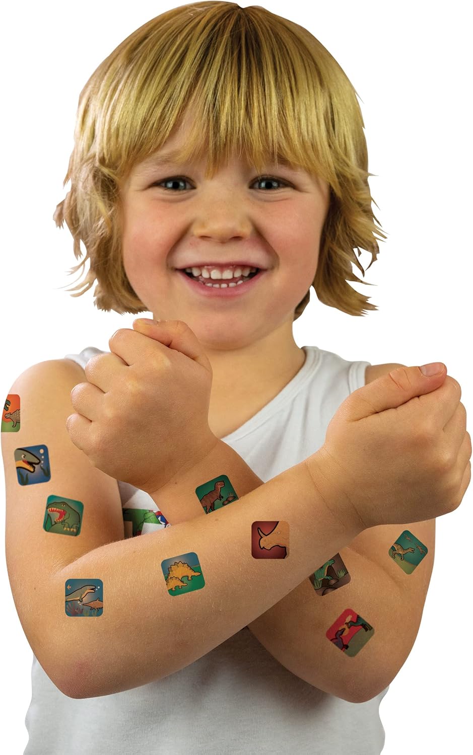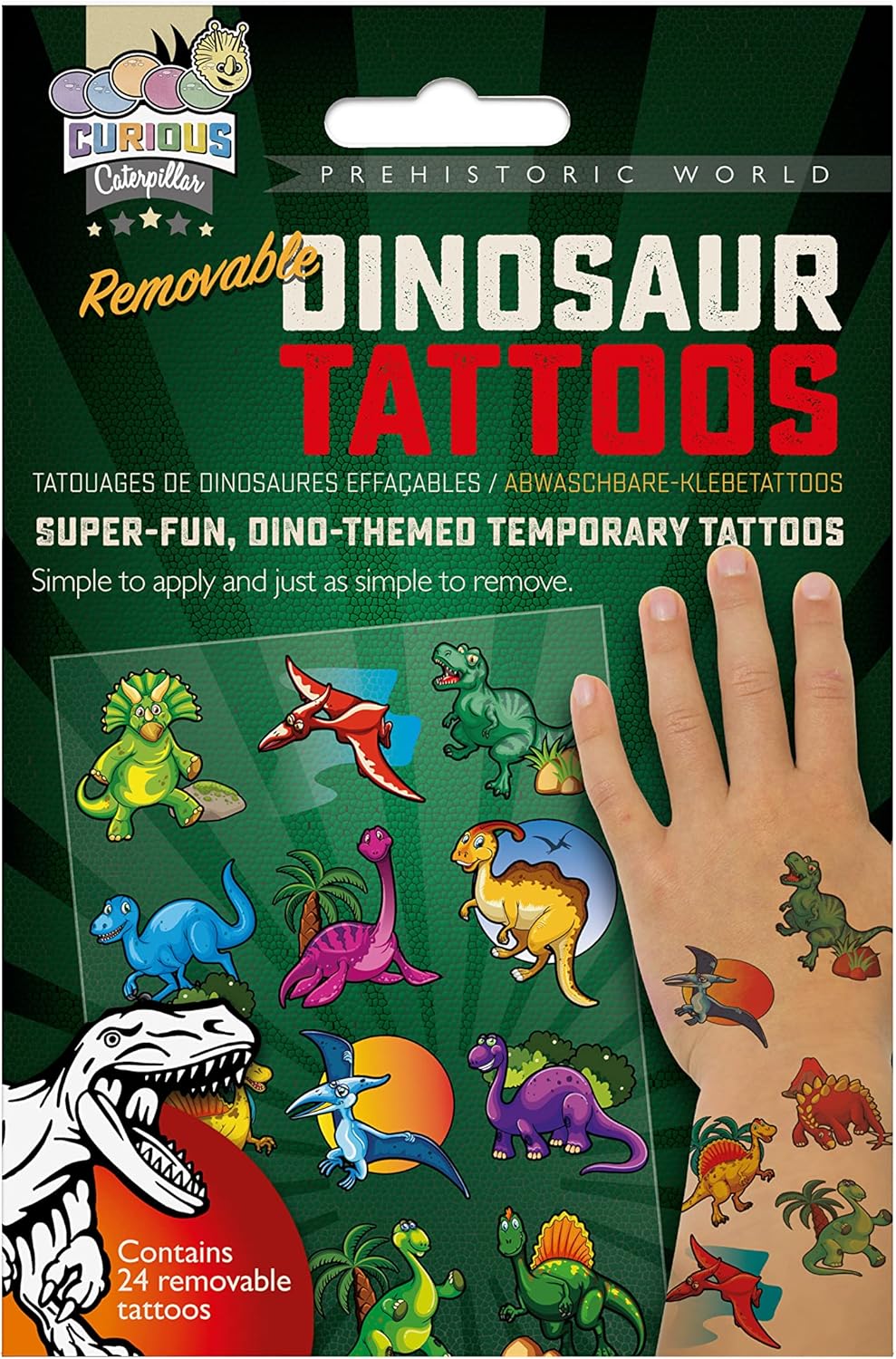 Contiene più 24 tatuaggi temporanei a tema dinosauri atossici Grande divertimento per le feste Lunga e durevole Facile da applicare in 10 secondi con solo acqua Confezione tascabile contenente 24 tatuaggi