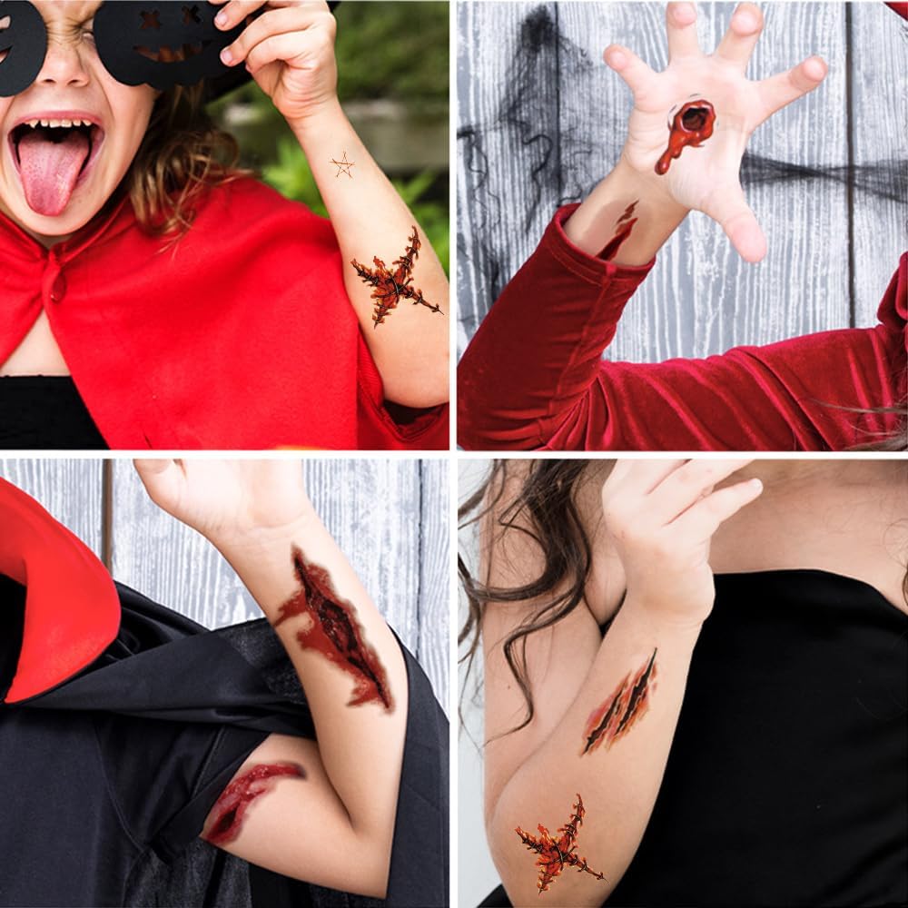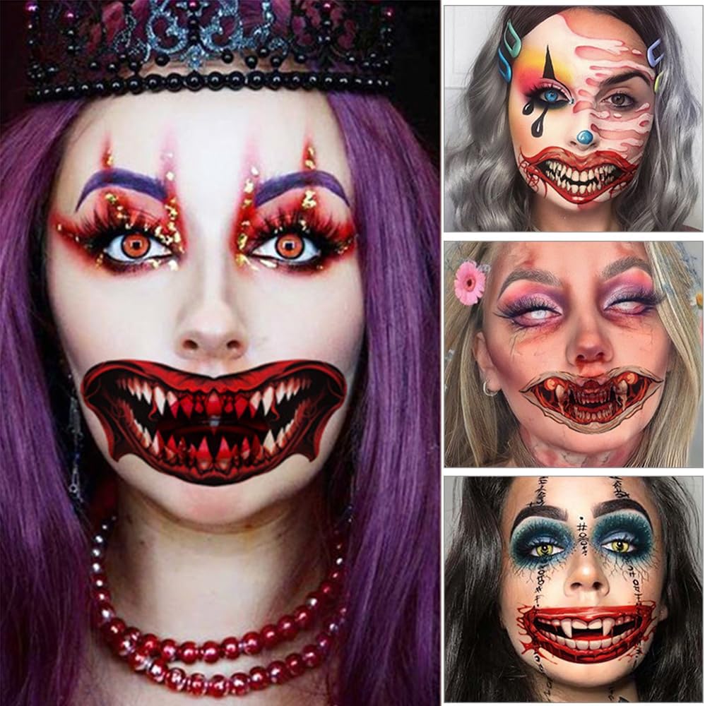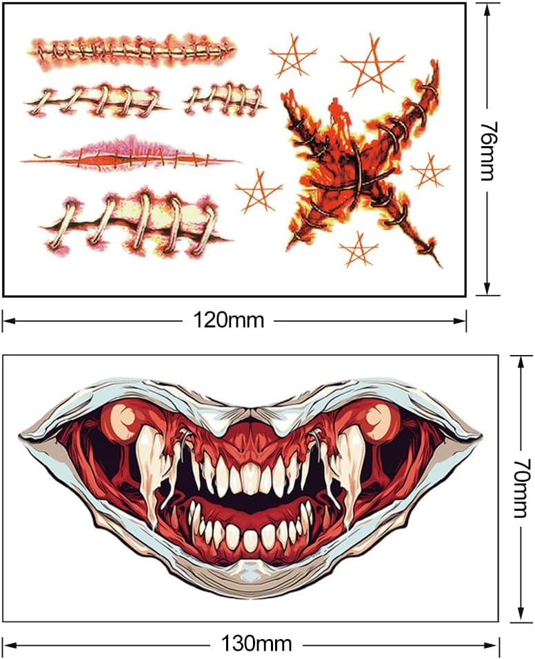 La confezione include: riceverai 10 adesivi per tatuaggi, inclusi 8 adesivi per labbra, 2 adesivi per cicatrici, che possono soddisfare le tue esigenze di travestimento di Halloween e darti un'esperienza di Halloween diversa. Realistico: fai risaltare il tuo look di Halloween con questi tatuaggi vivaci e realistici. Grandi tatuaggi finti possono far sembrare le persone vampiri e zombi durante un cosplay, una festa in maschera o una festa di Halloween. Vari modelli: forniamo adesivi per la bocca in vari modelli e colori, inclusi elementi classici di Halloween come denti da vampiro, bocca da diavolo, bocca da zombi, ecc. Puoi scegliere il modello più adatto a te in base alle tue preferenze personali per creare un trucco di Halloween unico . Facile da usare: basta attaccare delicatamente gli adesivi del tatuaggio sulla pelle pulita e premere per alcuni secondi. Gli adesivi per il viso non cadono facilmente e si adattano molto bene alla pelle, facilitando la creazione del trucco di Halloween. Molteplici occasioni: oltre alle feste di Halloween, questo adesivo per il viso è adatto anche a varie occasioni come feste da ballo, spettacoli teatrali in maschera, feste a tema, ecc. Gli adesivi per la bocca spettrale ti rendono sempre al centro dell'attenzione e confezioni multiple di adesivi per tatuaggi può essere utilizzato con gli amici per creare insieme un'indimenticabile notte di Halloween!