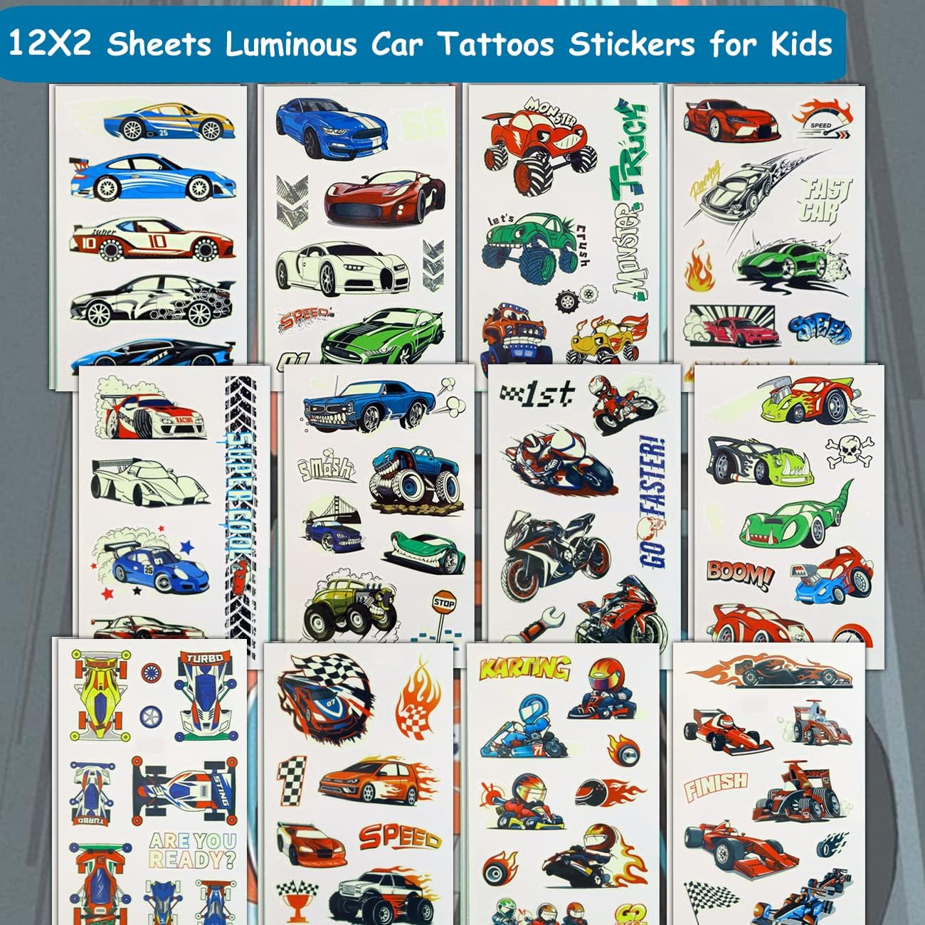 (Se desideri che i tatuaggi brillino più velocemente al buio, l’irradiazione con luce forte sarà una delle soluzioni ideali, come la luce LED del telefono)⚡Set Include Oltre 180 Stili di Tatuaggi a Tema Auto da Corsa — Tatuaggi temporanei super cool e luminosi, impermeabili. Questo set di adesivi per tatuaggi contiene tanti elementi divertenti che piaceranno ai bambini (Auto da corsa, Monster truck, Karting, …). Aggiungi un tocco unico e divertente a una festa o evento per bambini con i tatuaggi Charlent. ⚡24 Fogli di Tatuaggi Luminosi per Bambini — 180 tatuaggi luminosi totali su 24 fogli, facilmente inclusi in una busta regalo per una festa di compleanno a tema auto da corsa. Facili da condividere: anche in una festa con molti invitati, ogni bambino può avere un tatuaggio diverso. Questi adorabili tatuaggi terranno occupati te, i tuoi bambini e i loro amici per un po’. Perfetti per incontri di gioco, feste o giornate di pioggia. ⚡Tatuaggi a Tema Glow Party per Bambini — I nostri tatuaggi a tema auto da corsa sono sicuri per i tuoi piccoli, realizzati con materiali di qualità standard e carta ecologica. Questi sono tatuaggi temporanei removibili! Con questi tatuaggi finti, i bambini possono decorarsi con disegni colorati che si lavano via facilmente o si staccano successivamente. Divertiti con la nostra collezione di tatuaggi temporanei removibili per bambini. ⚡Qualità Premium, Impermeabili e Resistenti al Sudore — Questi tatuaggi unici durano tipicamente dai 3 ai 6 giorni. Possono essere rimossi con olio, struccante o strofinando. Sicuri da indossare in spiaggia, sotto la doccia o in piscina. ⚡Tatuaggi a Tema Auto da Corsa per Tutte le Occasioni — Questi fantastici tatuaggi possono essere utilizzati in varie occasioni, come forniture per feste di compleanno, decorazioni per feste, bomboniere a tema auto da corsa, sacchetti per feste, decorazioni fai-da-te, vacanze estive, piscina e spiaggia, o come regalo per bambini e premi. I tatuaggi temporanei per bambini sono i migliori favori per le feste e riempitivi per le buste regalo in ogni tipo di celebrazione!