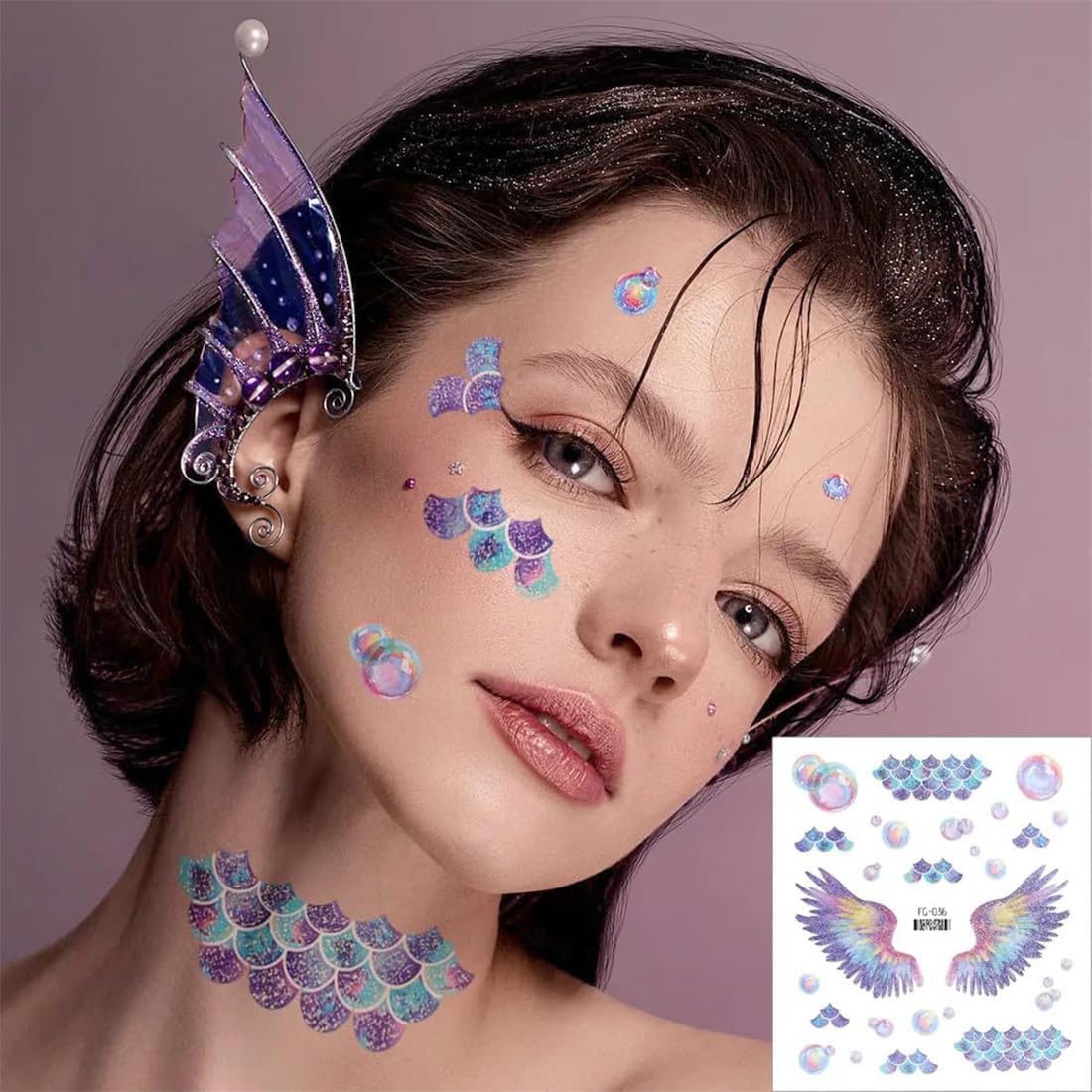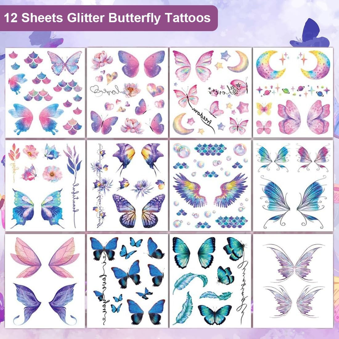 Un totale di 12 tatuaggi temporanei con motivi diversi: farfalle, ali d'angelo, lune, fiori e altro ancora. Ogni tatuaggio adesivo brilla alla luce del sole, regalando un effetto scintillante. Realizzati in carta di alta qualità con processo di stampa a trasferimento d'acqua per un utilizzo impermeabile, resistente al sudore e delicato sulla pelle. Adatto per viso, mani e corpo, ideale per feste, festival, cosplay, carnevali, mascherate e altro ancora. Istruzioni semplici: ritagliare, applicare e lasciare asciugare naturalmente per 30 secondi con un panno umido o un tovagliolo di carta bagnato.