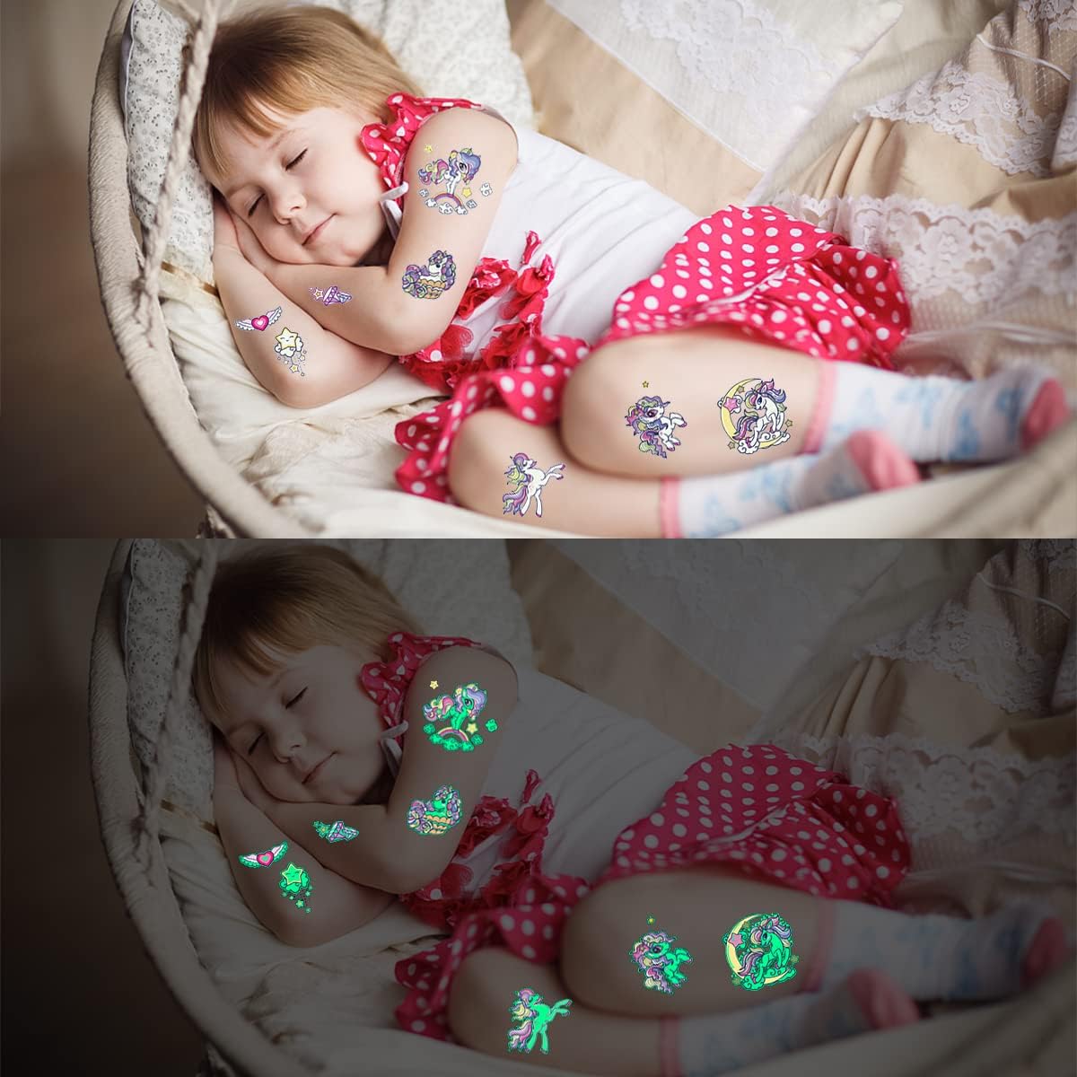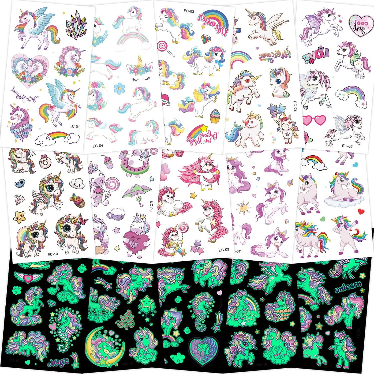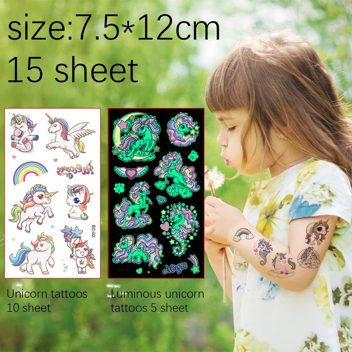 Splendidi motivi e graziosi disegni: 15 adesivi per tatuaggi delicati sulla pelle, tra cui 5 adesivi che si illuminano al buio, set di adesivi per tatuaggi con unicorno composto da oltre 150 disegni di unicorno, arcobaleni, stelle, cuori e altro, i bambini saranno affascinati e stupiti da questi adorabili motivi Regalo per ragazze: il tatuaggio adesivo può essere utilizzato come regalo creativo per ragazze, regali di compleanno, regali di compleanno, regali ed è perfetto anche per l'artigianato dei bambini e per il calendario dell'Avvento. L'accessorio perfetto per un costume da unicorno per bambini Ampia gamma di utilizzi: i nostri adesivi per tatuaggi con unicorno possono essere applicati su viso, braccia, gambe, vita e schiena e si abbinano perfettamente ai costumi da unicorno, perfetti per feste di unicorno, decorazioni di compleanno con unicorno, calendario dell'Avvento, Halloween, Natale, regali di Pasqua, progetti di feste divertenti, eventi di gioco, ecc Tatuaggi luminosi: la funzione del luminoso ti rende unico ed eccezionale nella folla, che sarà un successo e renderà la festa più divertente. Suggerimenti: per massimizzare l'effetto luminoso dei tatuaggi, si consiglia di illuminare questi tatuaggi con qualche minuto di anticipo sotto la lampada o la luce del sole Alta qualità e sicurezza: realizzato con materiali di alta qualità ed ecologici, sicuri e non tossici, facili da staccare, non lasciano residui. 100% impermeabile