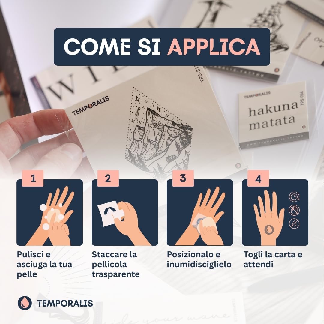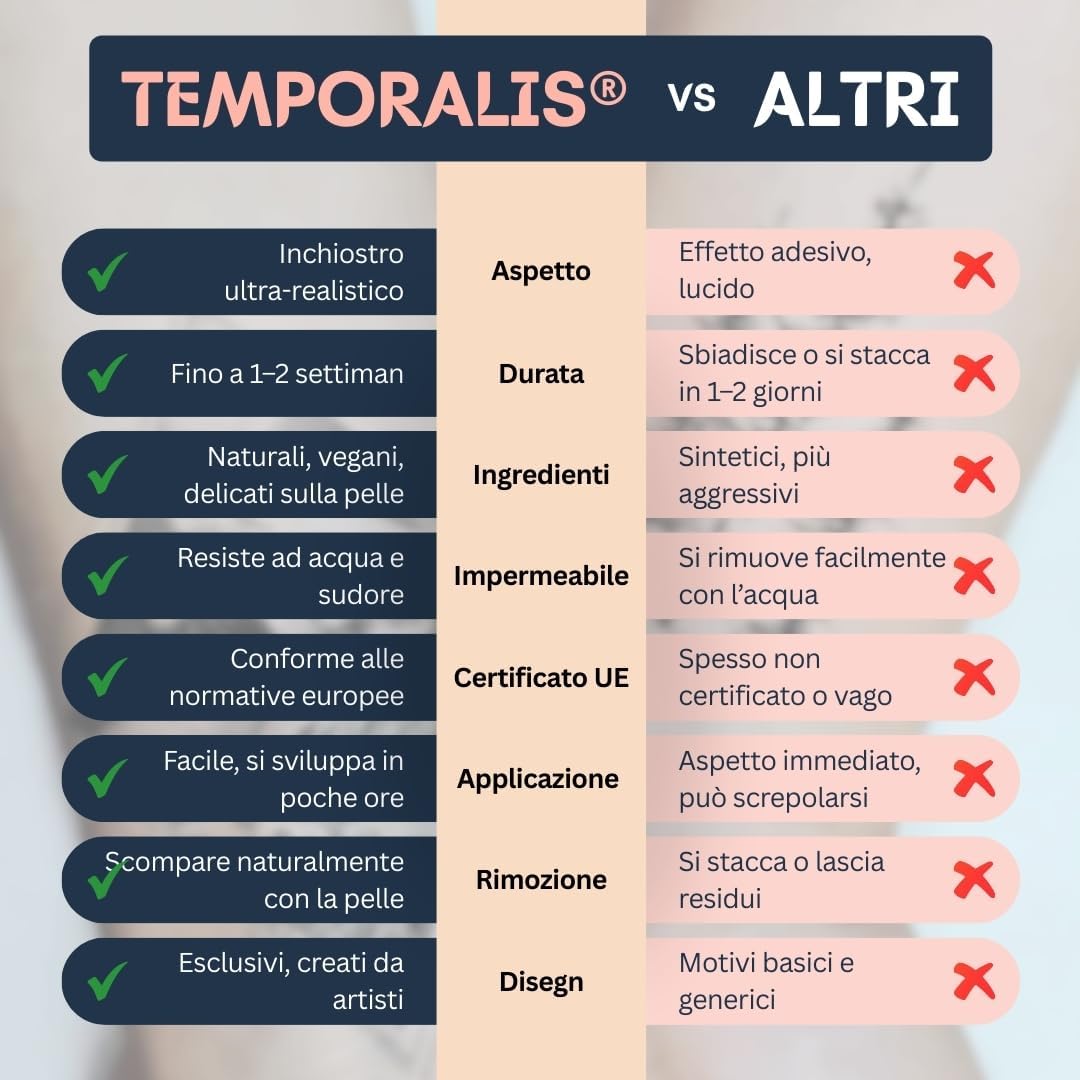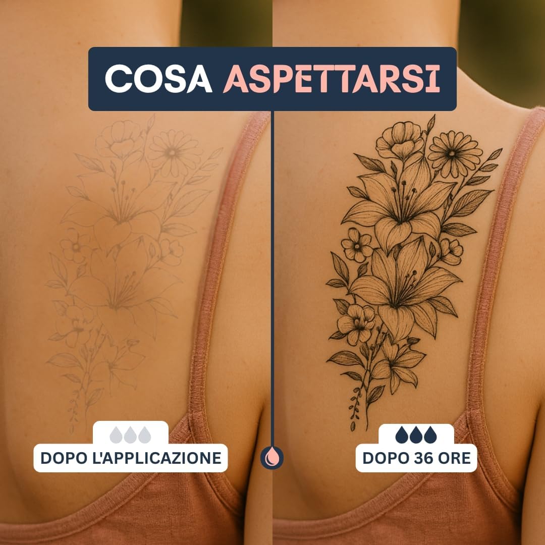 💡 TATUAGGIO TEMPORANEO REALISTICO CHE PENETRA NELLA PELLE: I nostri tattoo temporanei non sono semplici tatuaggi finti: l’inchiostro penetra leggermente nello strato superficiale della pelle, offrendo un effetto naturale, ultra realistico e una durata fino a 2 settimane. Ideale per chi cerca tatuaggi temporanei adulti, uomo o donna. 💧 WATERPROOF E A PROVA DI VITA QUOTIDIANA: I nostri fake tattoos resistono a tutto: docce, sport, mare. Non si staccano facilmente e si rimuovono gradualmente con il naturale ricambio della pelle. Ottimi anche come tatuaggi finti collo o per chi cerca tatuaggi mare fuori. 🌿 FORMULA NATURALE, LOOK PROFESSIONALE: Dimentica i semplici tatoo stickers: i nostri tatuaggi trasferelli sono realizzati con inchiostro a base vegetale per un risultato elegante e senza effetto lucido. Adatti a chi cerca tatuaggi finti grandi, tatuaggi realistici adulti o tatuaggi temporanei frasi con stile. ✌️ FACILI DA USARE, PERFETTI PER TUTTI: Che tu stia cercando tatuaggi temporanei uomo piccoli, tatuaggi finti donna o tatuaggi carnevale, l’applicazione è semplice: bastano 1-2 minuti. Il tatuaggio si sviluppa in poche ore e dura fino a 14 giorni. Ideale anche come swift tattoo o per chi vuole provare un tattoo senza impegno. 🇪🇺 CERTIFICATI UE, SICURI E VEGANI: Tutti i nostri tatuaggi temporanei sono cosmetici certificati UE. A base di ingredienti vegetali, rispettano la pelle e sono privi di sostanze nocive. Perfetti per chi cerca tatuaggi semipermanenti o jagua tattoo con standard di qualità elevati.