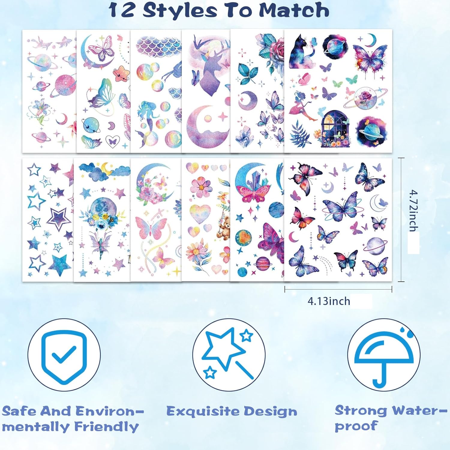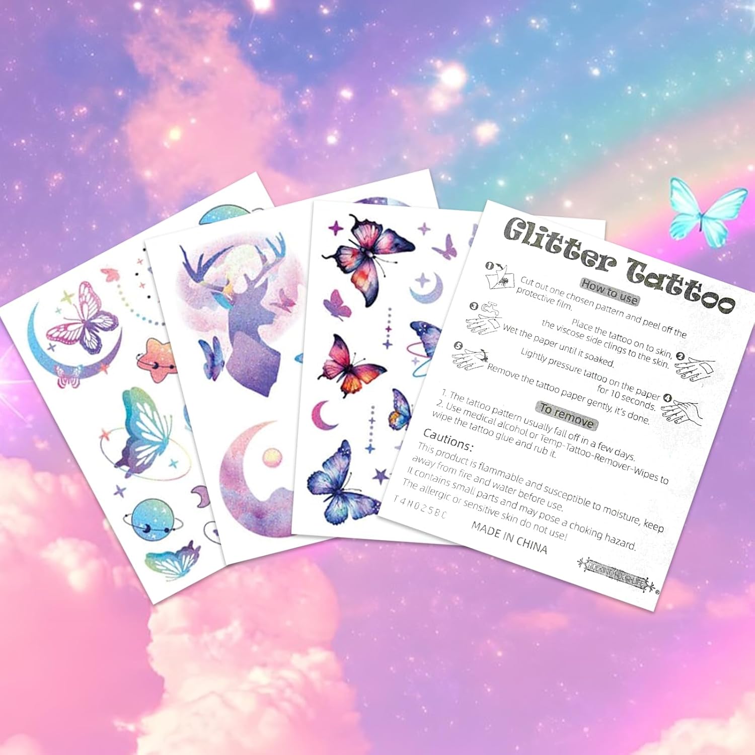 🤩Stili Ricchi: contiene 12 adesivi per tatuaggi flash accuratamente progettati, che coprono una varietà di stili come dolce e carino e misterioso e sognante. Puoi abbinarli come preferisci per soddisfare tutte le fantasie romantiche delle ragazze. 🦋Tatuaggi Adesivi Imperdibili per le Feste: tatuaggi adesivi colorati a tema pensati appositamente per le ragazze, che integrano sapientemente elementi popolari, sono unici e accattivanti e rappresentano un momento clou indispensabile della festa, accendendo immediatamente l'atmosfera. ✨Effetto Glitterato: l'effetto glitterato creato dalla speciale lavorazione artigianale brilla in modo affascinante in qualsiasi ambiente luminoso, distinguendosi dalla massa e mostrando la tua personalità e il tuo fascino. 💖Materiale Sicuro: realizzato con materiali di alta qualità, ha una viscosità moderata, una forte impermeabilità, motivi trasparenti, può mantenere un effetto duraturo per 1-7 giorni, non è irritante e può essere utilizzato con sicurezza sulla pelle sensibile. ✅Comodo e Facile da Usare: grazie alla tecnologia di trasferimento dell'acqua, è necessaria solo una piccola quantità di acqua per trasferire il motivo dalla carta di base alla pelle. Inoltre è facile da rimuovere senza lasciare segni o danneggiare la pelle.