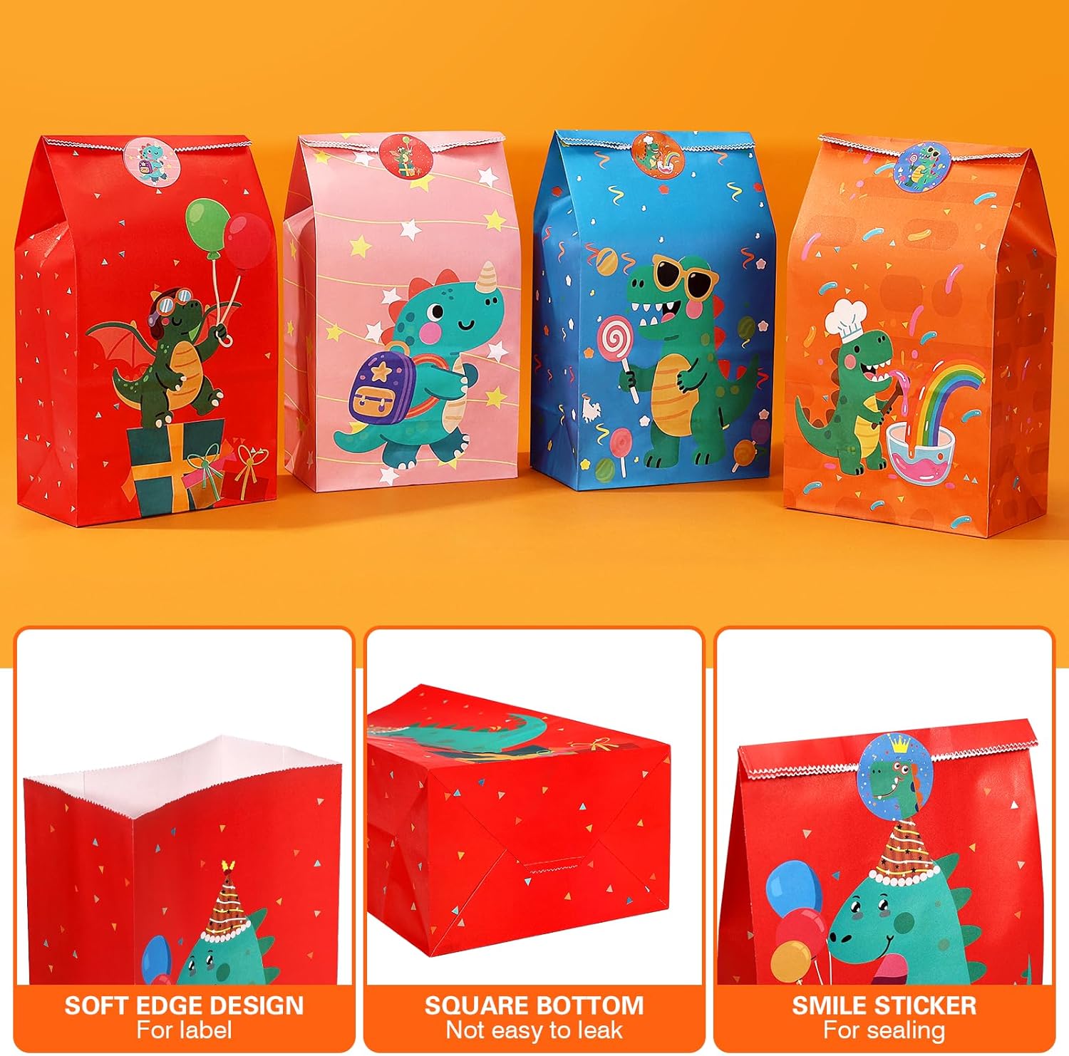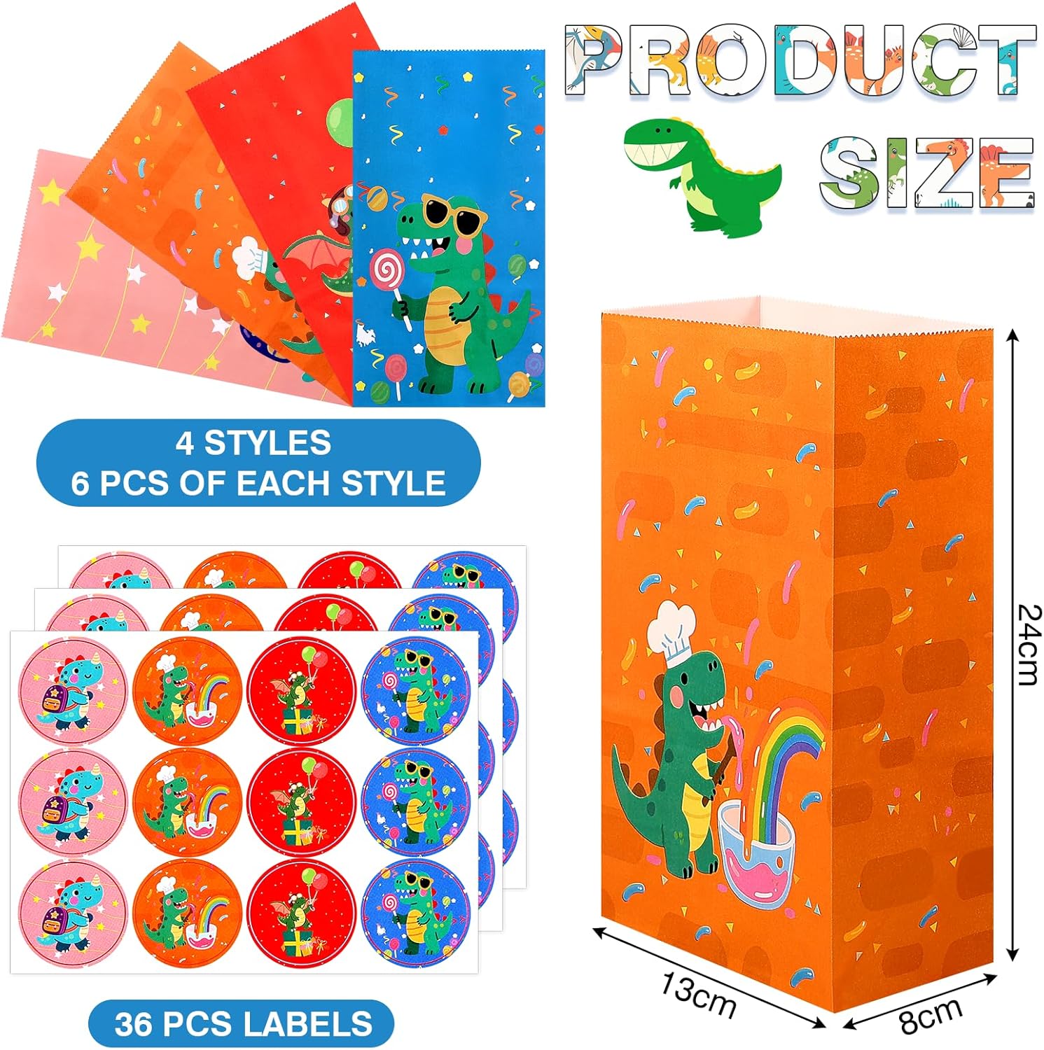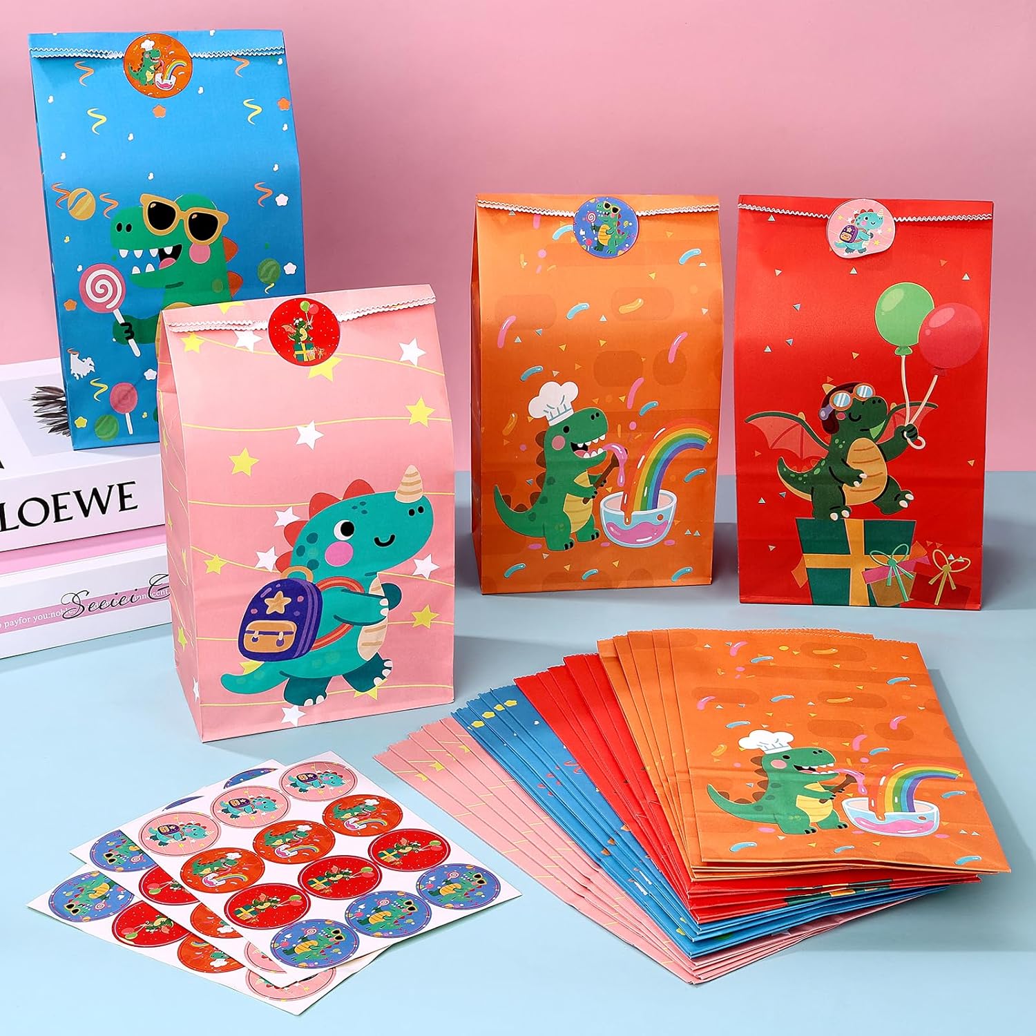 SACCHETTI DI CARTA CON DINOSAURI PER GRANDI AVVENTURE: Questo set comprende 24 sacchetti di carta con dinosauri adatti ai bambini con affascinanti motivi preistorici. Le illustrazioni dettagliate risvegliano la gioia della scoperta e sono perfette come accessori per feste sostenibili. SACCHETTI PER CARAMELLE COLORATI CON STANDARD DI SICUREZZA: Realizzati in carta kraft per alimenti, questi sacchetti colorati sono ideali per conservare dolci o piccoli dolcetti. Questo rende ogni sorpresa un piacere sicuro. IDEALI PER COMPLEANNI INDIMENTICABILI DEI BAMBINI: Sia come regali che come confezioni regalo, questi sacchetti sono il punto forte di ogni festa di compleanno per bambini. La pratica dimensione (24x13x8 cm) offre spazio per giocattoli, biscotti o dolcetti e garantisce occhi luminosi. DECORAZIONI ESCLUSIVE DI DINOSAURI: Include 36 adesivi con motivi individuali per sigillare e personalizzare le borse. Gli adesivi con dinosauri realizzati con cura completano il tema e incoraggiano la creatività dei piccoli ospiti. VARIETÀ PER OGNI OCCASIONE: Può essere utilizzato non solo per feste di compleanno, ma anche per feste scolastiche, feste di Halloween o Natale. Un must versatile per chi cerca soluzioni pratiche e rispettose dell'ambiente!