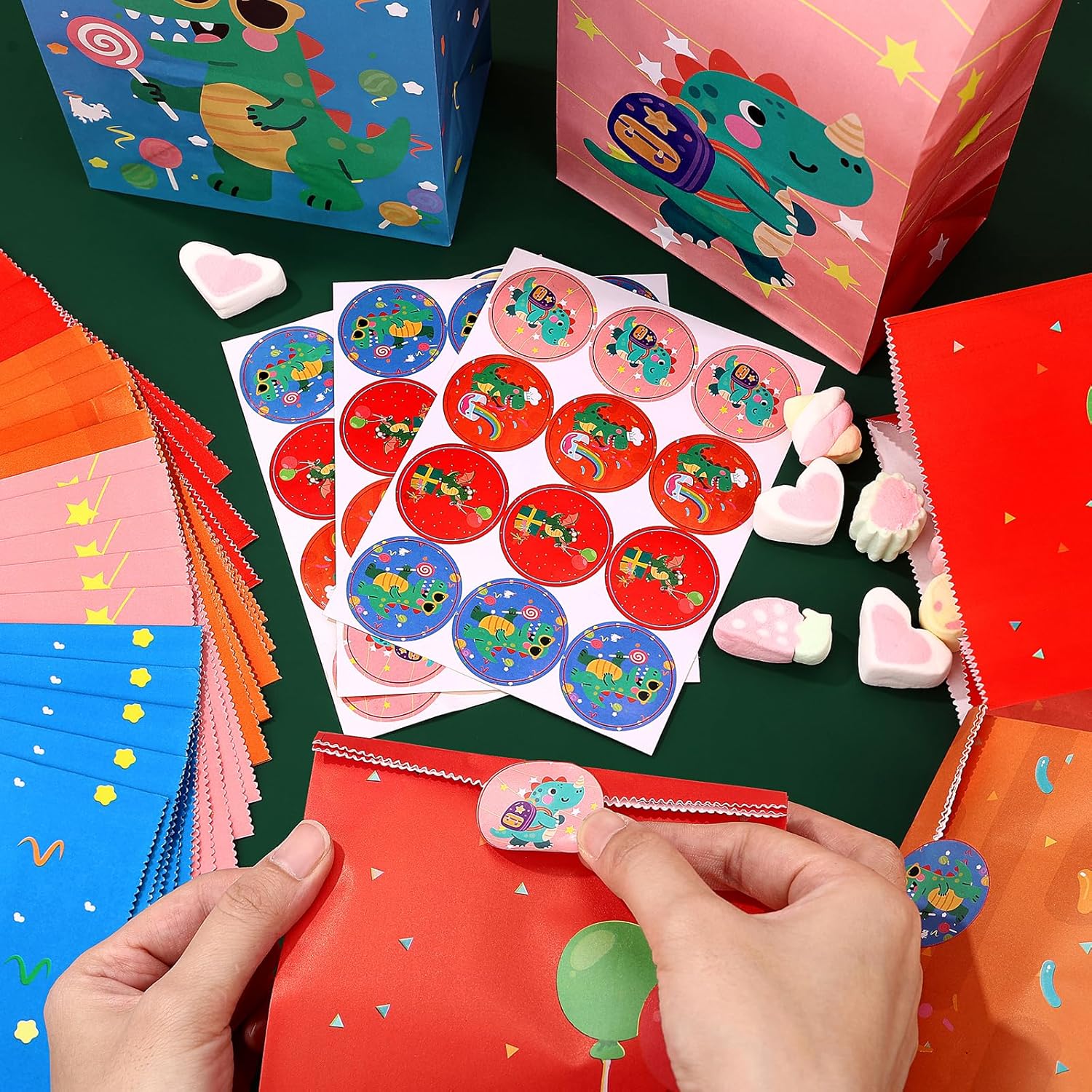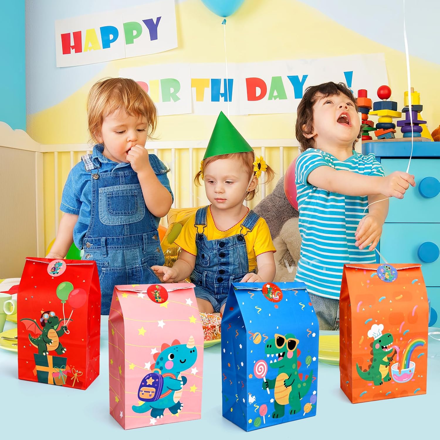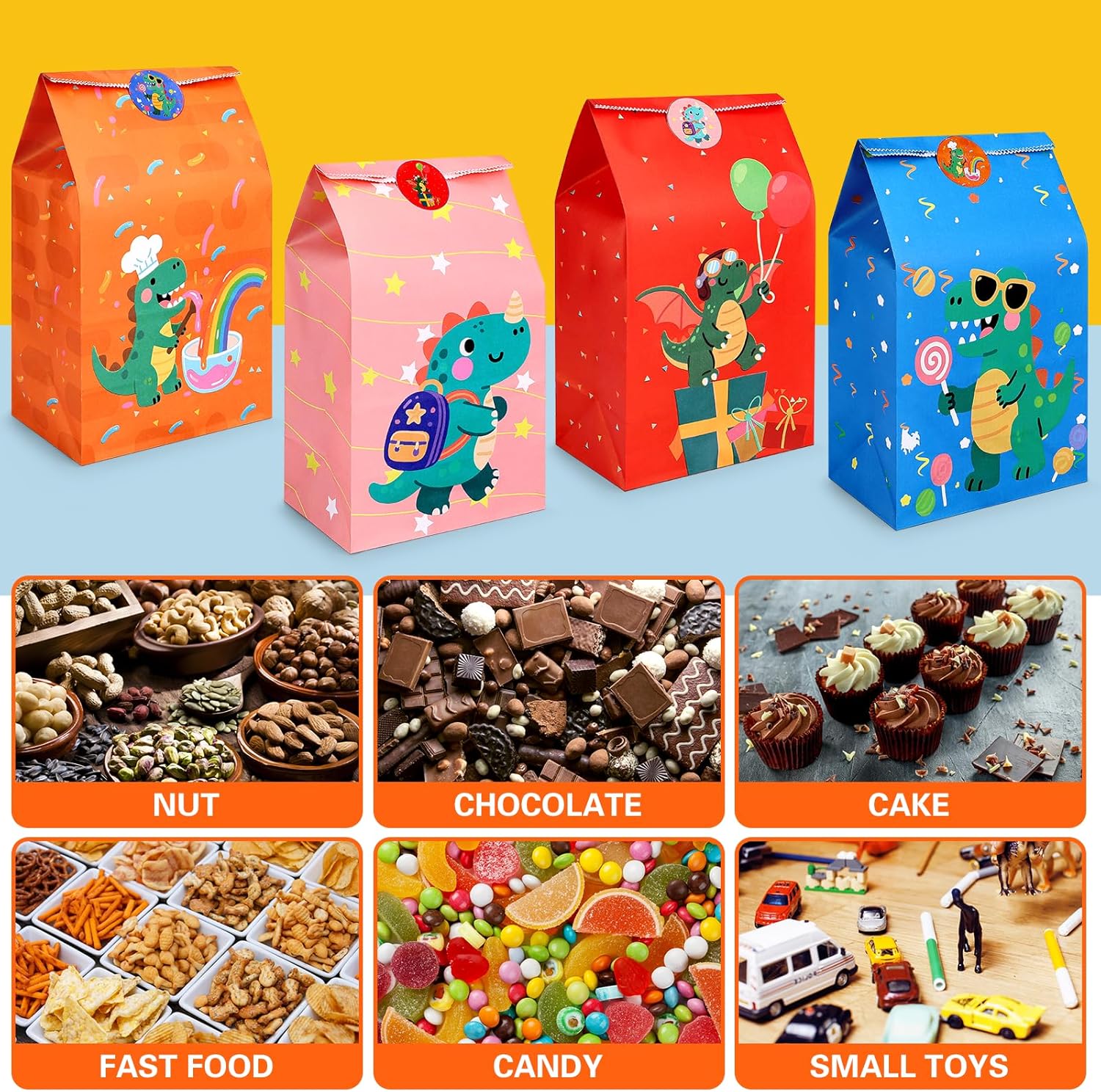 SACCHETTI DI CARTA CON DINOSAURI PER GRANDI AVVENTURE: Questo set comprende 24 sacchetti di carta con dinosauri adatti ai bambini con affascinanti motivi preistorici. Le illustrazioni dettagliate risvegliano la gioia della scoperta e sono perfette come accessori per feste sostenibili. SACCHETTI PER CARAMELLE COLORATI CON STANDARD DI SICUREZZA: Realizzati in carta kraft per alimenti, questi sacchetti colorati sono ideali per conservare dolci o piccoli dolcetti. Questo rende ogni sorpresa un piacere sicuro. IDEALI PER COMPLEANNI INDIMENTICABILI DEI BAMBINI: Sia come regali che come confezioni regalo, questi sacchetti sono il punto forte di ogni festa di compleanno per bambini. La pratica dimensione (24x13x8 cm) offre spazio per giocattoli, biscotti o dolcetti e garantisce occhi luminosi. DECORAZIONI ESCLUSIVE DI DINOSAURI: Include 36 adesivi con motivi individuali per sigillare e personalizzare le borse. Gli adesivi con dinosauri realizzati con cura completano il tema e incoraggiano la creatività dei piccoli ospiti. VARIETÀ PER OGNI OCCASIONE: Può essere utilizzato non solo per feste di compleanno, ma anche per feste scolastiche, feste di Halloween o Natale. Un must versatile per chi cerca soluzioni pratiche e rispettose dell'ambiente!