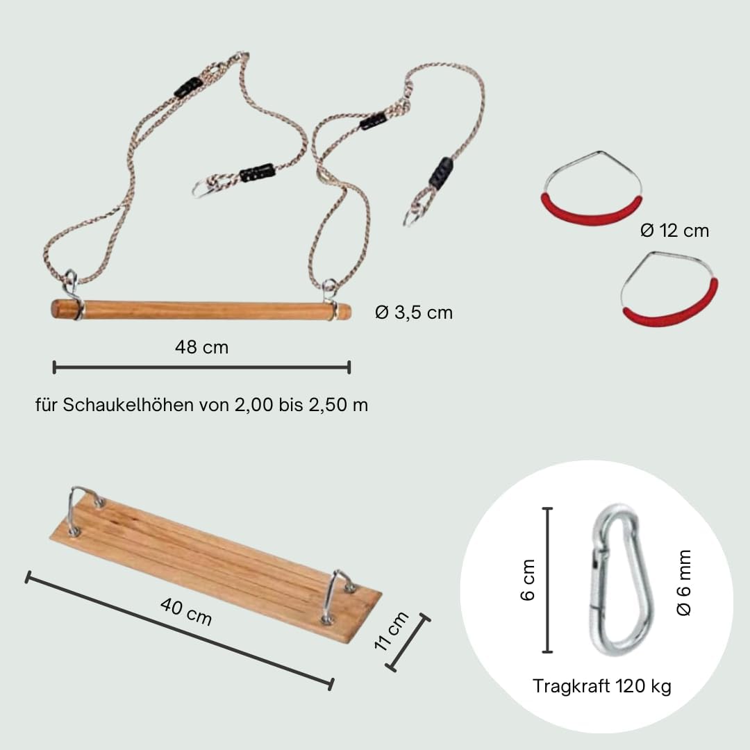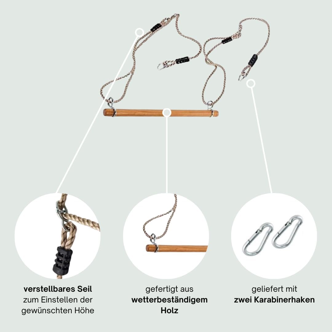 Set: attrezzatura da ginnastica composta da un'altalena trapezoidale e un'altalena in legno, corde regolabili in altezza con moschettoni e due anelli da ginnastica in metallo con manici in plastica rossa. Flessibile: grazie alle corde regolabili in altezza fornite, l'altezza dell'altalena può essere facilmente regolata per l'oscillazione o la ginnastica. Per interni ed esterni: questa altalena trapezoidale è resistente alle intemperie e può essere utilizzata sia nella cameretta dei bambini che in giardino, per divertirsi a lungo sia all'interno che all'esterno. Montaggio: I moschettoni inclusi consentono un montaggio facile e veloce dell'altalena trapezoidale, così il tuo bambino potrà iniziare subito a fare ginnastica. Sviluppo: l'altalena e la ginnastica promuovono in modo divertente l'abilità motoria, lo sviluppo della forza e la coordinazione del bambino.