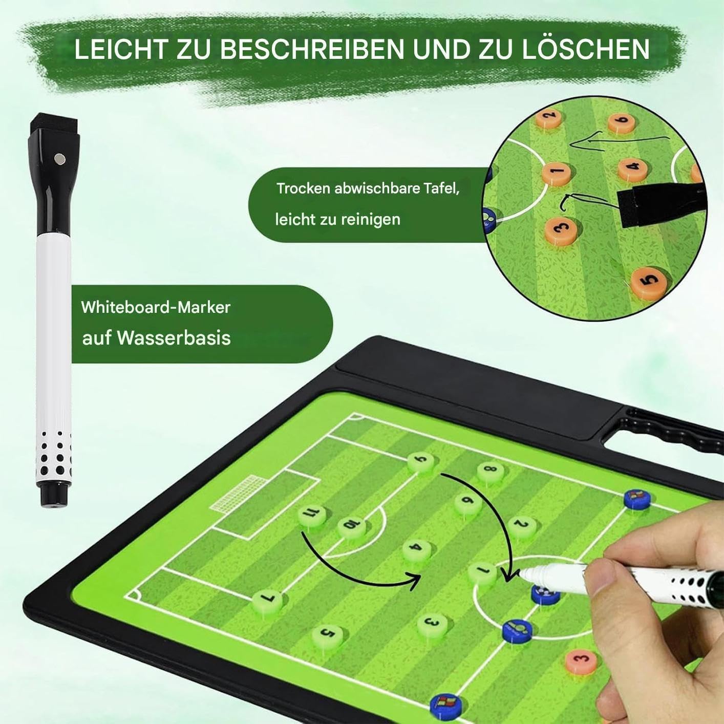 Supporto di allenamento completo: la tavola da allenamento magnetica da calcio fornisce una chiara visualizzazione dei movimenti del giocatore attraverso diagrammi di campo doppio. Aiuta gli utenti a catturare efficacemente il posizionamento e i percorsi, ed è adatto per layout a campo pieno e semicampo. La maneggevolezza intuitiva facilita l'apprendimento delle procedure tattiche e migliora la qualità dell'allenamento per le squadre di calcio di tutte le età. Leggibile e liscia: progettata per cancellare in modo pulito senza sbavature, questa lavagna tattica da calcio supporta modifiche chiare e organizzate. Migliora l'apprendimento grazie alla precisione grazie alle sue linee luminose e di facile lettura e alla scrittura liscia, che lo rendono ideale per rapide regolazioni. La facilità d'uso favorisce momenti di coaching efficienti e consente correzioni immediate durante l'allenamento o il gioco. Le prestazioni affidabili li rendono una scelta pratica per Aiuto di coaching migliorato: questa tattica da calcio è dotata di un doppio set di icone magnetiche e di una penna ergonomica con superficie di presa, che garantisce un'implementazione senza soluzione di continuità delle strategie. Consente agli allenatori di concentrarsi completamente sull"aumento delle prestazioni della squadra attraverso una chiara comunicazione visiva rappresentando in modo efficiente formazioni e mosse. Gli elementi magnetici e gli accessori facili da usare supportano un Coac liquido Affidabilità in tutte le condizioni atmosferiche: con un design resistente al sudore e alla pioggia, la lavagna tattica da calcio offre un uso affidabile stagione dopo stagione; la sua struttura robusta resiste anche a un uso quotidiano impegnativo e la superficie facile da pulire garantisce sempre una visualizzazione chiara, rendendola un compagno ideale per le attività all'aperto. Ampia applicabilità: questa tavola magnetica per coaching per calcio funge da aiuto essenziale per pianificare le formazioni e il cambiamento e offre molteplici possibilità di applicazione nei giochi e negli allenamenti. Consente agli allenatori di rappresentare visivamente le tattiche e ottimizzare il coordinamento del team in, aumentando l'efficacia in diverse situazioni. La facilità d'uso e adattabilità lo rendono ideale per l'uso regolare in ambienti mutevoli.