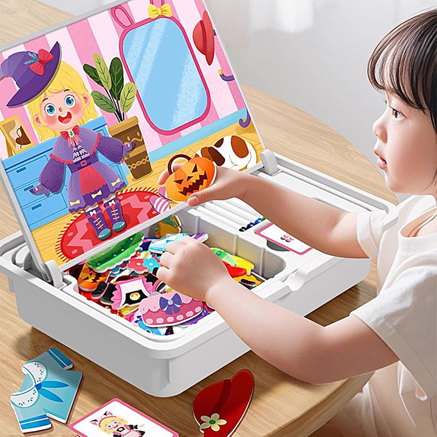 Design Forme: Incorpora le del design e forme utilizzando schemi di colore stratificati, promuove le capacità di abbinamento cromatico e l'interesse immaginativo mentre i bambini interagiscono con i pezzi del puzzle in ambienti di gioco educativo Superfici in Legno per Pelli Sensibili: Le superfici levigate e di imperfezioni assicurano un contatto delicato sulla pelle, riducendo rischi di irritazione per bambini e adulti durante lunghe sessioni di gioco a casa o in ambienti educativi con puzzle magnetici avvincenti Set da viaggio compatto: Questo giocattolo magnetico di bambole in legno unisce portabilità e funzionalità, con adattabilità ai sedili posteriori 'auto e facilità di conservazione in viaggio, assicurando momenti di gioco senza interruzioni durante gli spostamenti in famiglia Miglioramento Abilità Spaziali: La lavagna magnetica offre sfide di vestizione e set di carte tematici che stimolano la creatività e affinano la coordinazione occhio-mano, integrando perfettamente lo sviluppo a percezione spaziale in esperienze di gioco educative e divertenti. Divertimento Interattivo: Il puzzle magnetico offre un esperienza di gioco coinvolgente che promuove l interazione sociale e ispira processi di pensiero creativo, permettendo di godere momenti di qualità da soli o con i mentre si coltivano connessioni più profonde in modo naturale