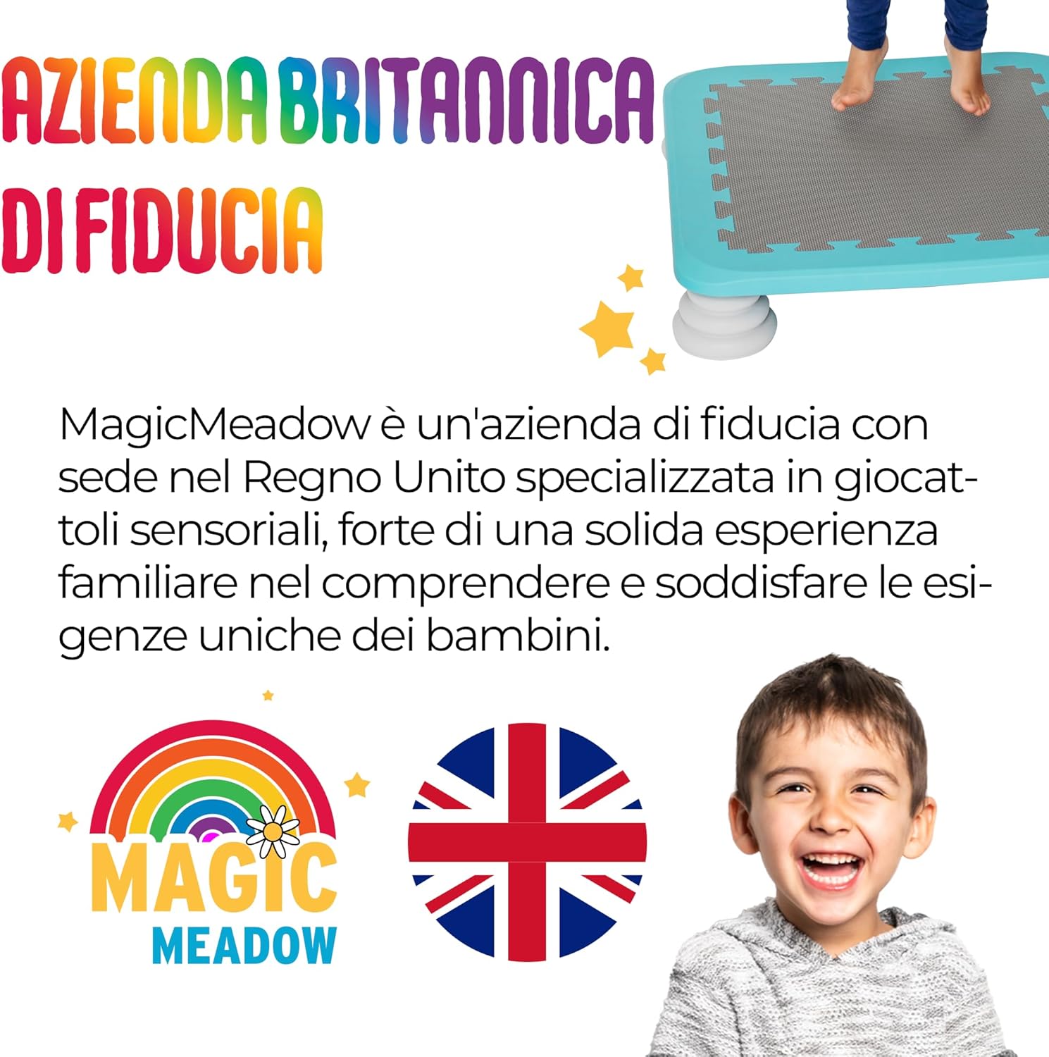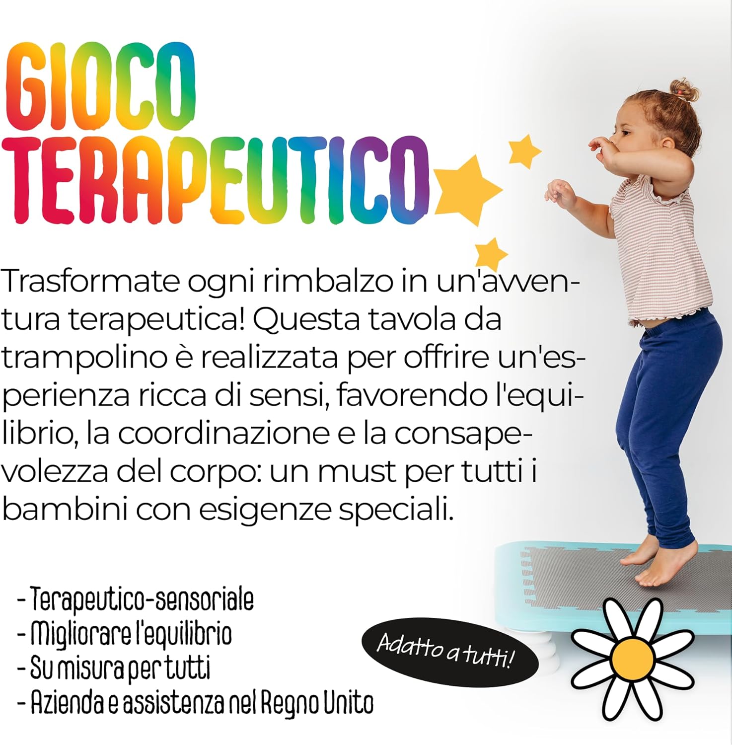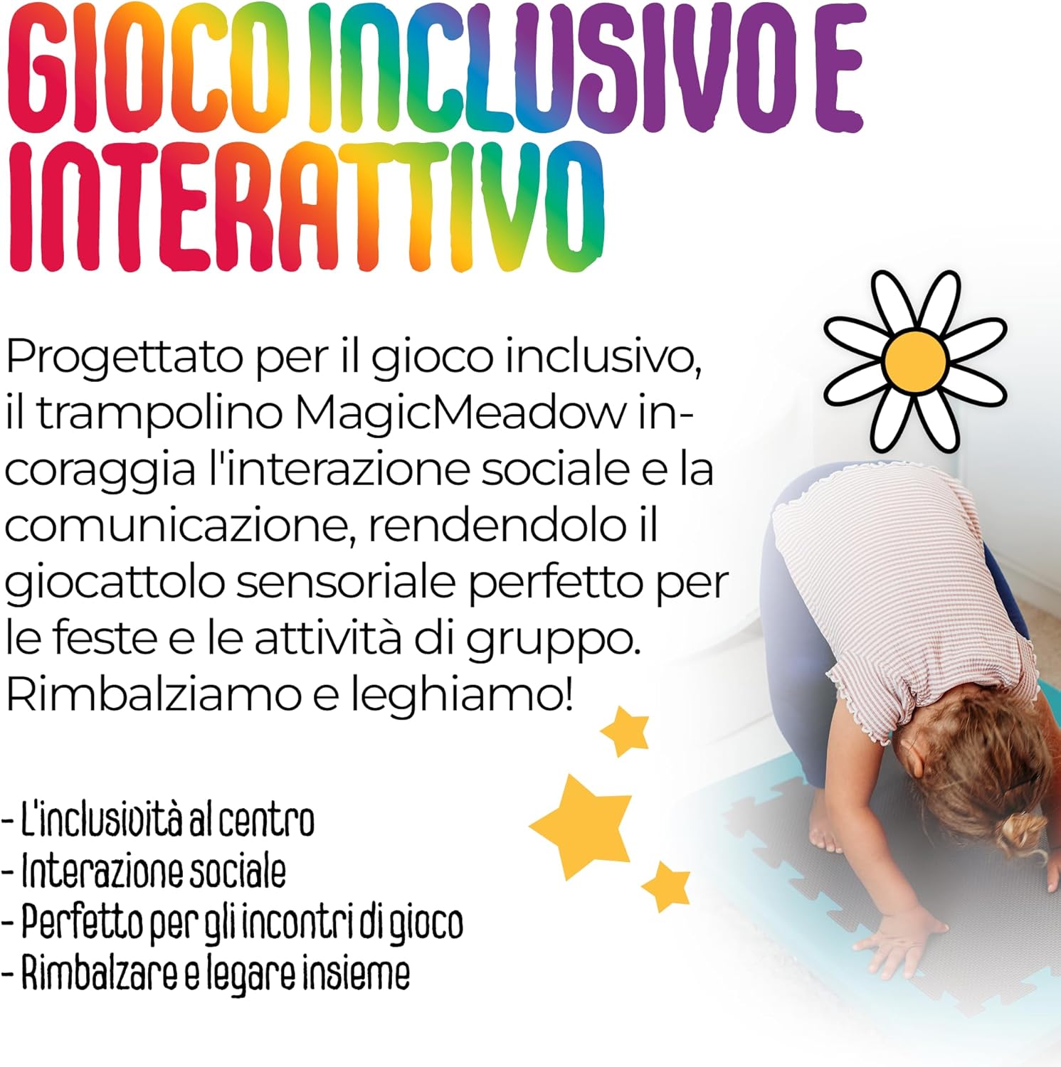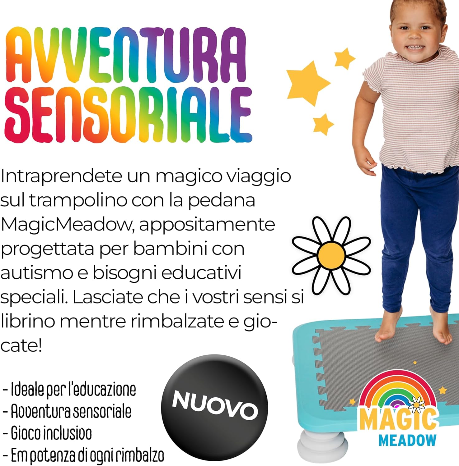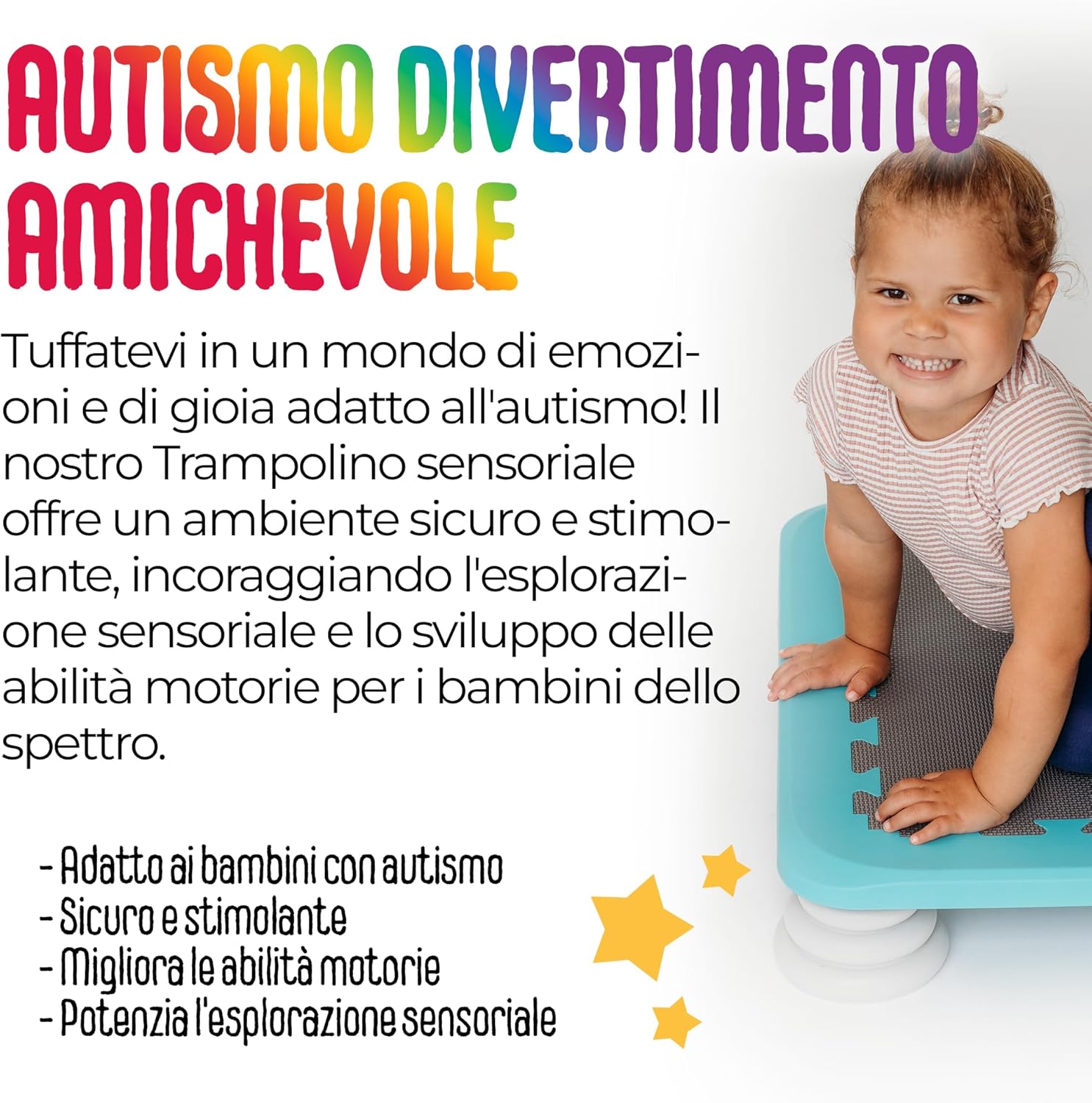 AVVENTURA SENSORIALE: intraprendi un magico viaggio in trampolino con il pannello MagicMeadow Trampoline, appositamente progettato per i bambini con autismo e bisogni educativi speciali. Lascia che i tuoi sensi si sparino mentre rimbalzi e giochi. DIVERTIMENTO ADATTATO ALL'AUTISMO: Immergiti in un mondo di eccitazione e gioia adattato all'autismo. Il nostro trampolino sensoriale fornisce un ambiente sicuro e stimolante, incoraggiando l'esplorazione sensoriale e lo sviluppo delle capacità motorie dei bambini con autismo. GIOCO TERAPEUTICO: ogni rimbalzo diventa un'avventura terapeutica! Questo trampolino è stato progettato per fornire una ricca esperienza sensoriale, aiutando in equilibrio, coordinazione e consapevolezza del corpo - un must per ogni bambino con bisogni speciali. INCLUSIVO E INTERATTIVO: Progettato per il gioco inclusivo, il trampolino MagicMeadow incoraggia l'interazione sociale e la comunicazione, rendendolo il giocattolo sensoriale perfetto per riunioni e attività di gruppo. Rimbalziamo e restringiamo i legami! DUREVOLE E AMICABILE CON I BAMBINI: Costruito per giocare all'infinito! Il trampolino MagicMeadow è resistente, facile da riporre, sicuro e facile da posizionare, garantendo ore di gioco energico e risate. Scatena il supereroe che hai dentro in questa incredibile avventura sensoriale.