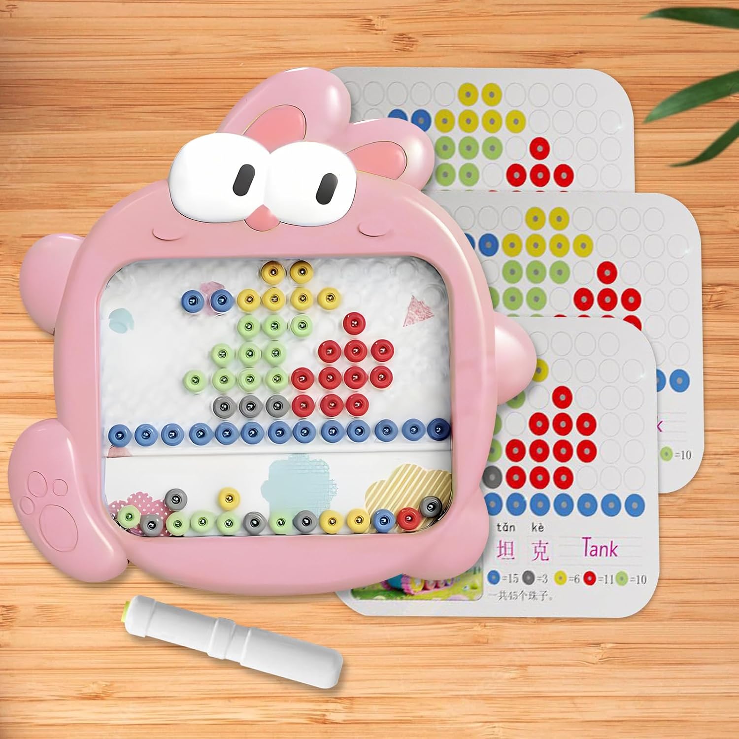 Appello colori vivaci: Ispira l'esplorazione creativa attraverso una presa confortevole e bordi arrotondati lisci, esaltata colori brillanti vivaci e dal design attraente a tema animaletto per disegnare e scrivere senza sporco Esercizi cognitivi divertenti: Sviluppa il riconoscimento delle forme e le capacità di ordinamento dei colori, utilizzando schede di apprendimento con modelli che incoraggiano l'abbinamento numerico e migliorano la coordinazione mano-cervello in modo piacevole e coinvolgente per i bambini Potenziale Artistico: La superficie a 89 caselle supporta un gioco immaginativo espansivo, incoraggiando espressione artistica e consentendo la creazione di disegni elaborati su questa lavagna magnetica generosamente dimensionata per massima soddisfazione Organizzazione Giocattoli Intelligente: Dotato di un vano di riporlo integrato, semplifica la gestione dei giocattoli, fissa la penna magnetica in modo sicuro, promuove pratiche di organizzazione e diminuisce la possibilità di dispersione dei componenti durante il gioco creativo. Stabilità magnetica garantita: Grazie ai robusti magneti integrati, questa lavagna trattiene le perline in modo , permettendo ai bambini di concentrullo sviluppo delle capacità motorie fini attraverso un gioco coerente e coinvolgente
