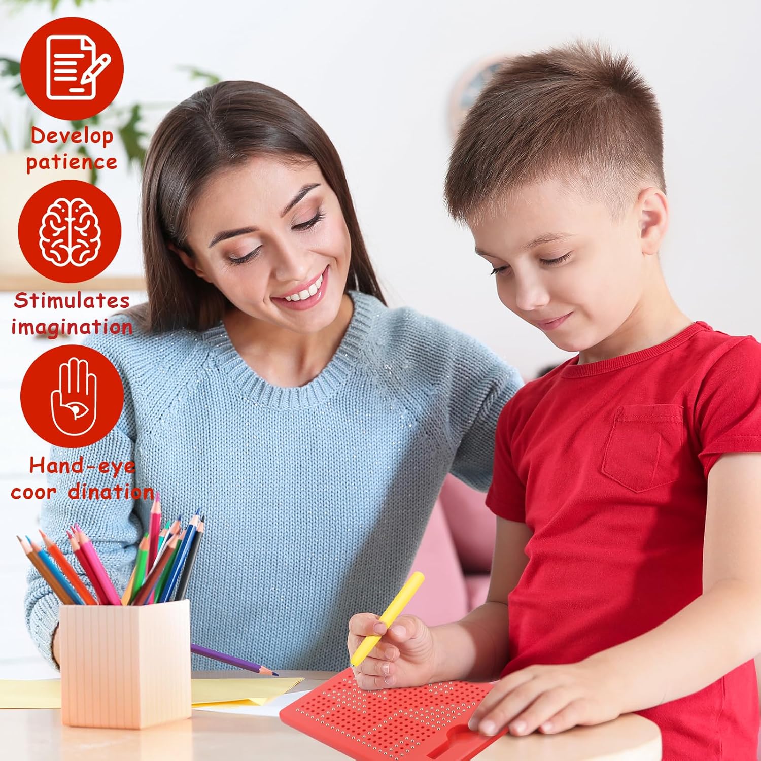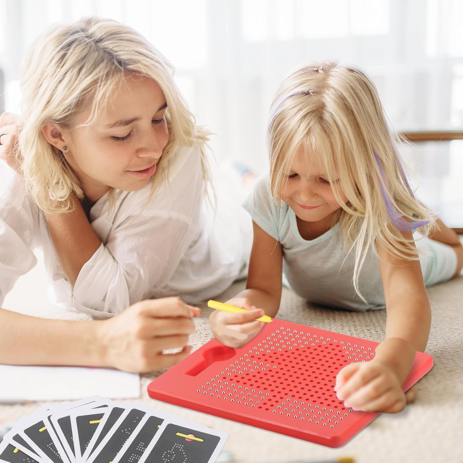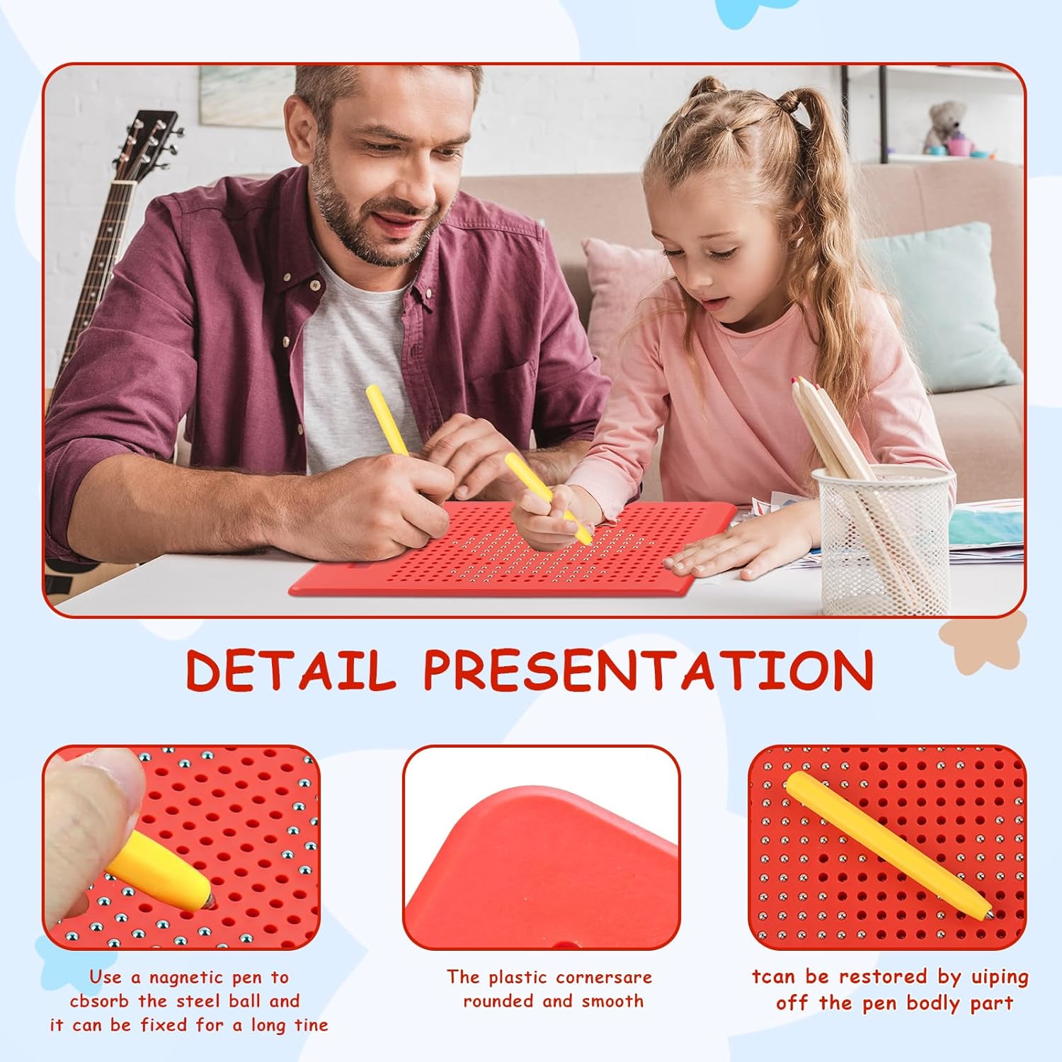 🎁Regali educativi per pittura e scrittura per bambini: riceverai un set di tavolette magnetiche per bambini splendidamente confezionate, la confezione include 1 cartoncino magnetico, 1 penna, 380 perline in acciaio, 20 carte con motivi, la dimensione del cartoncino magnetico è 21,5 * 17,5 * 1,2 cm. Questo set di tavolo da disegno magnetico può migliorare la capacità di attirare l'attenzione e la pazienza dei bambini, ampiamente utilizzato dai bambini di età superiore ai tre anni. 🎁Qualità eccellente: le nostre lavagnette magnetiche in acciaio per bambini sono realizzate in materiale ABS atossico di alta qualità + sfera magnetica, non facile da danneggiare, non facile da cadere, durevole e resistente all'usura, riutilizzabile. 🎁Uso semplice: posiziona le perline in una penna magnetica, quindi disegna motivi, numeri e lettere, ecc. sulla superficie magnetica della piastra. Tocca la punta della penna o premi la perlina con la mano, puoi rimuovere facilmente la punta in eccesso, vassoio da disegno magnetico integrato, la perlina rimossa non cadrà a terra, può essere caricata nella penna per un uso ripetuto. 🎁Giocattolo educativo per bambini: questa tavoletta da disegno magnetica riutilizzabile può essere incorporata allegoricamente in varie attività di apprendimento per aiutare i bambini a sviluppare la coordinazione occhio-mano, abilità di movimento fine, abbinamento di forme, riconoscimento del colore e pensiero logico precoce, migliorando così le loro capacità di disegno e concentrazione. Questo tavolo da disegno magnetico con penna è un giocattolo indispensabile per le gite e i viaggi, calma gli umori dei bambini. 🎁Miglior regalo: le nostre lavagne magnetiche per doodle sono leggere e compatte, facili da trasportare e da usare, che puoi facilmente portare a casa, a lezione o in viaggio. È il miglior regalo per i bambini di età superiore ai tre anni, può essere usato come regalo di compleanno, regalo per feste, regalo d'ingresso, ecc.
