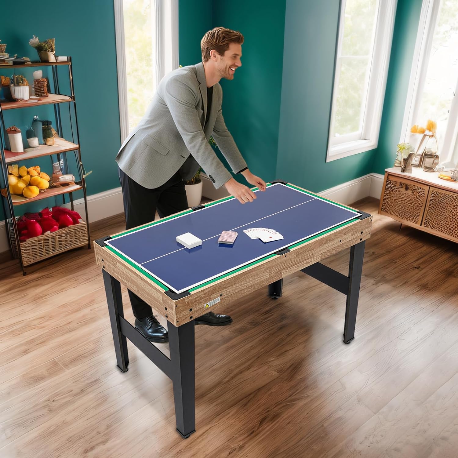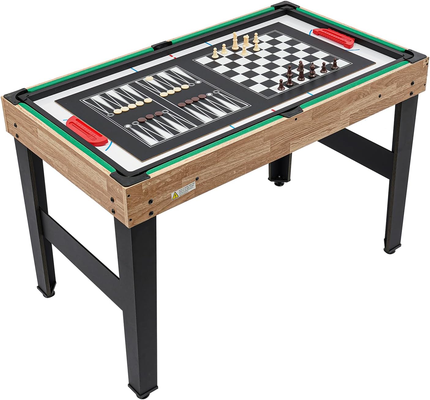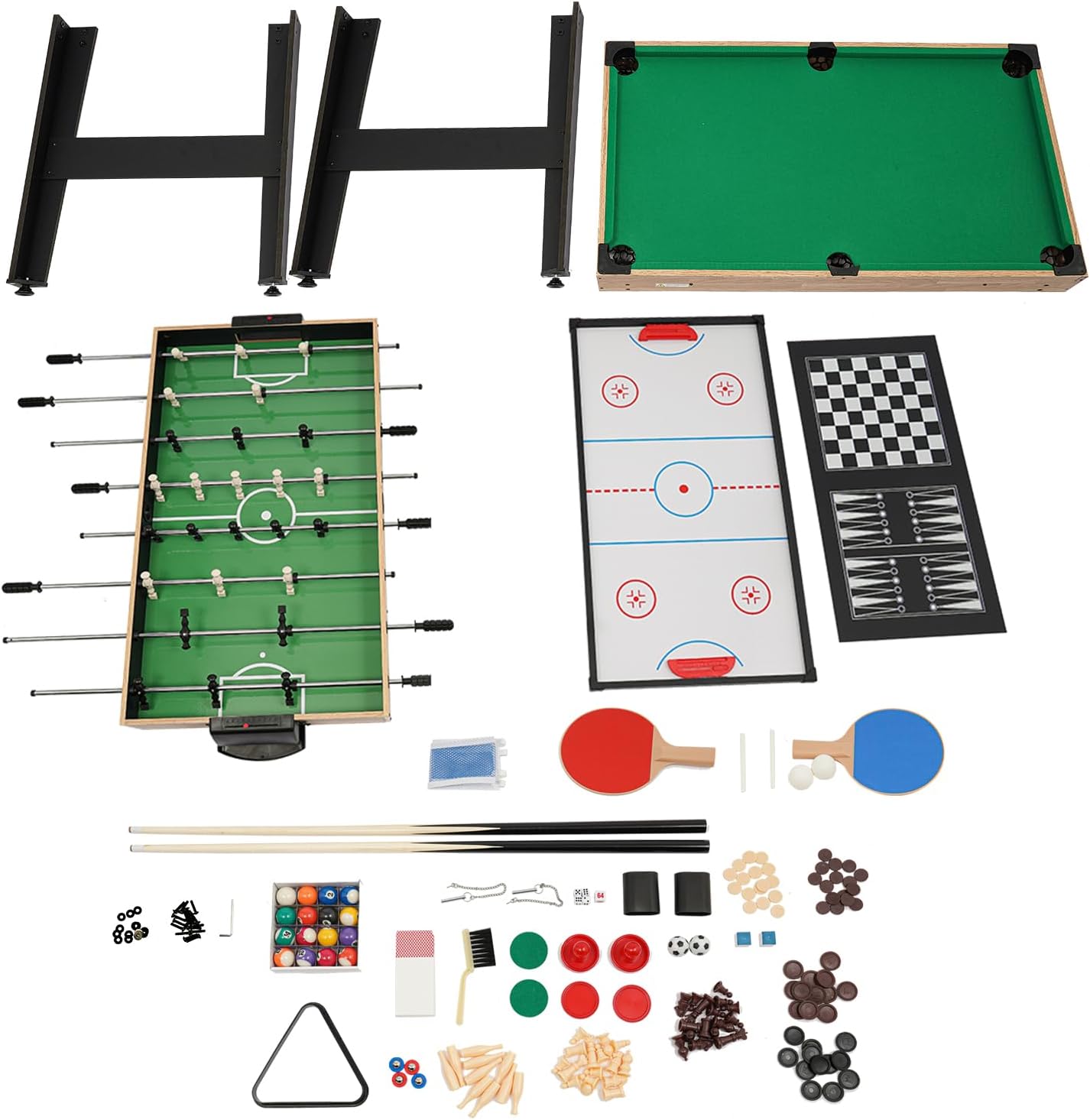 10 IN 1: questo tavolo da gioco presenta un design a 8 barre che consente di regolare il numero di giocatori a seconda del gioco, fornendo un'eccellente flessibilità. Dispone di 10 entusiasmanti giochi integrati tra cui calcio, biliardo, hockey su scivolo, ping pong, bowling, scacchi, dama, backgammon, giochi di carte e shuffleboard, così tu e i tuoi bambini potrete divertirvi in stile arcade direttamente a casa. è adatto a persone dai 6 anni in su. Design accurato: le fessure di ritorno della pallina integrate e i segnapunti manuali su entrambe le estremità consentono ai giocatori di tenere traccia dei propri punteggi e continuare a giocare senza intoppi, mantenendo l'eccitazione durante tutto il gioco. Il design impilabile e integrato del biliardino e di altri tavoli da gioco ti consente di passare facilmente da un tipo di gioco all'altro e sfruttare al meglio il tuo tempo di intrattenimento. Dimensioni adatte: la dimensione di 46,4 x 24 pollici consente a te e ai tuoi amici di giocare liberamente senza sentirvi angusti o occupare troppo spazio nella vostra stanza. Aspetto moderno: questo prodotto è realizzato in MDF, PVC, metallo e plastica di alta qualità, robusto e resistente all'usura. Il piano del tavolo verde, la struttura in legno con venature naturali, le aste in metallo e le quattro gambe di sostegno rendono questo prodotto semplice ed elegante, quindi si adatta bene alla maggior parte degli ambienti. Campo realistico: l'area di gioco verde vividamente contrassegnata presenta linee di campo che simulano un vero campo da calcio, rendendo l'esperienza di gioco ancora più coinvolgente e il gioco più autentico per i giocatori.