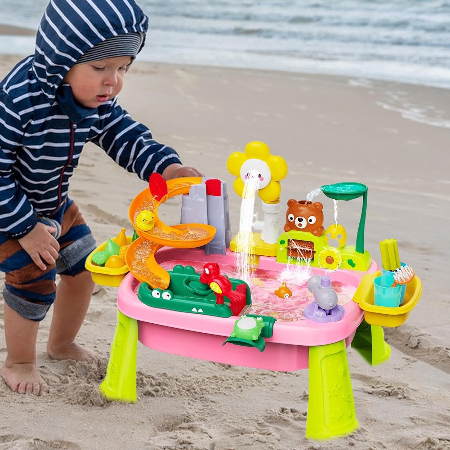 Giocattolo Multifunzione: Tavolo acqua per bambini con giochi di ruolo come cucina e , oltre 20 realistici per stimolare abilità motorie fini e gioco collaborativo. Strumento sensoriale coinvolgente che favorisce creatività ed esplorazione durante il gioco. Riduzione Screen Time: Incentiva l'apprendimento pratico con meccanismo a tre altezze regolabili che garantisce comfort ergonomico, sviluppa coordinazione motoria e limita il di utilizzo degli schermi. Utilizzo Versatile:Esperienza coinvolgente con tavolo gioco bimbi a doppia modalità sabbia/acqua. Favorisce creatività e interazione genitore-figlio in giardino, piscina o spiaggia, ideale per attività educative divertenti Percorsi Creativi Acquatici:Stimola la mente dei più piccoli con giochi sensoriali di flusso d'acqua e osservazione traiettorie galleggianti, favorendo lo sviluppo cognitivo e la creatività con esperienze interattive di fisica ideali per la prima infanzia. Ciclo Acqua: Coinvolge il bambino con ciclo acqua creativo, attivazione modalità pioggia simulata e pompa ad acqua a batteria, per esplorazione interattiva del flusso in setup gioco a forma di girasole