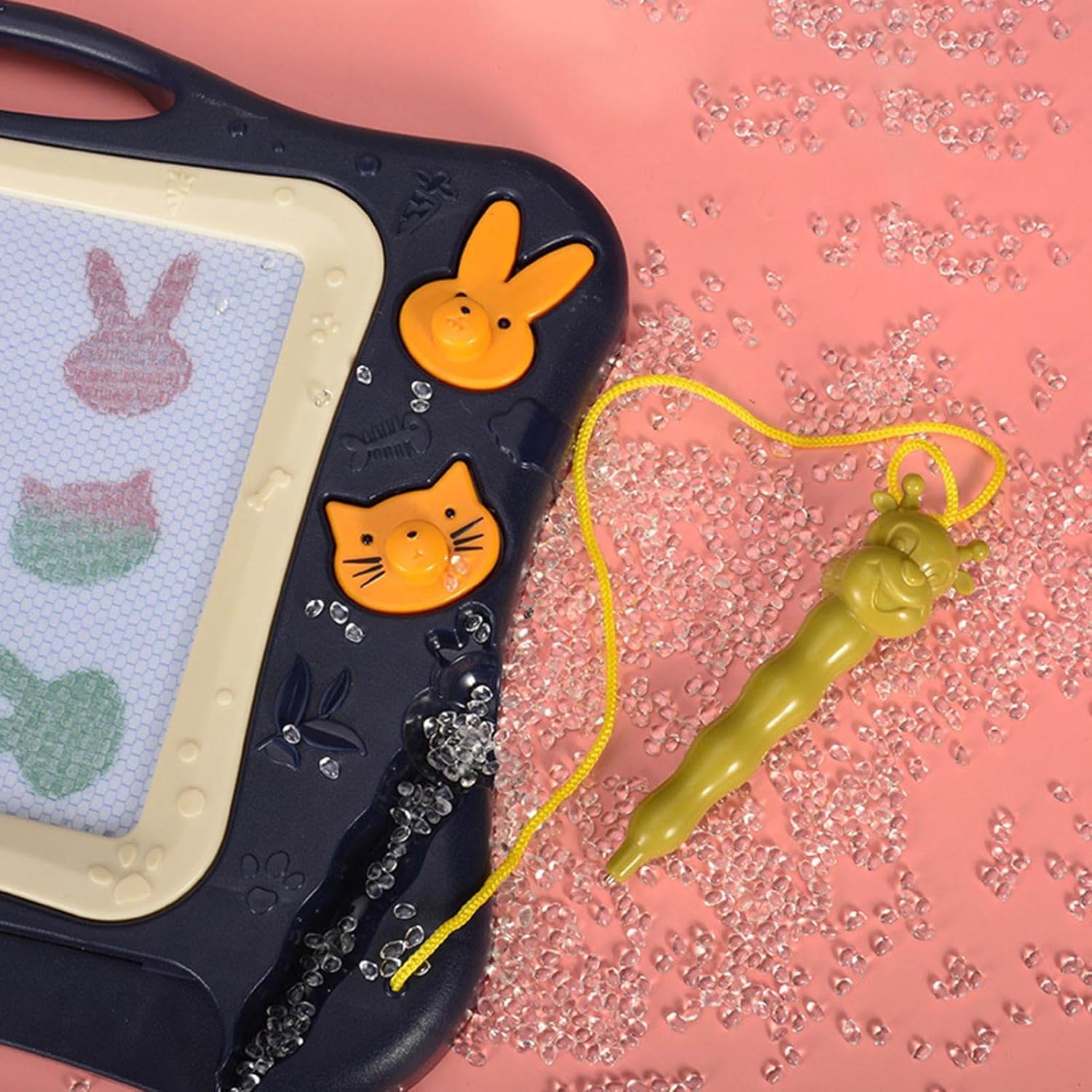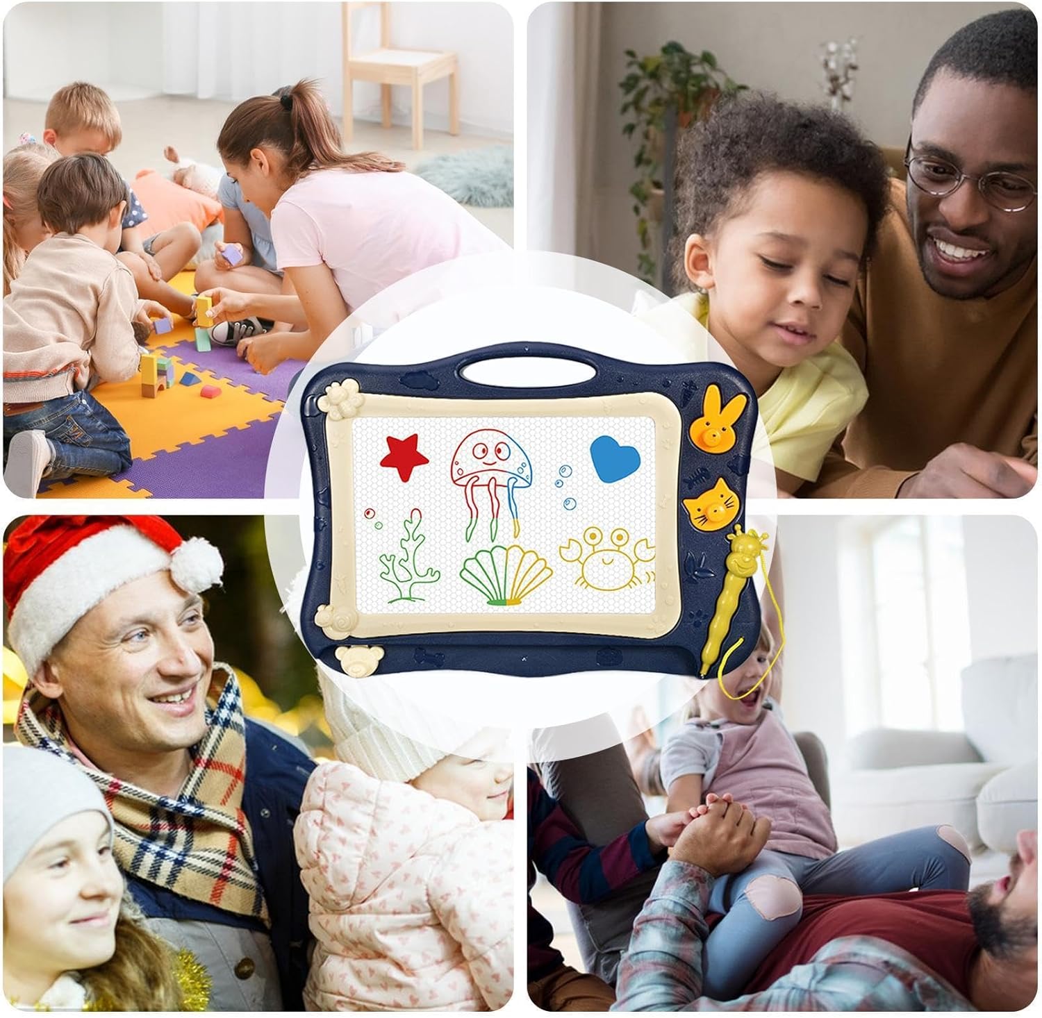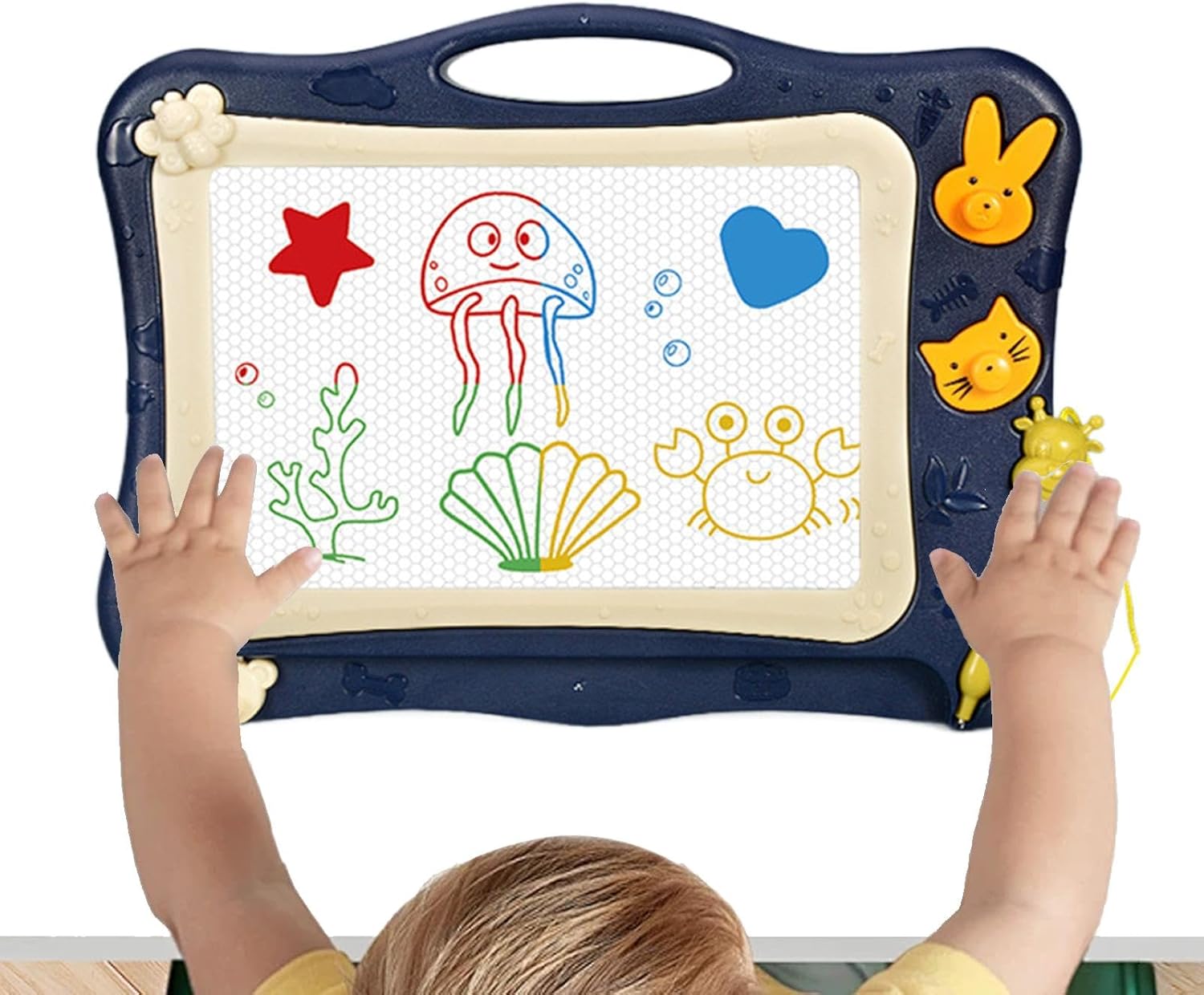 Sviluppa abilità: sblocca il potenziale di tuo figlio con questo tavolo da disegno magnetico che migliora la coordinazione manuale e le capacità di riconoscimento del colore, promuovendo al contempo l'immaginazione e le capacità di pensiero creativo Materiale eccellente: costruito con eccellente materiale PP, il nostro tavolo da disegno magnetico offre una buona durata e usabilità per divertimento fantasioso Design spazioso dell'area di disegno: progettato come un rettangolo, questo tavolo da disegno magnetico offre un'area di disegno spaziosa che offre più immaginazione creativa e libertà ai giovani artisti, consentendo infinite possibilità. Fornisci ore di divertimento: lascia correre l'immaginazione di tuo figlio con il nostro tavolo da disegno magnetico! Con 4 colori brillanti (verde, giallo, rosso, blu), una penna per scrivere e 2 adorabili timbri con animali; Questa lavagna può essere scritta e cancellata ripetutamente, offrendo innumerevoli ore di esperienze divertenti e creative. Ottimo regalo: coltiva i piccoli artisti con questo tavolo da disegno magnetico, perfetto per feste per bambini, compleanni e divertimento quotidiano per ragazzi e ragazze. È il regalo perfetto