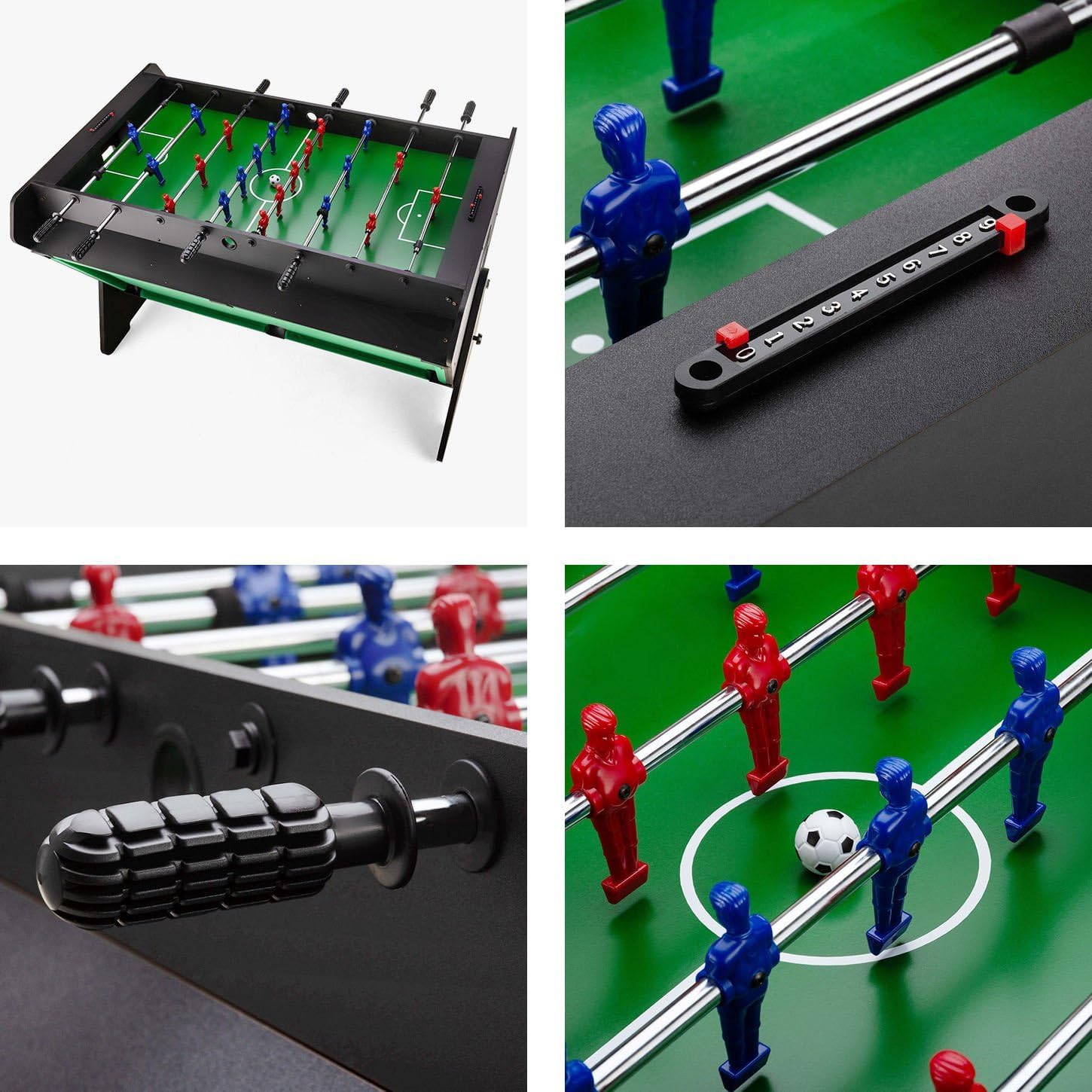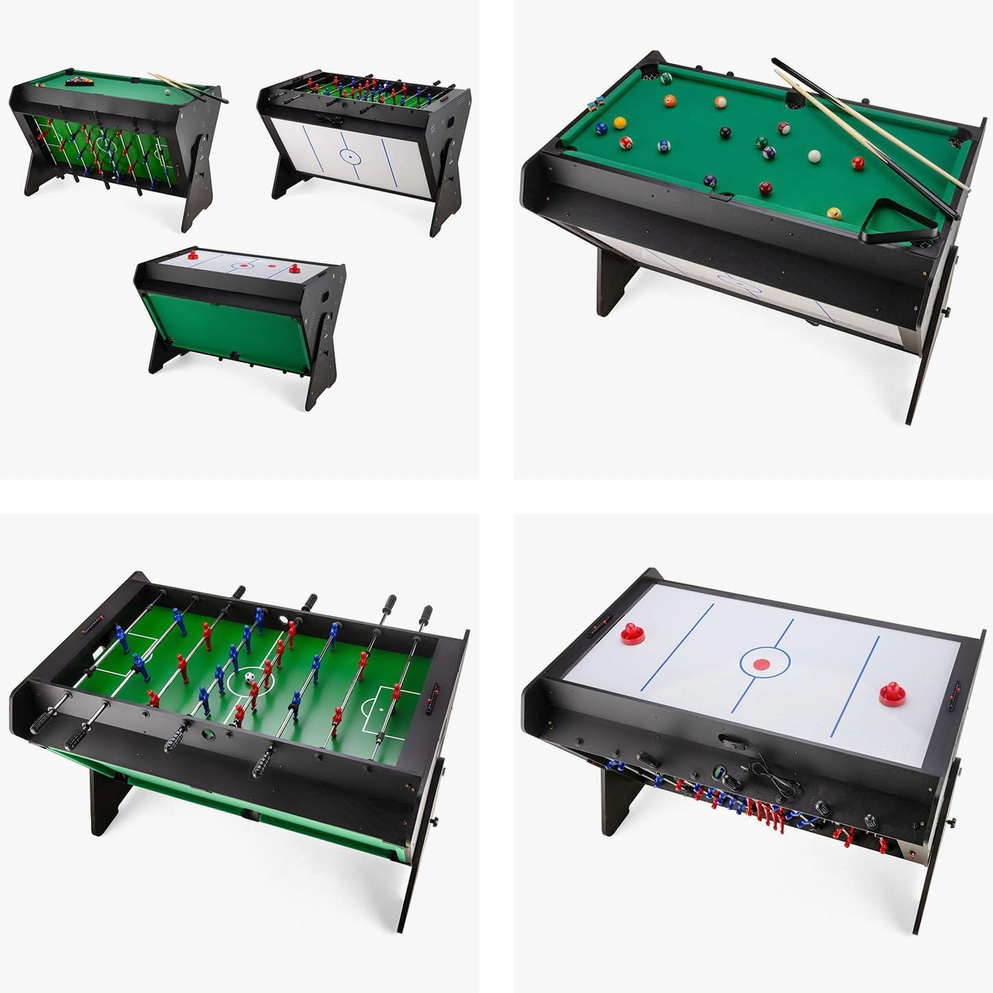 | enthaltene Komponenten | Billardkugeln, ein Kugelsetzdreieck, Kreiden, Billardqueues, Hockeykugeln, Hockeygriffe, Tischfußballfiguren, Tischfußballkugeln, Gummigriffe, manuelle Punktezähler, eine Bürste zum Reinigen des Billardtisches und ein Ventilator mit Gitter für Airhockey. |