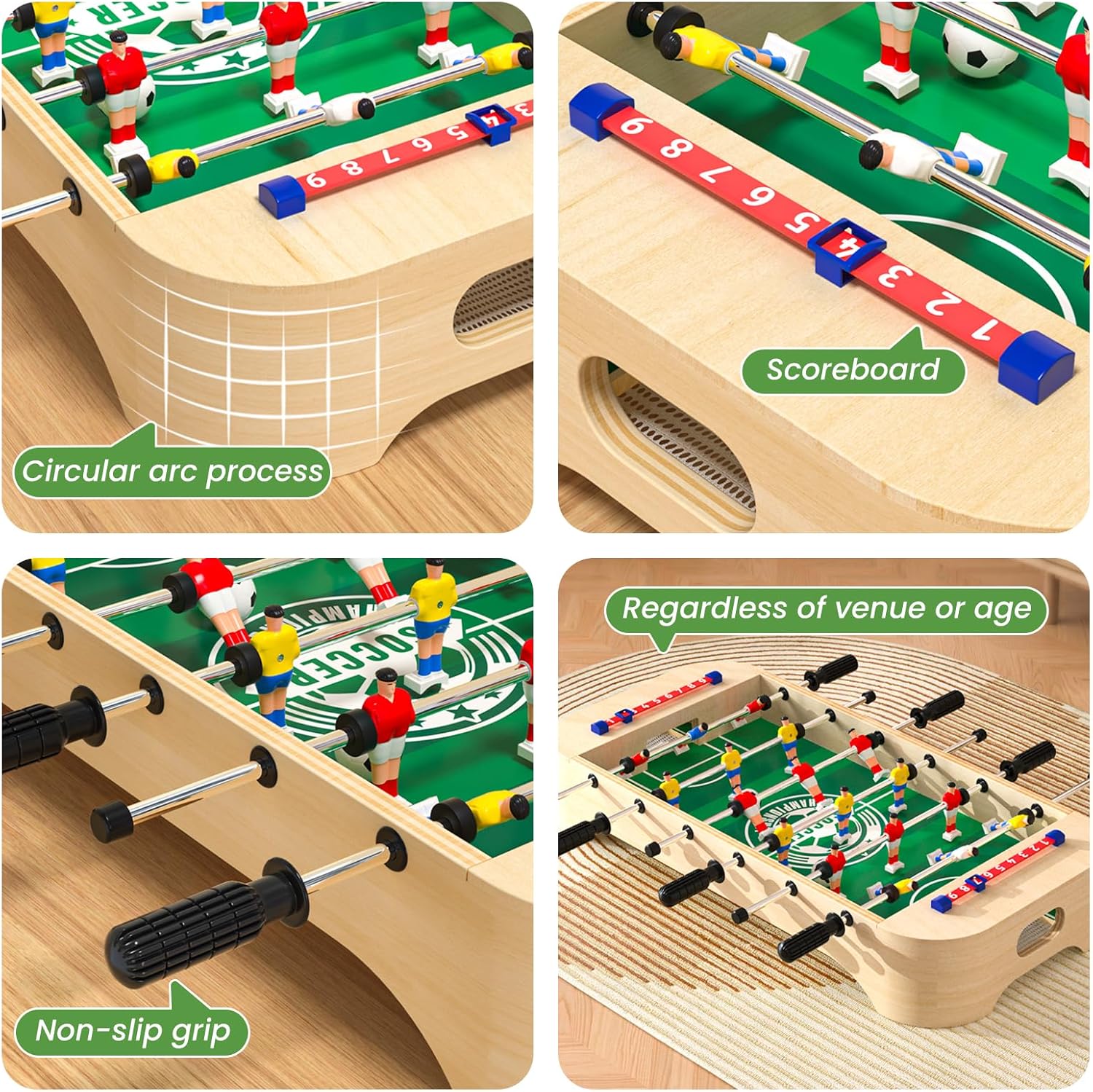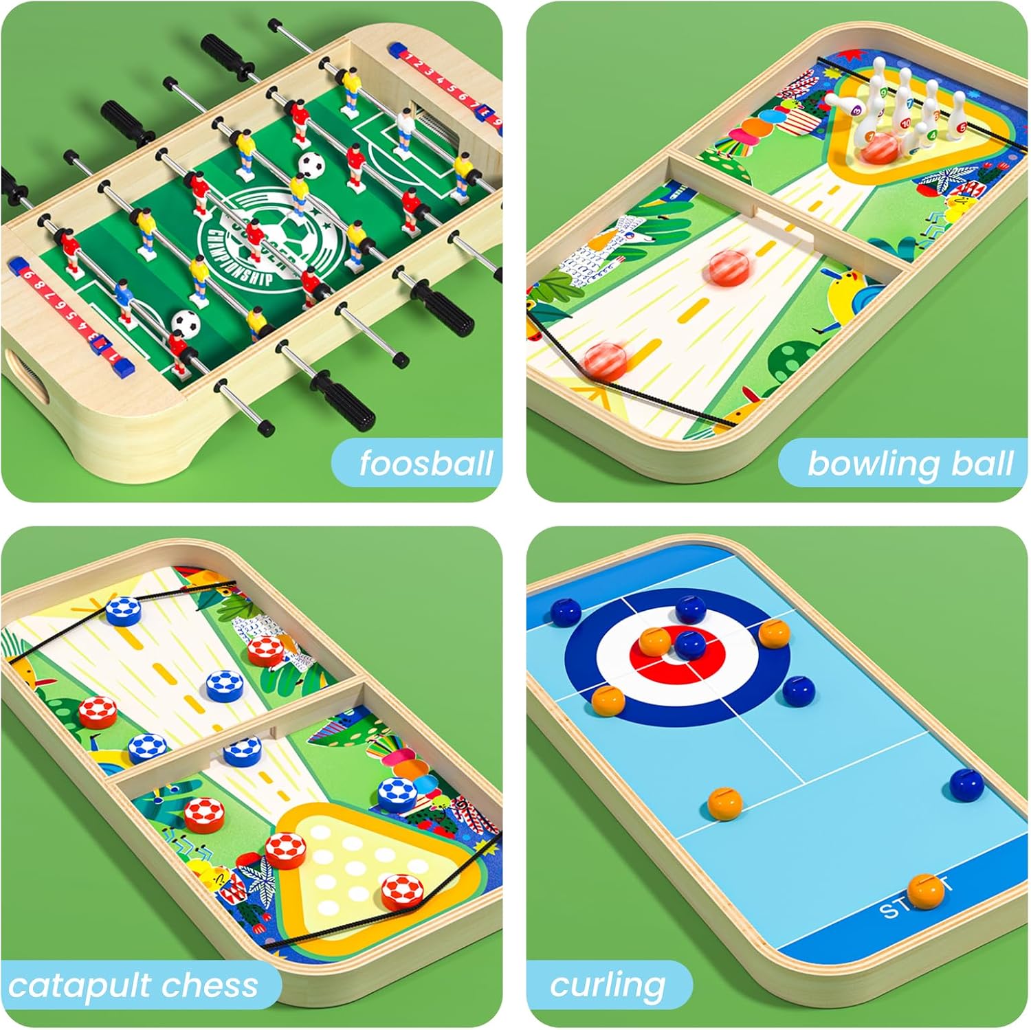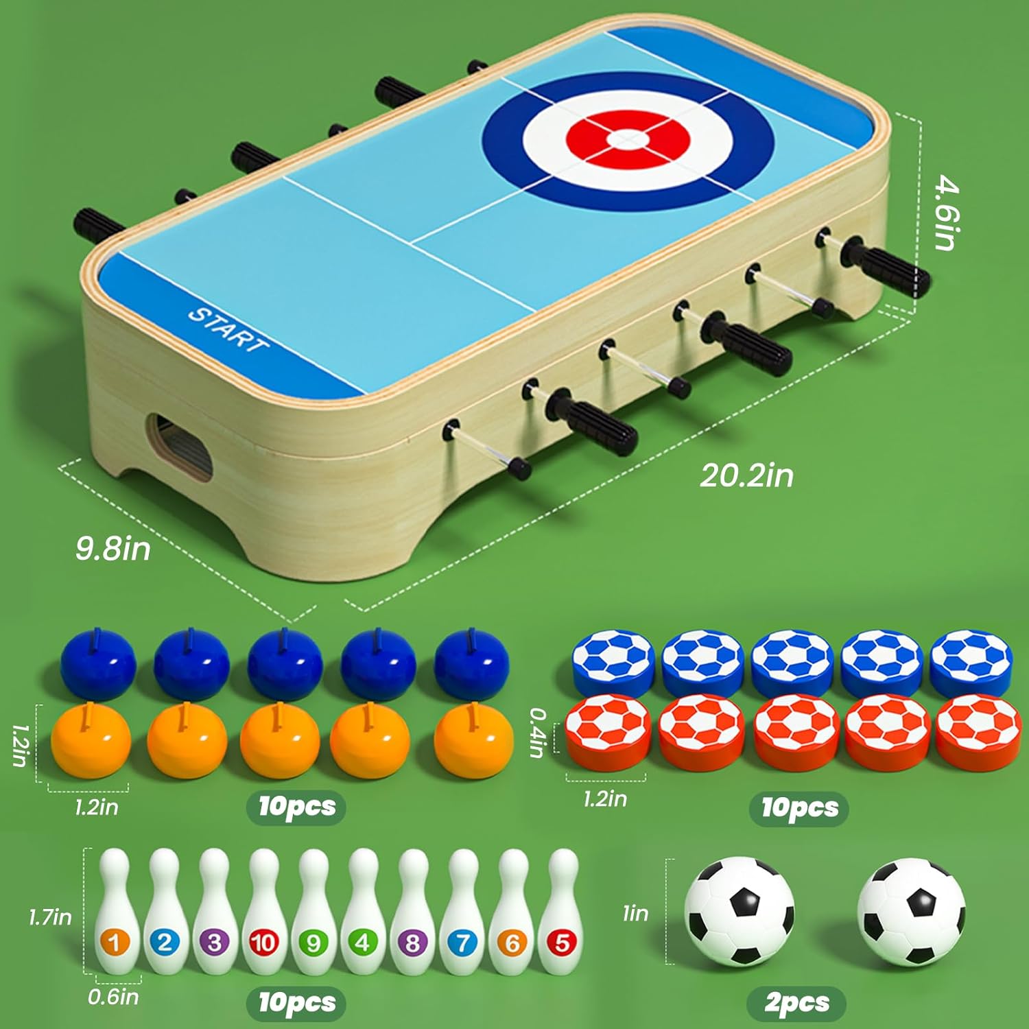 Tavolo da gioco 4 in 1: questo tavolo da gioco combina quattro tipi di giochi: calcio, curling, bowling e hockey da tavolo. Ottieni la transizione di gioco con un semplice capovolgimento del desktop. Giochi da tavolo domestici: questo giocattolo può essere posizionato su un tavolo, un prato o un tappeto grazie alle sue dimensioni adeguate e al peso leggero per godersi un piacevole momento di gioco. È anche molto facile da trasportare quando esci. Legno di alta qualità: questo tavolo da gioco è realizzato in legno di alta qualità, con linee morbide, superficie liscia, qualità premium e struttura robusta. Giochi desktop: questo gioco può sviluppare l'intelligenza e migliorare le capacità di reazione. Può anche promuovere l'amicizia o le emozioni quando giochi con i tuoi amici o familiari. Regalo perfetto: perfetto come regalo di compleanno, Natale o ritorno a scuola per i bambini. Adatto anche per adulti.