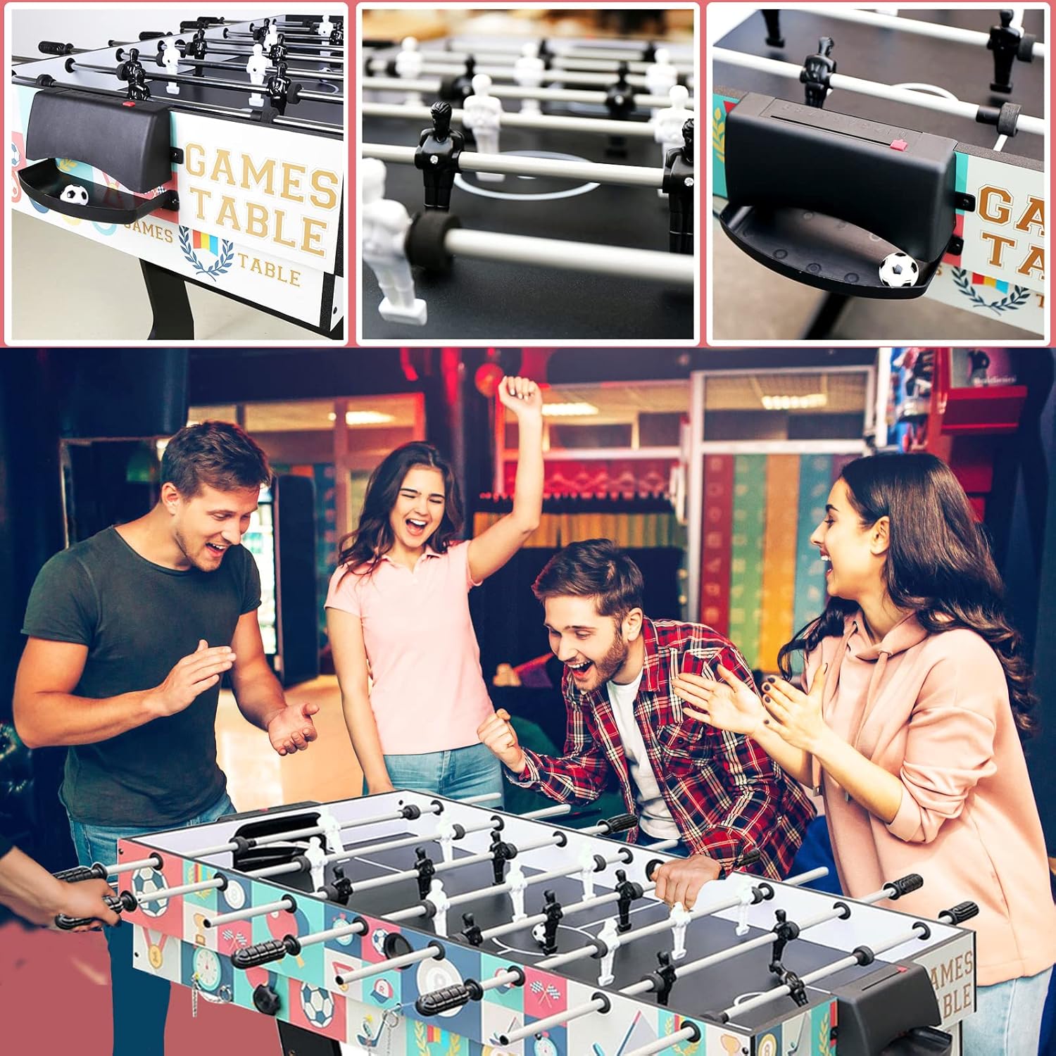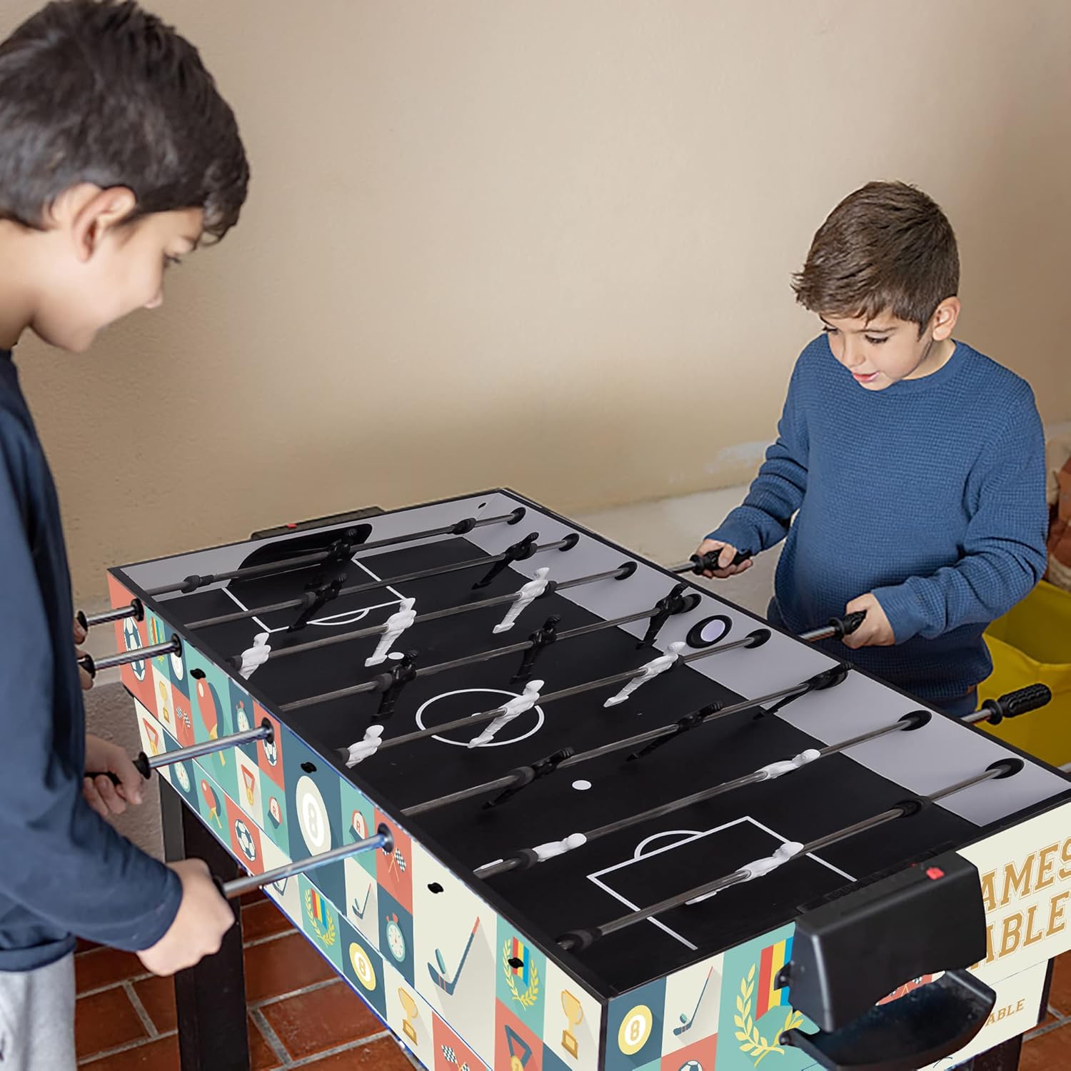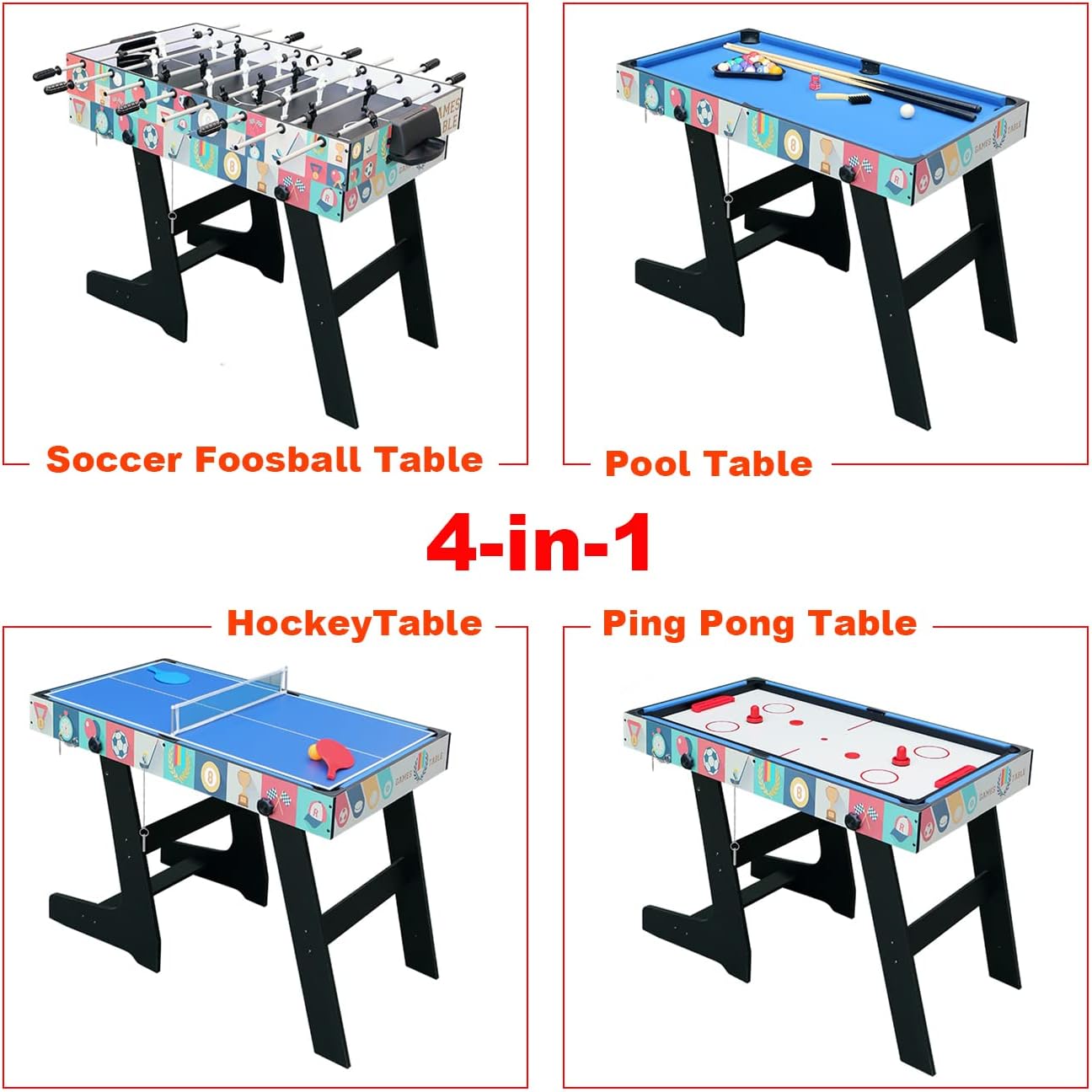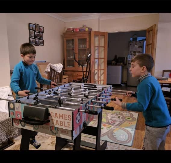Tavolo da gioco combinato 4 in 1: tavolo da biliardo, calcio balilla, tavolo da hockey, tavolo da ping pong in un tavolo da gioco, può essere passato da un gioco all'altro in pochi secondi. (Nota: il tavolo da hockey non è una palla da air hockey elettrica, ma semplicemente scorre.) MATERIALI DI ALTA QUALITÀ E COSTRUZIONE ROBUSTA: questo tavolo da gioco è realizzato con un pannello MDF di alta qualità ed è quindi molto resistente. Il collegamento con solide viti metalliche garantisce stabilità e impedisce al tavolo da gioco di oscillare e influenzare l'esperienza di gioco. FACILE DA CONSERVARE: sebbene contenga 4 diversi giochi da tavolo, mantiene comunque la tua casa in ordine. Il design con gambe del tavolo pieghevoli consente di risparmiare spazio in modo molto efficiente ed è ideale per piccole sale giochi. FACILE DA ASSEMBLARE E DA UTILIZZARE: Include: biliardino, tavolo da ping pong, 2 racchette e rete, tavolo da push hockey, putter e disco, tavolo da biliardo con 2 stecche da biliardo e palline da biliardo. Secondo le istruzioni per l'uso dettagliate e illustrate è possibile montare rapidamente il tavolo multigioco, capovolgere il tavolo da ping pong e trasformarlo in un tavolo da air hockey. ADATTO A TUTTA LA FAMIGLIA: Dimensioni tavolo da calcio balilla: 48,8 x 24 x 32,1/124 x 61 x 81,5 (L x P x A), Dimensioni tavolo da ping pong/hockey/snooker: 40,5 x 23 x 28,3/103 x 58 x 72 cm (L x P x A), Peso: 26 kg; Il tavolo da gioco sportivo perfetto per i bambini. Gli adulti possono anche giocarci con i bambini ed è un'ottima scelta per regali di Natale e di compleanno.
