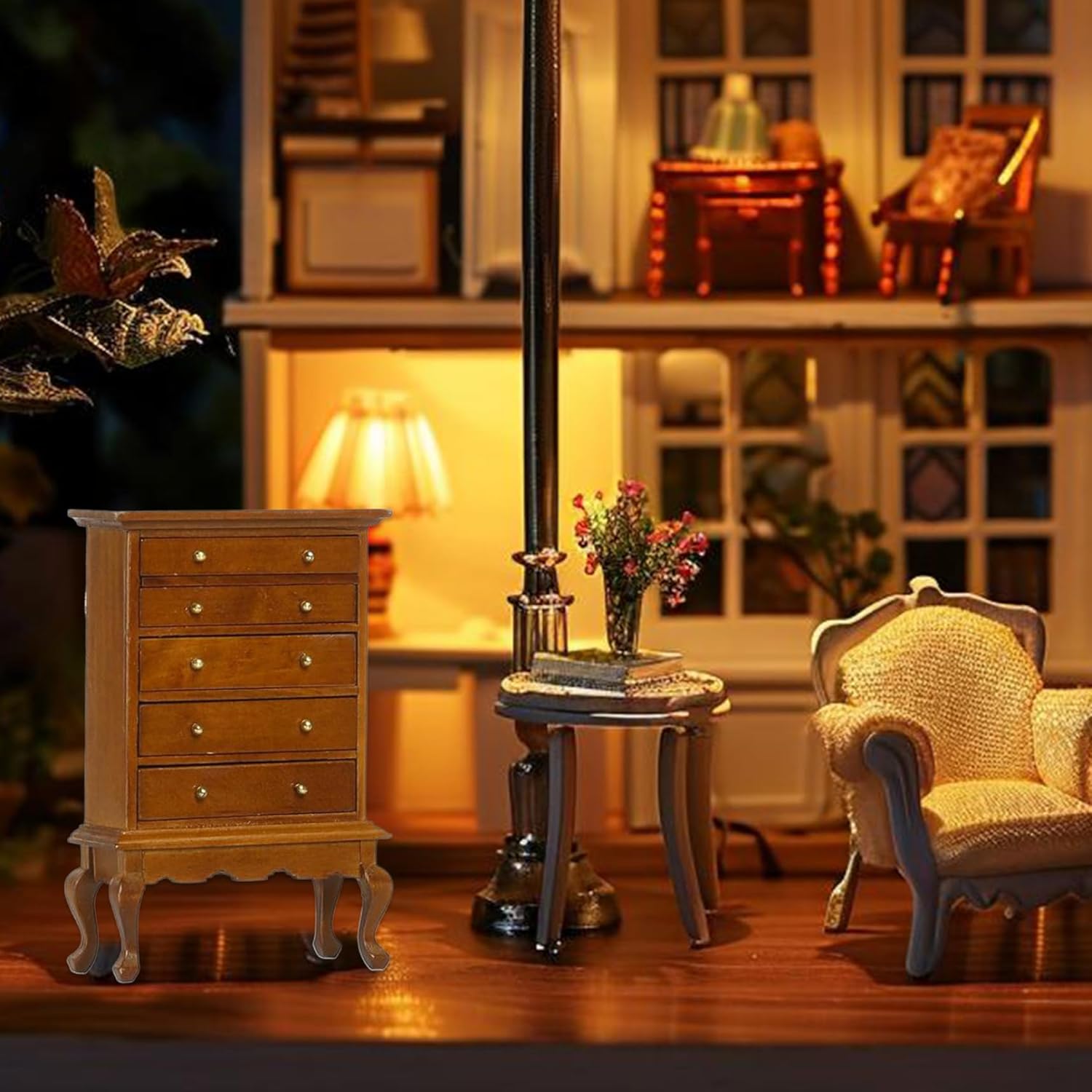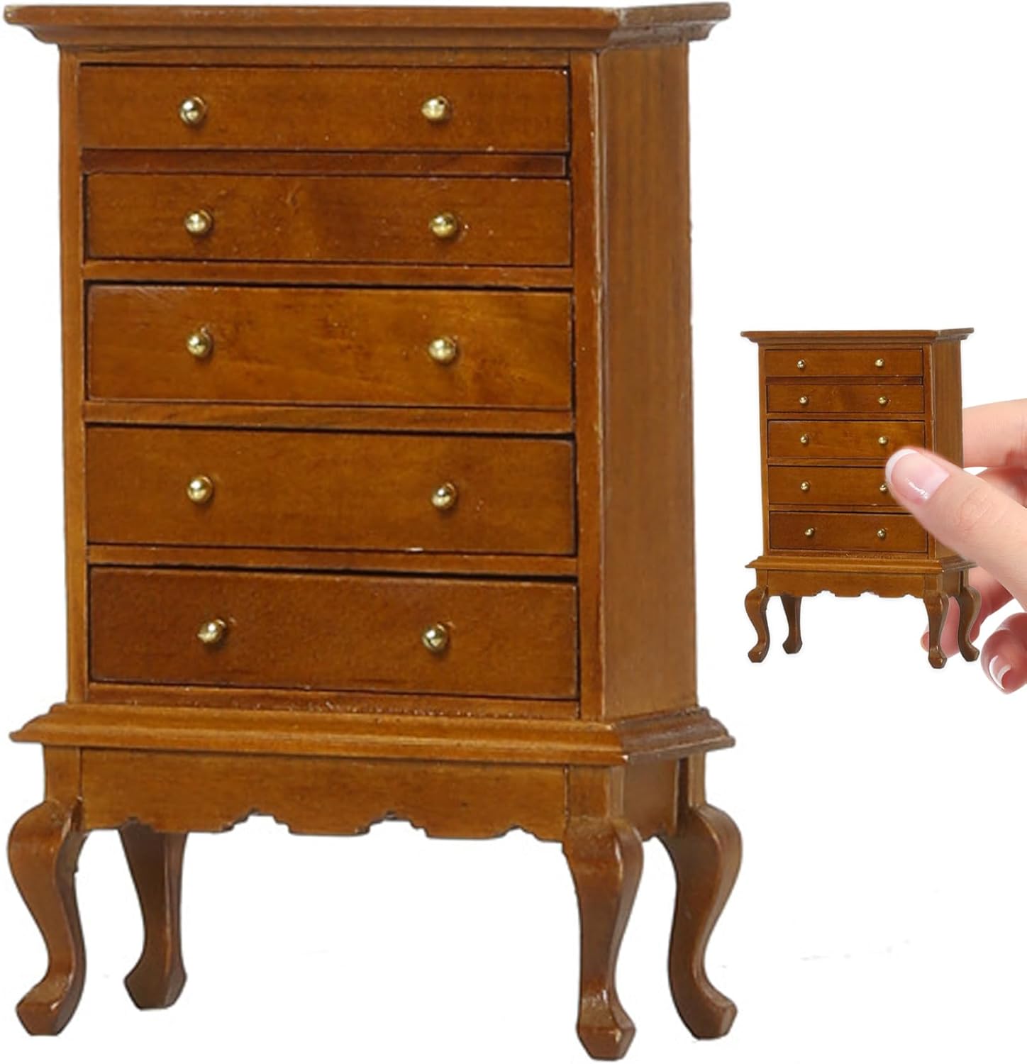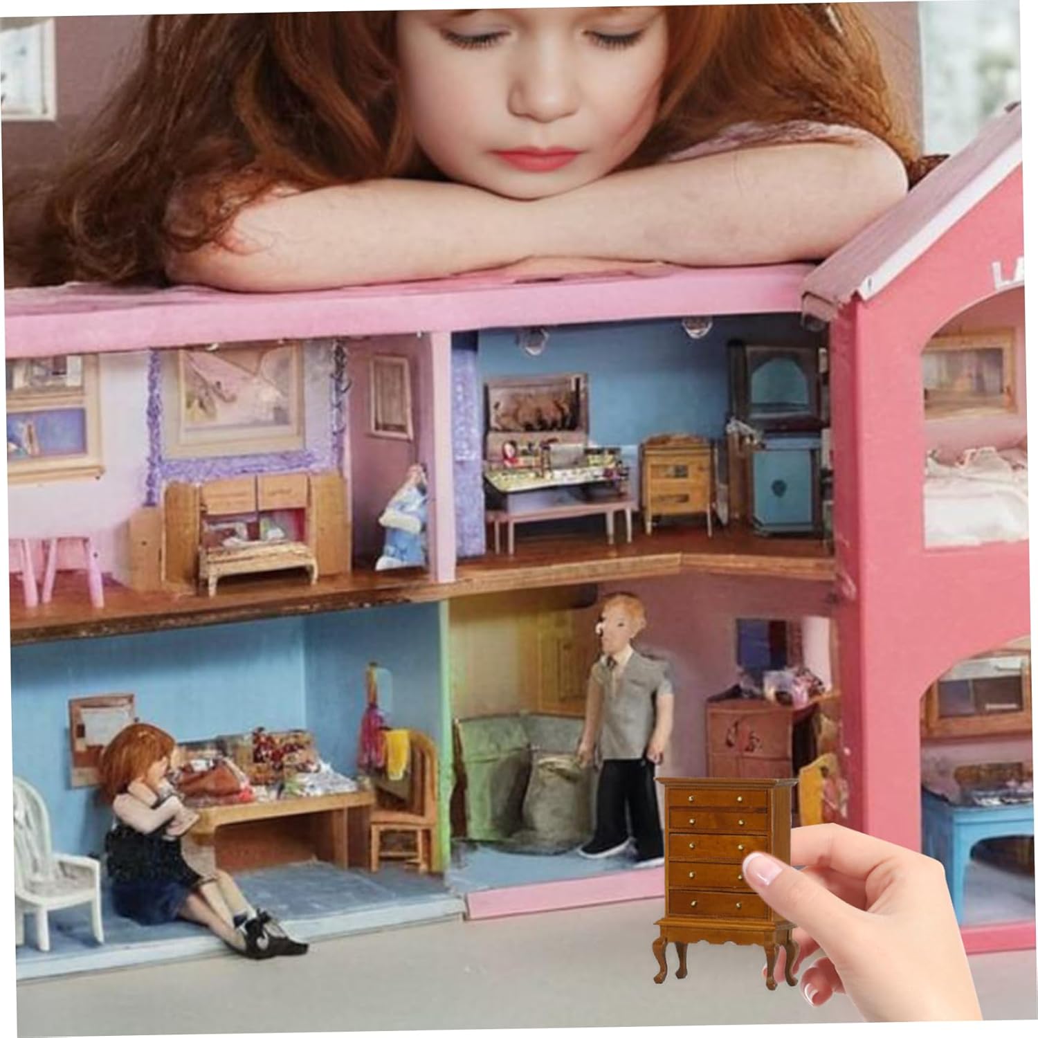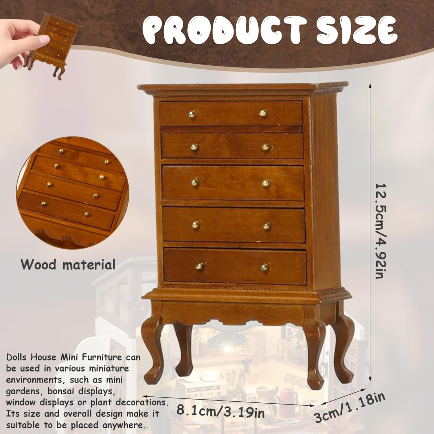 Progettato in modo complesso per il realismo: questo comò per casa delle bambole presenta un colore noce finemente dettagliato con cinque cassetti funzionali, aggiungendo autenticità e fascino alla configurazione della tua casa delle bambole, migliorando il realismo di qualsiasi scena in miniatura. COSTRUZIONE IN LEGNO DI QUALITÀ: Realizzata in legno robusto, questa cassettiera per casa delle bambole non è solo esteticamente gradevole, ma è anche costruita per durare, fornendo un'aggiunta senza tempo alla tua collezione di miniature. Ideale per la casa delle bambole: questi mobili per casa delle bambole possono essere collocati in case delle bambole, matrimoni o vetrine di panetteria, fornendo un tocco elegante e decorativo che arricchisce l'ambiente generale. Uso decorativo versatile: perfetto per vari ambienti in miniatura, come mini giardini, espositori per bonsai e decorazioni vegetali, questi mobili per casa delle bambole aggiungono fascino visivo e profondità a qualsiasi ambiente. Compatto e funzionale: misura 8,1 x 3 x 12,5 cm (3,19 x 1,18 x 4,92 pollici), le sue dimensioni compatte e il design funzionale lo rendono una scelta perfetta per qualsiasi scena in miniatura, aggiungendo un comodo spazio di archiviazione con i suoi cinque cassetti.
