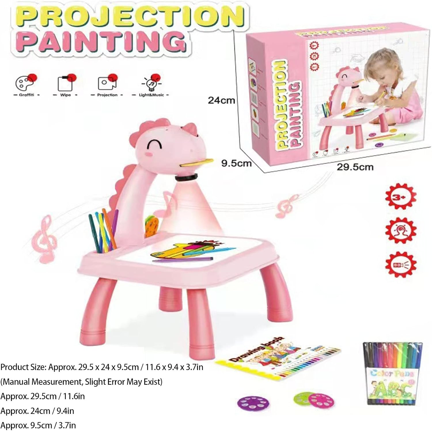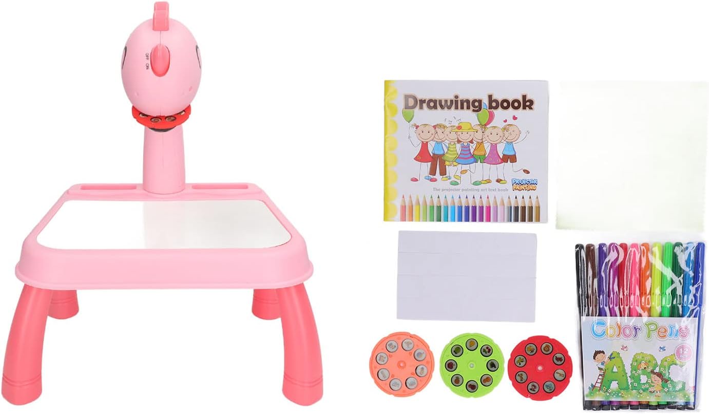 [DESIGN COINVOLGENTE] Cattura l'interesse di tuo figlio con l'adorabile design dei dinosauri di questo tavolo per proiettori, rendendo il disegno e l'apprendimento più entusiasmanti. [MIGLIORA LE COMPETENZE] Incoraggia tuo figlio a sviluppare abilità di disegno e migliorare la coordinazione occhio-mano con il proiettore per schizzi intelligente incluso in questo set. [SICURO E ROBUSTO] Le gambe staccabili garantiscono una base stabile per gli sforzi artistici di tuo figlio su questo proiettore da tavolo da disegno, promuovendo sicurezza e fiducia. [STRUMENTO ISPIRANTE] Scatena la creatività e l'immaginazione di tuo figlio con questo tavolo da disegno per proiettore, promuovendo l'amore per l'arte e l'espressione di sé. [POTENZA CONVENIENTE] Questo tavolo per proiettore da disegno funziona con 3 batterie AA ed è realizzato in materiale ABS di alta qualità per resistenza e sicurezza durante l'uso.