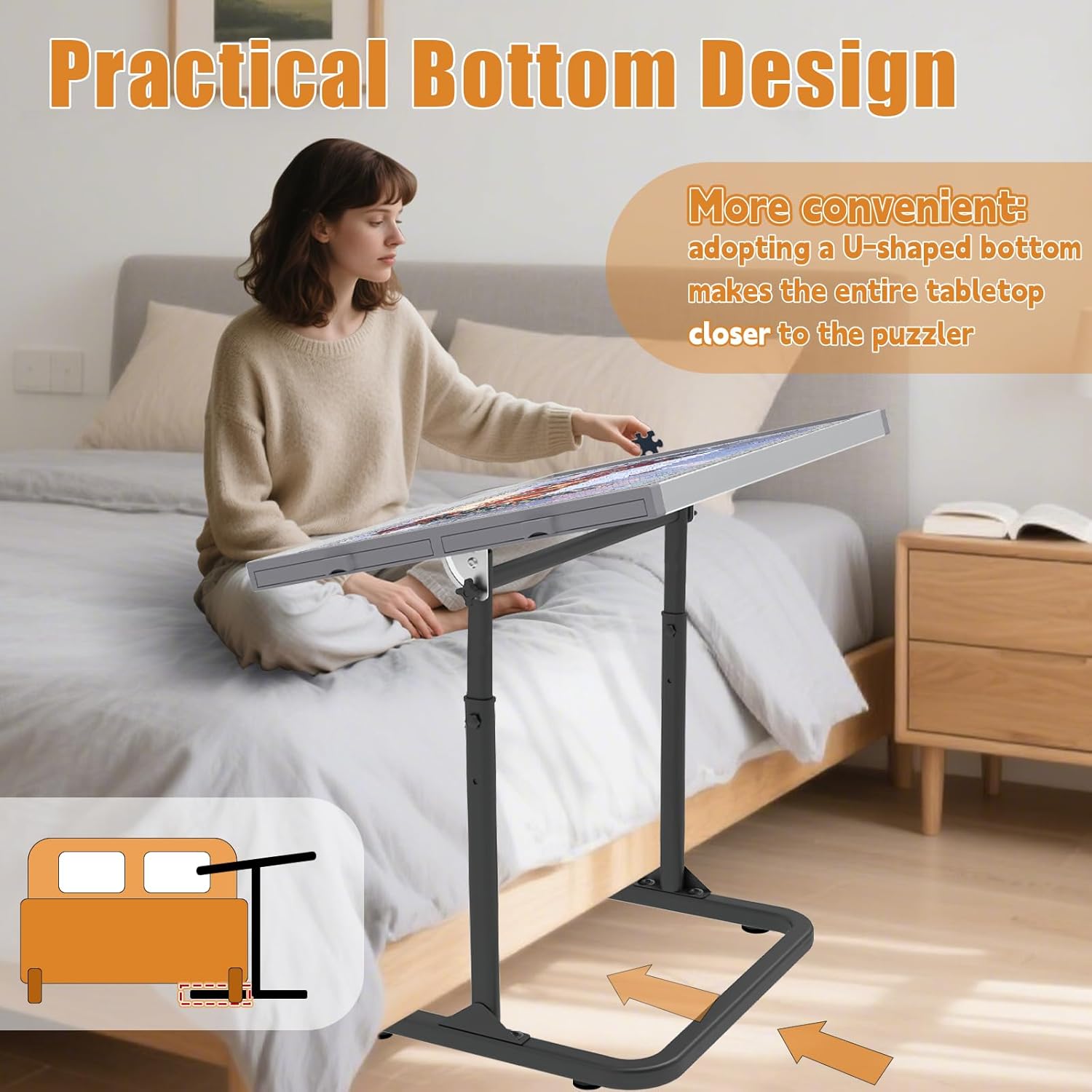 Certificato FSC: la parte centrale di questo tavolo puzzle è realizzata in legno certificato FSC. Spazio sicuro sotto il divano: il tappetino puzzle con cassetti presenta una base unica a forma di U che può essere spinto in modo sicuro sotto il divano o il letto. Così avrete il puzzle più vicino a voi e potrete giocare in modo rilassato e senza sforzo. Design salvaspazio della tavola puzzle: basta inclinare il puzzle verticalmente fino a 0 gradi quando non lo si utilizza. Si può spingere ordinatamente in ogni angolo, risparmiando spazio prezioso per vivere o intrattenere. Due altezze regolabili: cambia facilmente tra due altezze perfette. Questo tavolo puzzle è adatto a tutti, dai bambini agli adulti, e può essere utilizzato su un divano, una poltrona o uno sgabello per il massimo comfort. Piastra di inclinazione ergonomica: la piastra regolabile a 90 gradi consente di trovare l'angolo ideale per evitare la tensione del collo e della schiena. Goditi sessioni di puzzle più lunghe e comode senza dolore. Costruzione durevole e leggera: questo tavolo puzzle con cassetti è stato realizzato con un robusto telaio in alluminio e gambe in metallo ed è progettato per durare nel tempo. È più resistente del legno e si sposta facilmente in casa. Inoltre, può essere utilizzato come tavolo da gioco da tavolo. Giocare in modo chiaro e protetto: quattro cassetti scorrevoli assicurano che le parti siano ordinate e a portata di mano. La copertura in plastica del tavolo puzzle con gambe in dotazione protegge il tuo lavoro da polvere, animali domestici e piccole mani e aiuta anche a capovolgere i puzzle pronti per incollare.