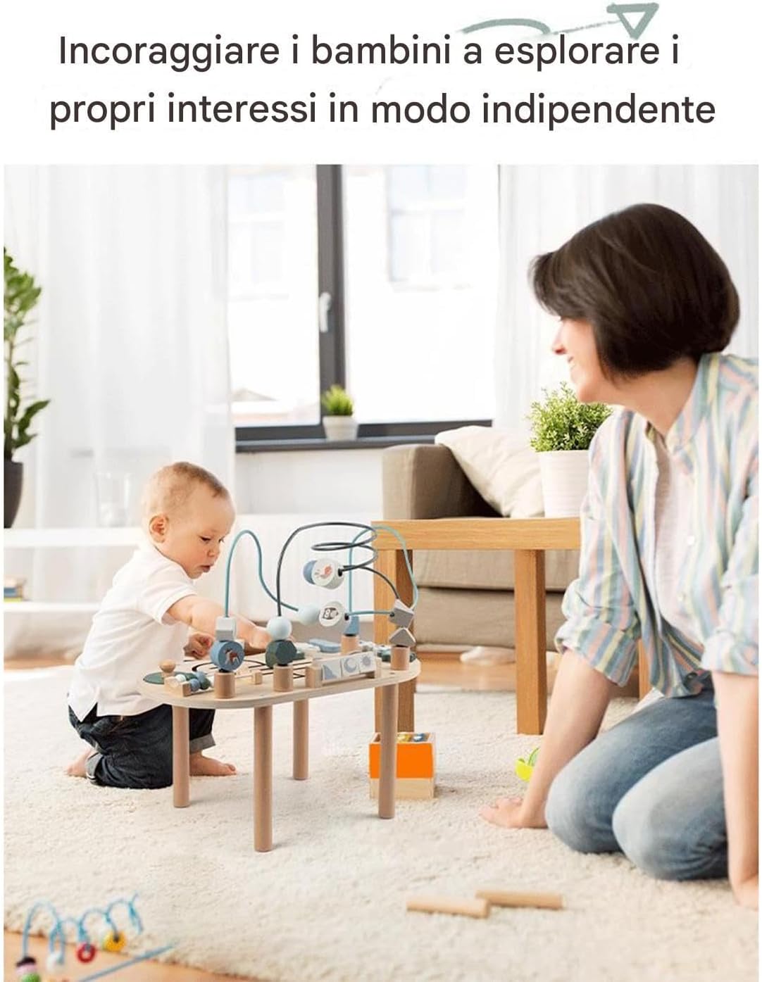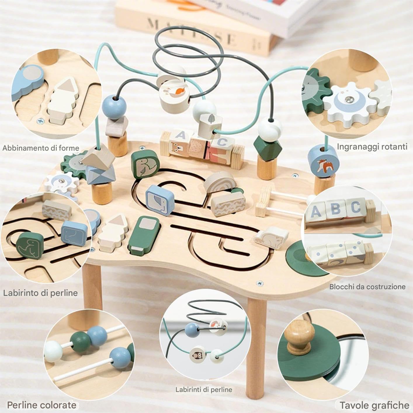 Tavolo Resistente Bambini: In legno naturale con finitura liscia sicura per bambini, bordi arrotondati e vernice ad acqua crea struttura durevole ideale per ore di gioco continuativo Fissaggio Sicuro Componenti: Progettato con assemblaggio a vite che potenzia la struttura, assicura fissati saldamente ed esperienza senza oscillazioni, supportato dalla base stabile a gambe. Centro Multigioco: Combina abbinamento forme, labirinto percorso, palline colorate, labirinto perline, pannello schemi, girevoli e ingranaggi rotanti per un lungo divertimento educativo e coinvolgente. Stimola Gioco Creativo: Progettato per supportare lo sviluppo cognitivo e affinare la coordinazione occhio-mano, questo gioco educativo favorisce le abilità motorie fini ispirando efficacemente il gioco immaginativo e interattivo nei bambini piccoli. Premuroso: Dimostra la tua cura con questo tavolo sensoriale sicuro, regalo per persone care che aggiunge allegria alla vita quotidiana