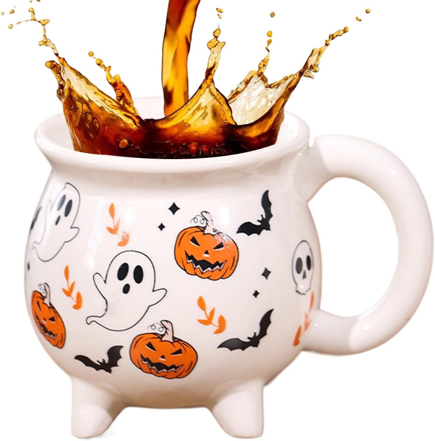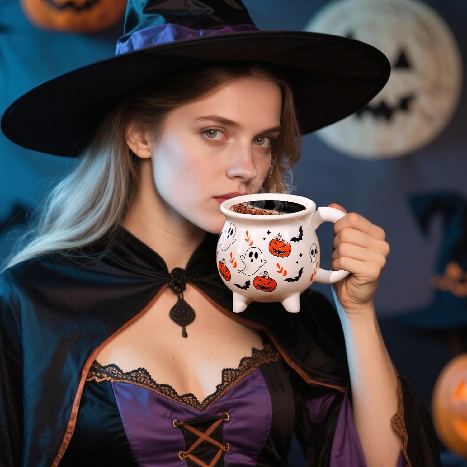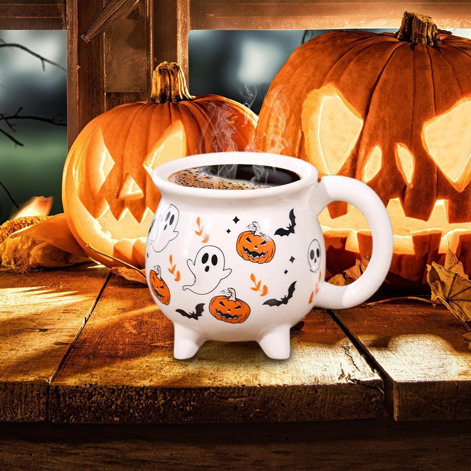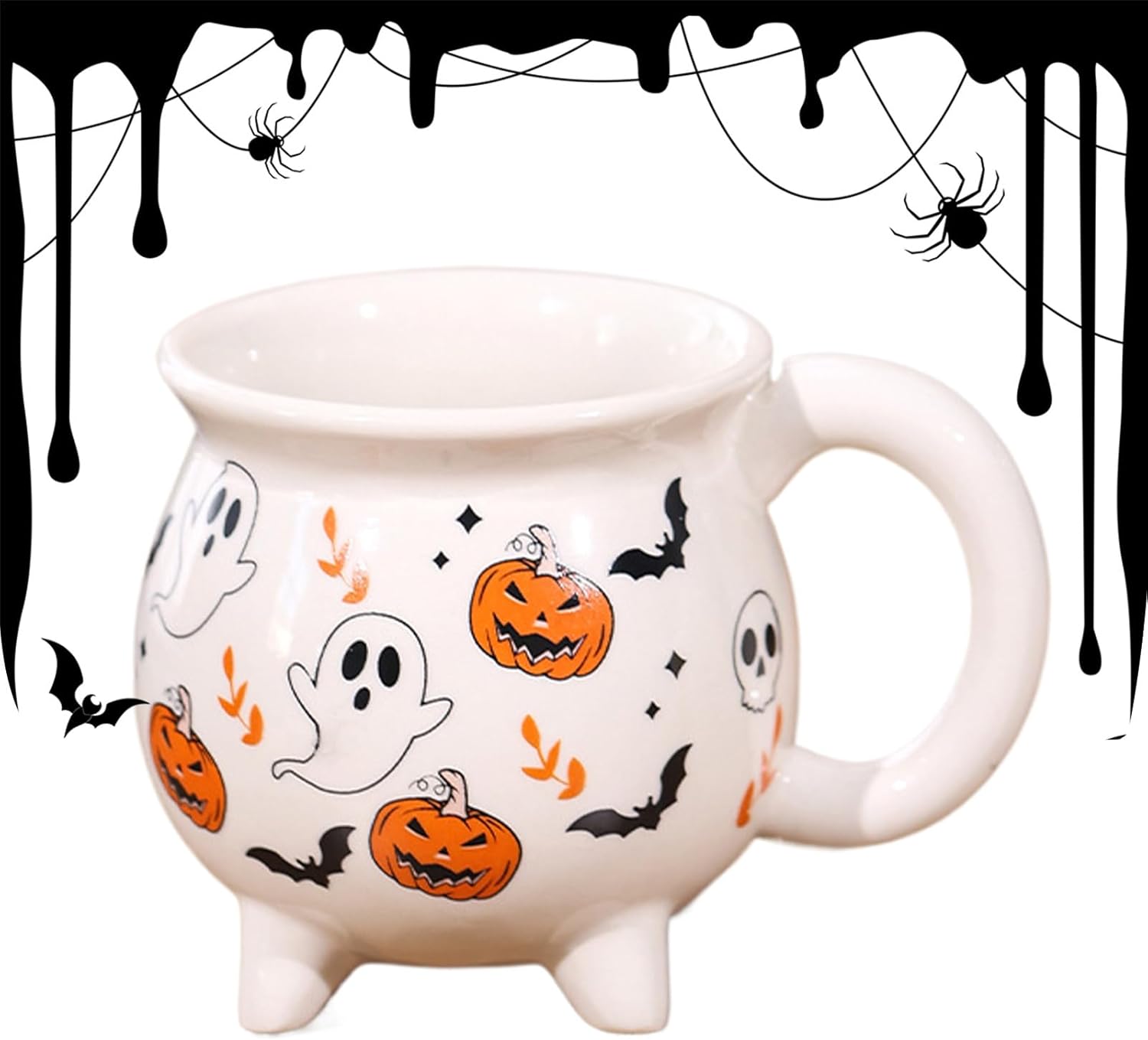 Perfetta atmosfera vacanziera: esalta lo spirito di Halloween e si integra perfettamente nelle decorazioni festive, ideale per dormitori, bar o luoghi in cui si apprezzano gli umori stagionali. Miglioramento dell'arredamento stagionale: come decorazione decorativa per la tavola, questa tazza di Halloween migliora l'arredamento stagionale, combinando funzionalità e stile per l'uso quotidiano e l'atmosfera festosa, perfetta come elegante espositore che cattura lo spirito della stagione. Ampia apertura: la generosa capacità di 350-450 ml con una forma ampia rende questa tazza versatile per bevande calde, zuppe o dessert a festival come Halloween Presa sicura: grazie alla curva ergonomica dell'impugnatura e al design della superficie antiscivolo, questa tazza offre una presa migliore con resistenza al calore e comfort senza fatica. Motivi decorativi spettrali: Decorata con motivi di Halloween spaventosi ma affascinanti, questa tazza da strega migliora le tue decorazioni stagionali e porta un'atmosfera festosa in ogni occasione grazie ai motivi spettrali dettagliati e alla durevole qualità della ceramica