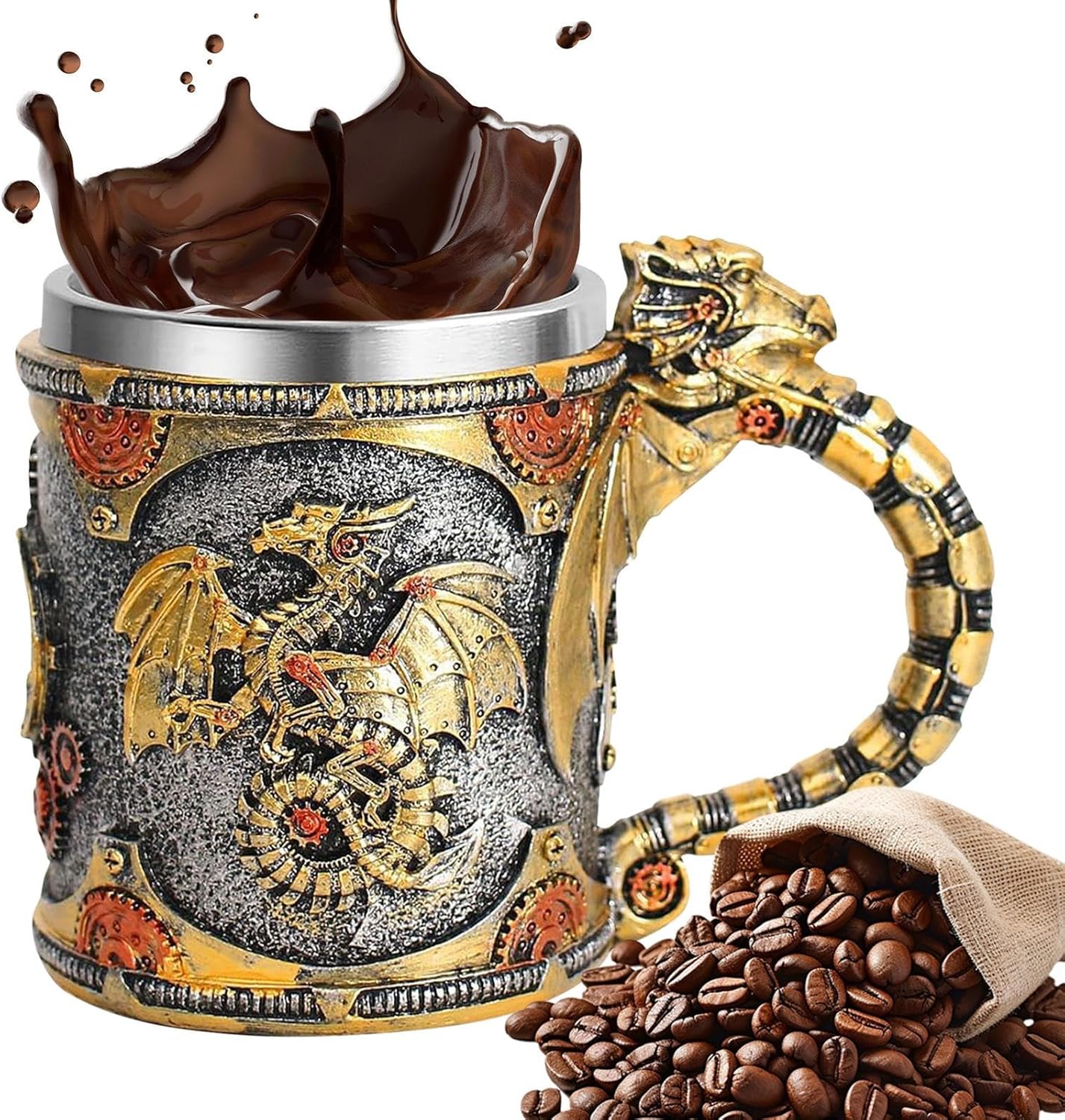 Fantasy Art Decor: combinando ispirazione steampunk e lavorazione a rilievo meccanico, questa tazza con drago dorato presenta un tema fantasy, ideale per gli appassionati di decorazioni artistiche. Presa comoda: il design di questa tazza resistente alla temperatura e al sudore presenta un esterno in resina testurizzata con un inserto in acciaio inossidabile per prestazioni durature e distinzione visiva. Resistente ai graffi ed ergonomica: realizzata con superfici antigraffio, la tazza con drago con finitura opaca offre una presa comoda, mentre il bordo senza cuciture e il bordo che protegge le labbra garantiscono funzionalità nella vita di tutti i giorni. Ampiamente utilizzata: perfetta per feste, case e ambienti aziendali. Questa tazza contiene 400 ml della tua bevanda preferita e può ospitare diversi tipi di bevande, garantendo versatilità come tazza da tutte le bevande per ogni occasione. Ottimo regalo: un must per i collezionisti, questa tazza con drago combina il fascino dei bicchieri da cerimonia con il suo ruolo di decorazione per feste a tema, rendendola una scelta eccellente per gli amanti del fantasy immersi nella cultura geek