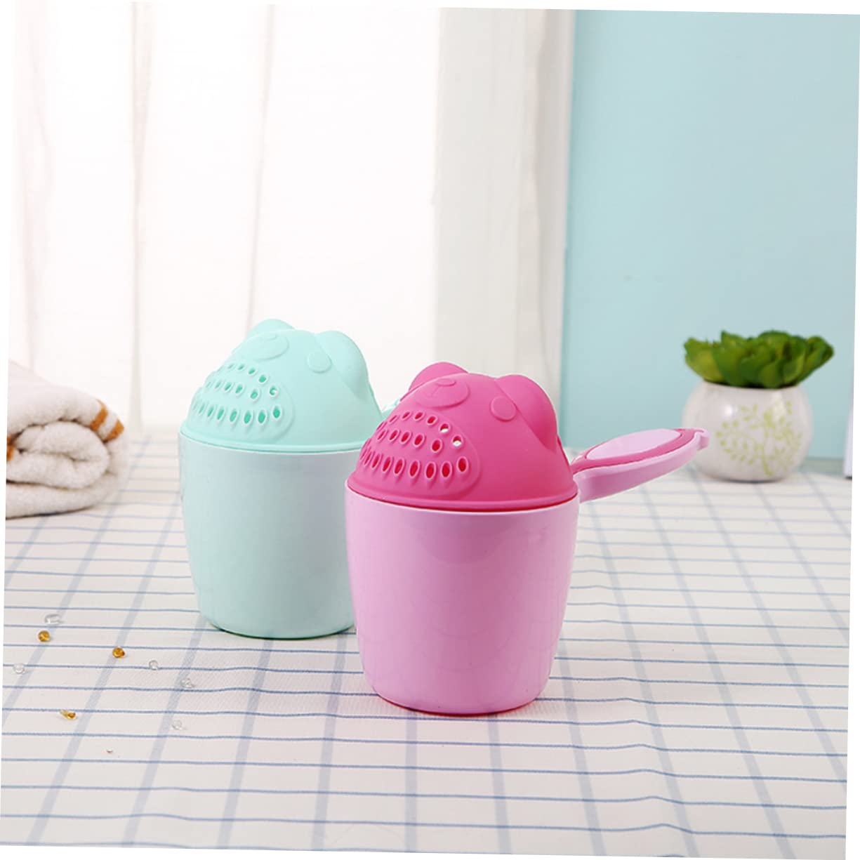 Irrigatore per shampoo: facile da usare, l'acqua scorre direttamente attraverso i capelli del bambino, risciacqua lo shampoo evitando il contatto con gli occhi, misurino per acqua da bagno, cucchiaio per doccia per bambini: materiale plastico resistente, impugnatura comoda, facile da tenere e versare, misurino per acqua da bagno. Tazza per shampoo: il simpatico stile cartone animato può attirare l'attenzione dei bambini e aggiungere più divertimento al bambino. Bollitore per il bagno Bollitore per il bagno: può non solo lavare, ma anche innaffiare fiori, come fiori, cucchiaino, doccia. Tazzina per il risciacquo della vaschetta del bagnetto: con questa tazza puoi sciacquare i capelli del bambino proteggendo il viso e gli occhi. produttore di acqua per il bagno
