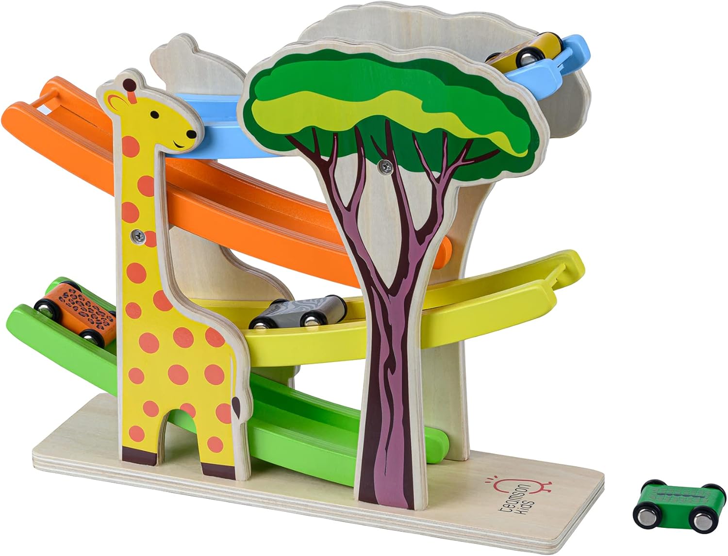 DESIGN: il set da gioco Safari Car presenta una finitura in legno naturale con sfaccettature dai colori vivaci per aggiungere un elemento giocoso alla cameretta o alla stanza dei giochi del tuo bambino. COMPRENDE: Circuito con 4 rampe colorate e 4 auto Safari stampate con animali per offrire al tuo piccolo ore di gioco. EDUCATIVO: strumento di apprendimento in legno: promuove la coordinazione occhio-mano mentre le auto da corsa scendono dalle rampe. DURATA: Realizzato con legno robusto che durerà per molti anni e può essere facilmente pulito. DIMENSIONI - L 25 cm x P 9 cm x H 31 cm.