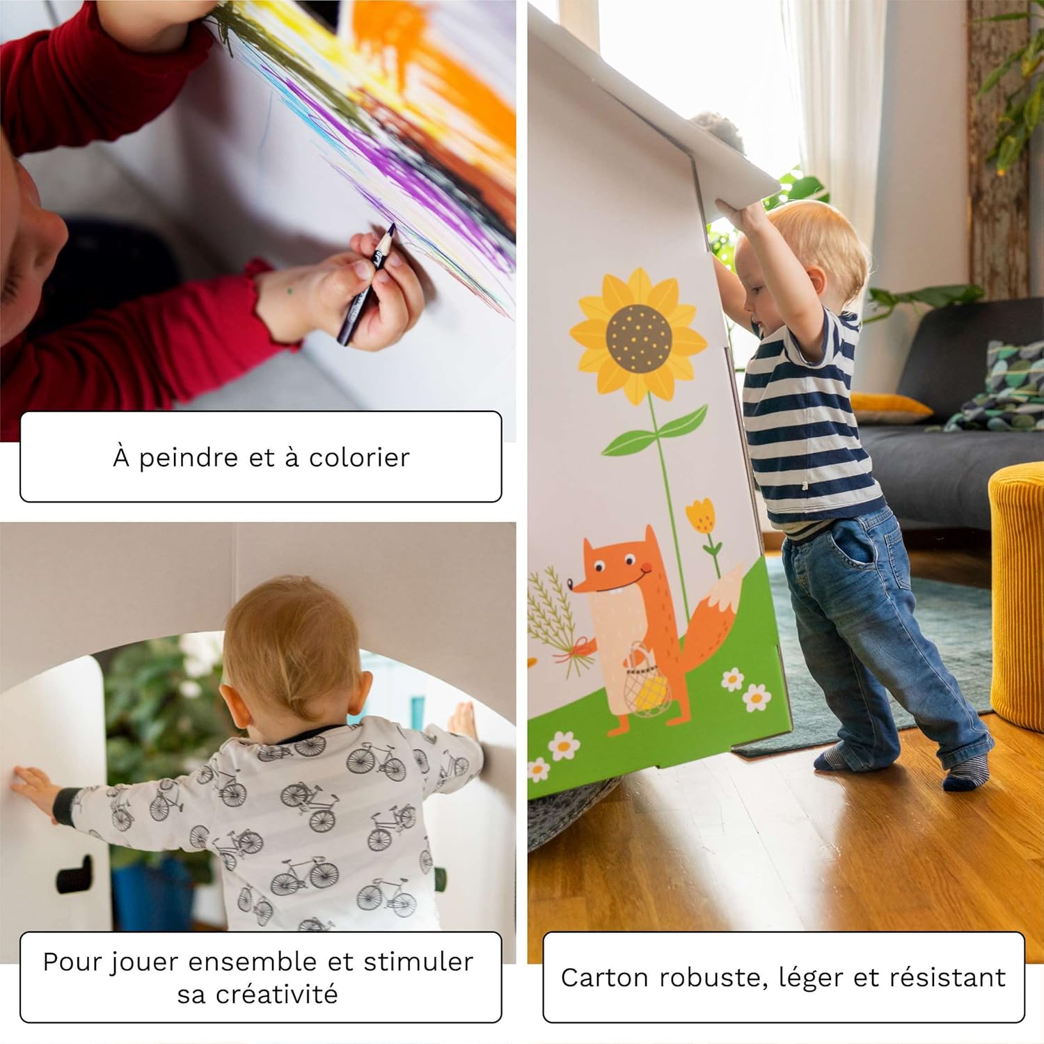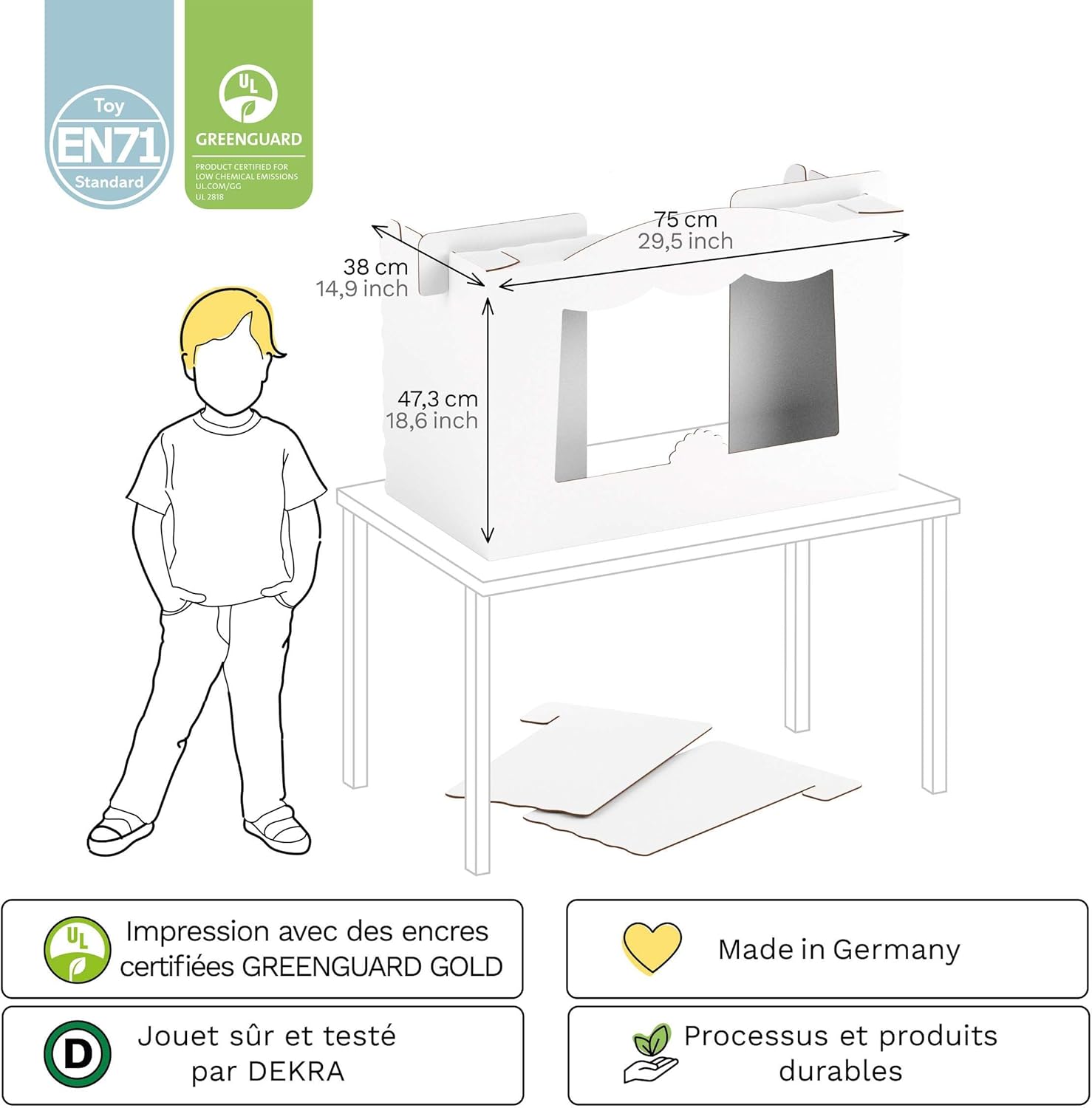 Divertimento creativo: i nostri teatrini sono realizzati per stimolare la fantasia e vivere emozionanti avventure. A seconda del modello, puoi riceverli stampati, colorati o personalizzabili La sicurezza prima di tutto: i giocattoli sono accuratamente progettati e testati da DEKRA. Inoltre utilizziamo inchiostri da stampa innocui e dotiamo l'interno di bordi ondulati. Il materiale più adatto per i giochi: utilizziamo cartone proveniente da una gestione forestale responsabile. È solido, resistente e leggero. Un gioco perfetto per tutta la famiglia: i nostri teatrini in cartone sono stati pensati per i bambini. Con i genitori possono essere assemblati rapidamente, facilmente e senza attrezzi. Durevoli: i prodotti riciclabili e compostabili sono realizzati su ordinazione