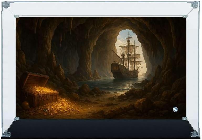 La teca in Plexiglass su misura compatibile con I Goonies LEGO 21363 Modello Arca Lite spessore lastre 4mm con viti e angolari trasparenti Base in Plexiglass nero lucido spessore lastra 5mm Sfondo incluso e rimovibile 100% Made in Italy