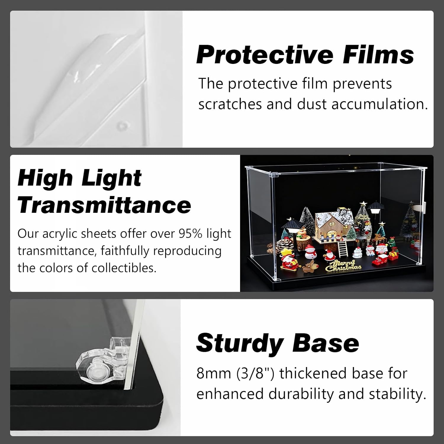 【Elevata trasmissione luminosa】Questa vetrina utilizza materiale acrilico di alta qualità con una trasmissione luminosa del 95%, creando un guscio protettivo cristallino che riproduce fedelmente i colori reali degli oggetti esposti da qualsiasi angolazione. 【Protezione da polvere e raggi UV】Le eccellenti proprietà sigillanti dell'acrilico bloccano efficacemente l'infiltrazione di polvere, riducendo al contempo l'esposizione alla luce solare e ai raggi UV. Una vetrina in acrilico previene l'ingiallimento e lo scolorimento, garantendo che i tuoi oggetti da collezione rimangano in perfette condizioni. 【Anta con apertura frontale】La vetrina è dotata di un'anta frontale che si apre fino a 180 gradi, consentendo un'apertura e una chiusura fluide. Questo design facilita la sostituzione degli oggetti esposti e la manutenzione. 【Robusta e impilabile】I pannelli superiore e inferiore sono realizzati in fibra di legno spessa. Le loro scanalature sui quattro lati si incastrano perfettamente con la piastra di copertura in acrilico, creando una struttura robusta e durevole che consente di impilare più vetrine. 【Ampiamente applicabile】Le vetrine in acrilico sono ideali per esporre oggetti da collezione, cimeli sportivi, statuette, personaggi di anime, souvenir, modellini, statue e altri oggetti da collezione. Sono soluzioni essenziali per riporre gli oggetti in casa e rappresentano regali unici e premurosi per amici e familiari.