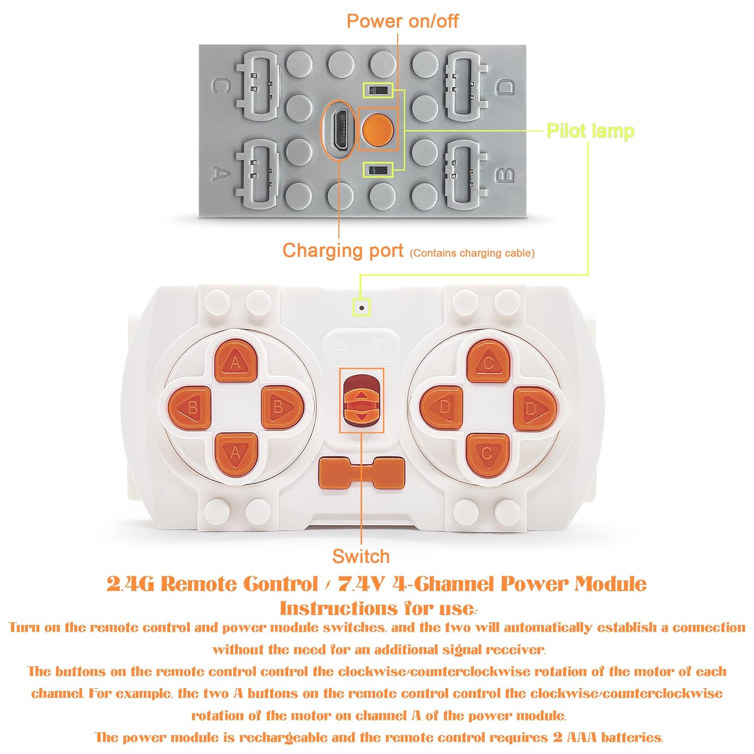 ♦ Versatilità creativa nei progetti di motorizzazione: con il nostro set di motori potete trasformare le vostre idee in realtà, sia che si tratti di costruire robot, veicoli o strutture meccaniche complesse. ♦ Infinite possibilità di combinazione: con la possibilità di combinare più set di motori, non ci sono limiti alla tua creatività. Crea creazioni più grandi e complesse semplicemente aggiungendo più motori. Scopri le infinite possibilità della motorizzazione! ♦ Controllo remoto completo: con il telecomando a quattro canali, non solo potrai divertirti ma anche avere un controllo preciso sulle tue creazioni. Ogni canale è dotato di due pulsanti per controllare la rotazione avanti e indietro dei motori, permettendoti di manovrare i tuoi modelli con facilità. ♦ Integrazione perfetta con i dispositivi mobili: collega il modulo batteria al controllo dell'applicazione del tuo telefono cellulare e scopri una nuova dimensione di controllo. Regola la velocità del motore e la modalità di programmazione o utilizza altre funzionalità innovative per ottimizzare e personalizzare i tuoi modelli. ♦ Compatibilità universale e facilità di montaggio: il kit è compatibile con la maggior parte delle marche di elementi costitutivi ed è facile da montare e smontare. Che tu abbia già una vasta collezione di mattoncini o che tu sia nuovo nell'hobby, questo set di motori è l'aggiunta perfetta per ogni amante dei mattoncini. Regala ispirazione e creatività con questo regalo ideale!