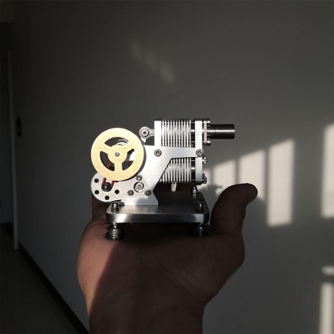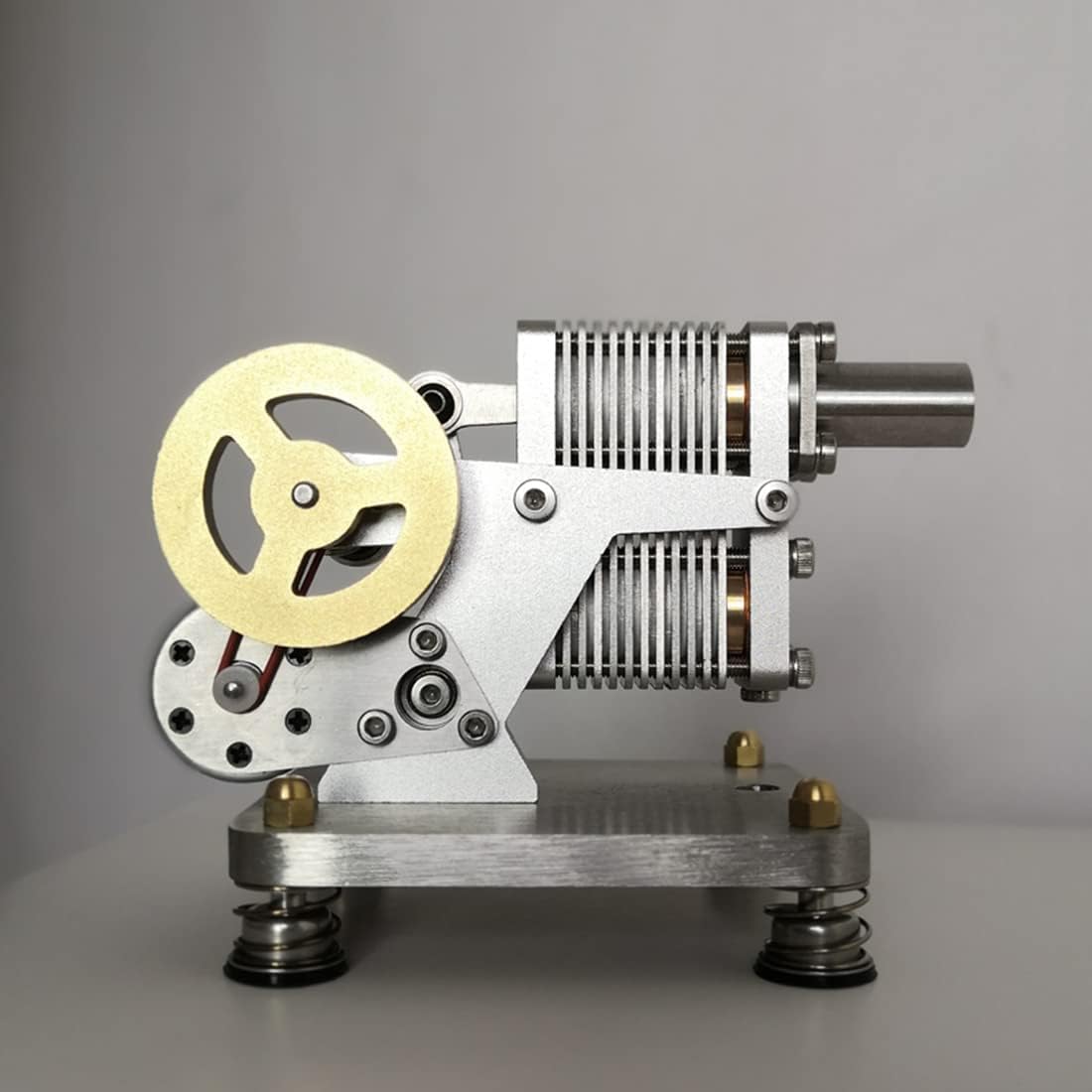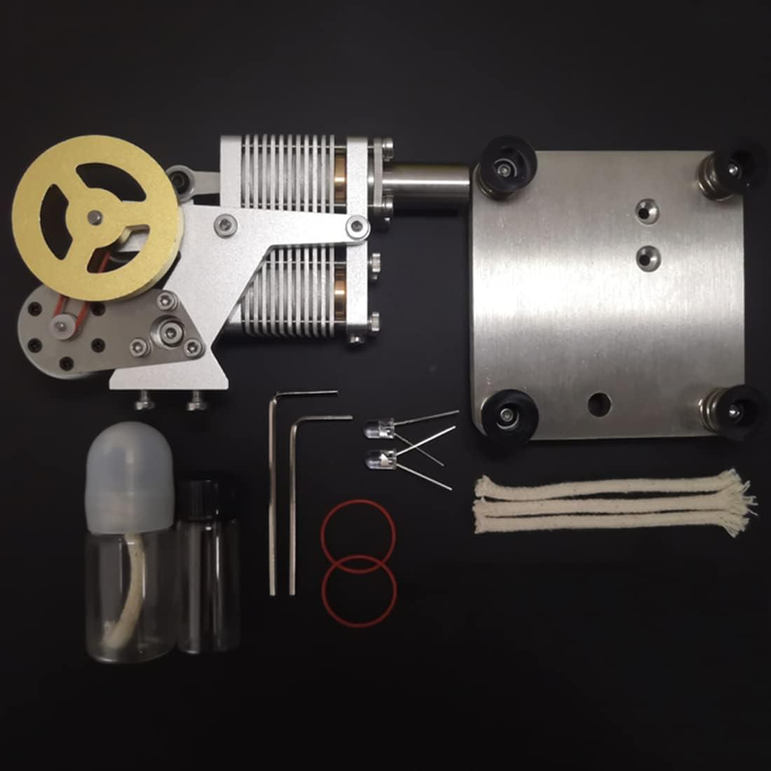 Il motore Stirling è caratterizzato da forte potenza ed alta velocità ed è dotato di una leva bilanciere a T e di un albero motore con struttura α. Le parti mobili del motore sono tutte dotate di cuscinetti a basso coefficiente di attrito. Il cilindro è in ottone e il pistone è in acciaio legato SUJ-2 rettificato di precisione. Queste due parti del motore resistenti all'usura sono saldamente collegate insieme e hanno un'elevata tenacità. L'intera connessione è fissata con viti e tutte le parti di connessione sono sigillate con rondelle in rame per prestazioni sorprendenti e resistenza alle alte temperature. Il motore è dotato di un dissipatore di calore in lega di alluminio ad alta densità per un tasso di scambio termico più elevato e di una molla a doppio strato per l'assorbimento degli urti, che consente un funzionamento regolare. Il modello del motore interamente in metallo è di piccole dimensioni, compatto nella struttura e affidabile nelle prestazioni. Assemblato con più di 150 piccole parti, inclusi 12 cuscinetti, 30 viti in acciaio inossidabile, ecc. Per creare uno squisito modello interamente in metallo con livello di produzione industriale, la superficie eterna viene trattata con lega di alluminio 6061 dopo la lavorazione di sabbiatura CNC.