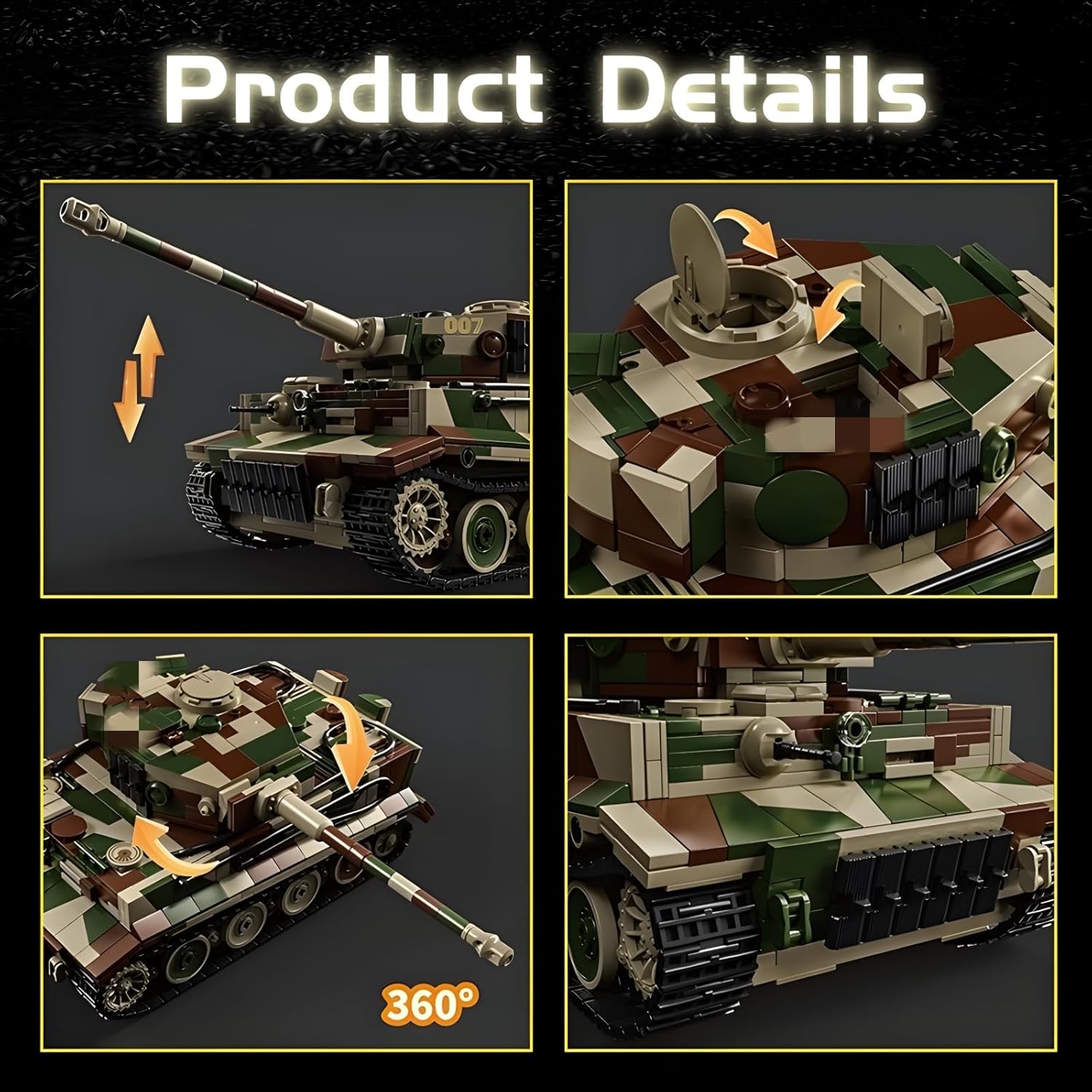【Blocchi di costruzione del carro armato tigre leggendario】: questi blocchi di costruzione del carro armato tigre della Seconda Guerra Mondiale altamente restaurati, un carro armato classico, offrono un divertimento senza fine e si imbarcano in una meravigliosa avventura. Il carro armato presenta dettagli straordinari per un'esperienza di costruzione più coinvolgente. 【Impara giocando al modello di carro armato giocattolo】: accendi l'immaginazione e l'interesse per la storia con questi elementi costitutivi coinvolgenti ed educativi del carro armato Tiger, perfetti per giocare con amici e familiari. Goditi un'esperienza stimolante e gratificante. 【Divertente gioco di assemblaggio e creatività】: la canna della pistola può essere sollevata e abbassata, la torretta può essere ruotata di 360 gradi. Il carro armato è dotato di numerosi dettagli rimovibili che ti permettono di immergerti nella Seconda Guerra Mondiale e goderti ore di divertimento con il gioco di ruolo. Un gioco avvincente e interattivo che stimola la creatività. 【Costruisci il tuo mondo militare】: usa questo straordinario set di blocchi Tiger Tank con minifigure, armi ed equipaggiamento per creare il tuo mondo militare. Costruisci la tua squadra con altri giocattoli della serie militare e lascia che l'avventura abbia inizio! 【Regalo creativo per i fan militari】: costruisci il leggendario carro armato Tiger con parti durevoli e di alta qualità, pieno di creatività e intrattenimento. Le dimensioni sono 30,7 x 12,8 x 11 cm. Sono incluse istruzioni colorate. Il regalo perfetto per compleanni, Capodanno, Natale, rientro a scuola e altre festività e occasioni speciali.