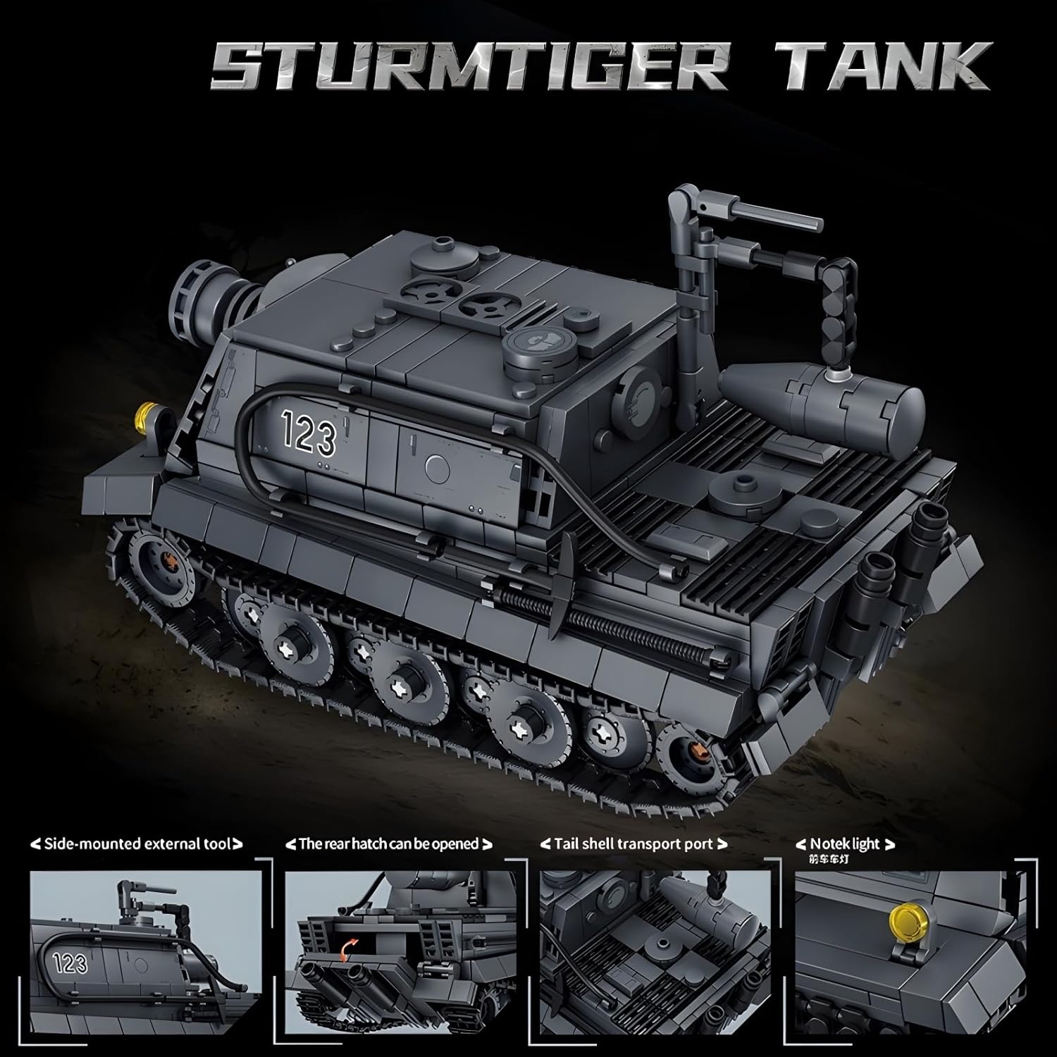 「Set di carri armati Sturmtiger della Seconda Guerra Mondiale」: questo modello di carro armato ricrea fedelmente il classico carro armato Sturmtiger della seconda guerra mondiale e offre un gameplay colorato e interessante. Il carro armato colpisce per i suoi dettagli mozzafiato e garantisce un'esperienza di costruzione ancora più intensa. 「Blocchi di costruzione del morsetto per serbatoio Sturmtiger」: include istruzioni per la costruzione a colori. Presenta il tuo Panzer Tiger. Scopri la straordinaria ingegneria del Tiger P della Seconda Guerra Mondiale mentre lo costruisci. Le dimensioni assemblate sono circa 20 cm × 10 cm × 12 cm. 「Assemblaggio divertente e gioco creativo」: accendi la tua immaginazione e il tuo interesse per la storia con questo divertente ed educativo giocattolo per la costruzione di carri armati della Seconda Guerra Mondiale. Il carro armato presenta numerosi dettagli rimovibili che ti immergono nella Seconda Guerra Mondiale e garantiscono ore di divertimento nel gioco di ruolo. 「Costruisci il tuo mondo militare」: crea il tuo mondo militare con questi fantastici blocchi di carri armati Sturmtiger e combinalo con modelli di carri armati di diverse marche. Un gioco avvincente e interattivo. Visualizza il modello del tuo carro armato in qualsiasi momento. 「Idee espositive e valore di raccolta」: puoi posizionarlo su un tavolo o in soggiorno, combinarlo con il set di blocchi di costruzione del serbatoio o presentare le tue opere d'arte. Questo elemento costitutivo Panzer Tiger è l'aggiunta perfetta alla tua collezione di elementi costitutivi per i fan militari.