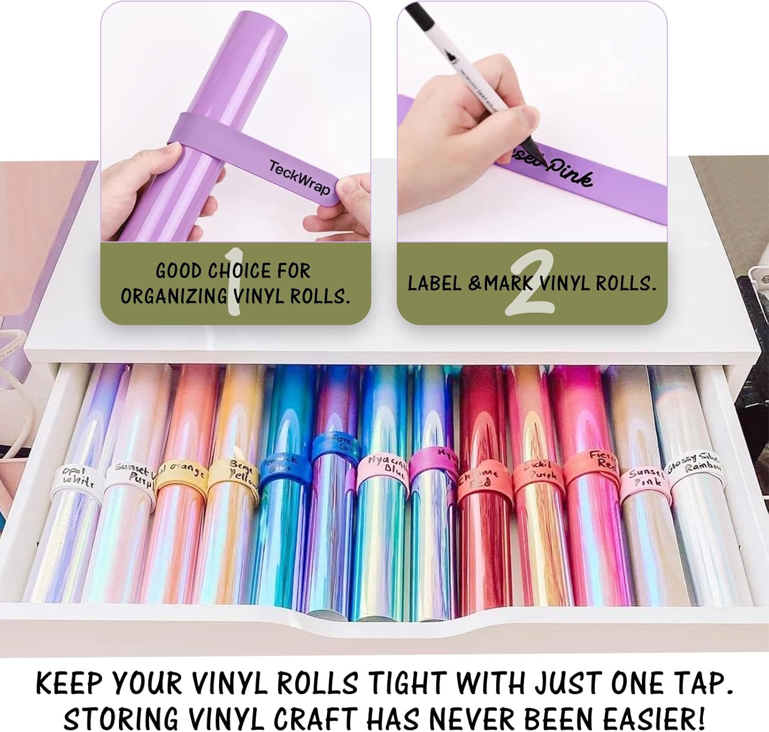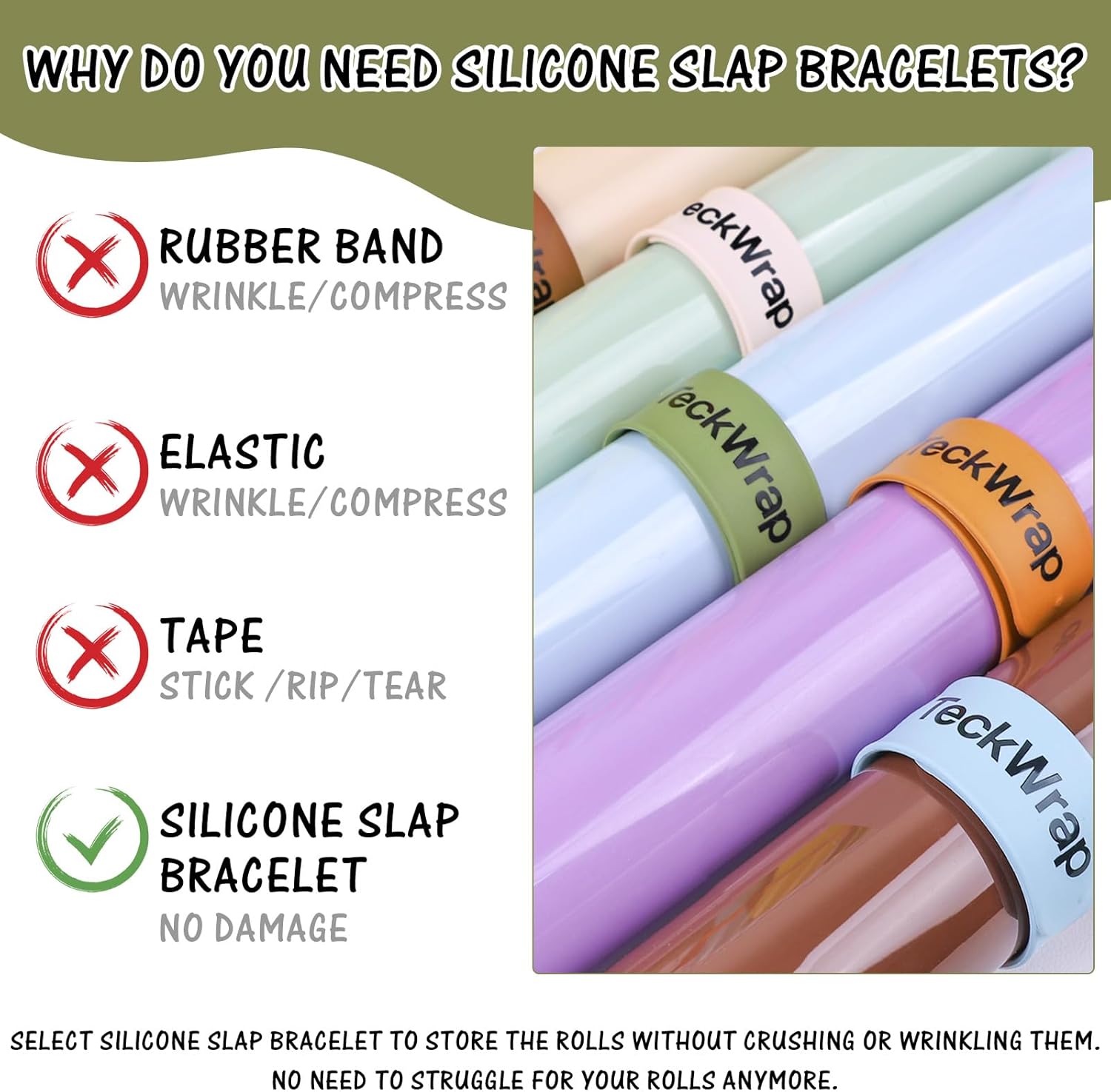 COLORI VIBRANTI E STILE VERSATILE: questo set di braccialetti Slap TECKWRAP comprende 6 colori alla moda: viola, arancione caramello, marrone scuro, blu smog, bianco avorio e verde oliva. La varietà di colori li rende adatti a diverse occasioni e preferenze personali. Morbidi, comodi, multifunzionali e durevoli: realizzati in silicone, questi braccialetti a scatto sono morbidi e confortevoli, resistenti alla rottura, alla deformazione e allo sbiadimento. Hanno una presa salda e durevole che non danneggia i rotoli di vinile o piega la carta, mantenendo i rotoli di vinile in condizioni perfette anche con un uso a lungo termine. Comoda conservazione e organizzazione: il materiale in silicone è antiscivolo e aiuta a mantenere i rotoli di vinile in posizione senza scivolare. Facili da pulire e adatti a rotoli di diverse dimensioni, questi braccialetti Slap possono essere immediatamente arrotolati e fissati. Una volta rimossi, i braccialetti possono essere raddrizzati per riporli comodamente. Facile da usare: estremamente facile da usare, basta premere la parte centrale del rotolo di vinile per arrotolarlo saldamente, evitando che il rotolo si srotoli. Puoi anche scrivere sui braccialetti in silicone Slap per etichettare e identificare i tuoi rulli preferiti, rendendo più facile trovare ciò di cui hai bisogno. Ampia gamma di usi: questi braccialetti Slap sono perfetti per conservare rotoli di vinile, materiali per il trasferimento di calore e altri oggetti arrotolati, mantenendoli organizzati. Possono essere utilizzati anche per collezionare poster per la scuola o indossati come braccialetti. Adatte a bambini, adolescenti e adulti, sono perfette per le attività familiari e l'artigianato.