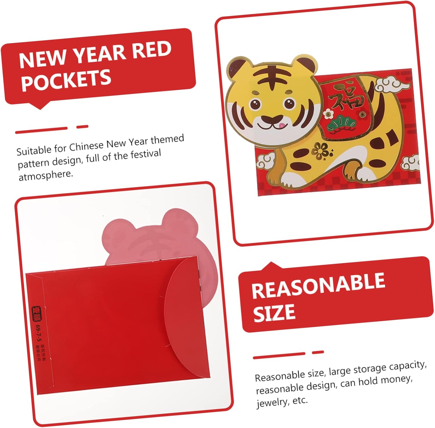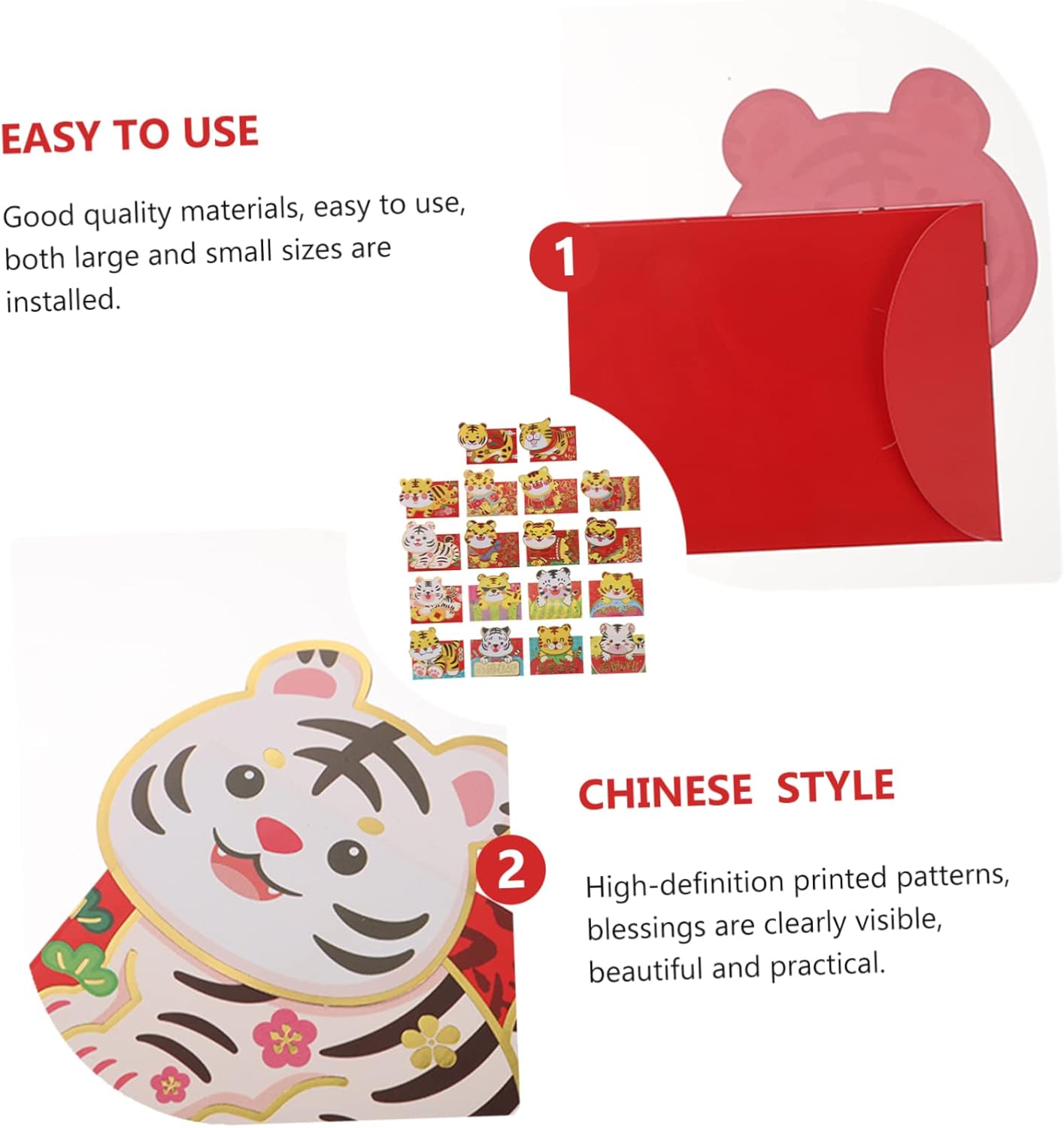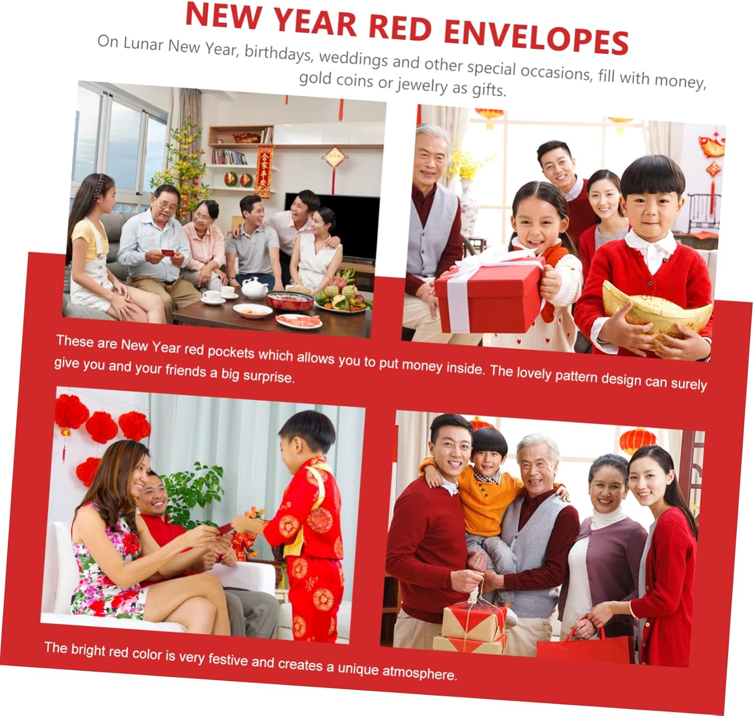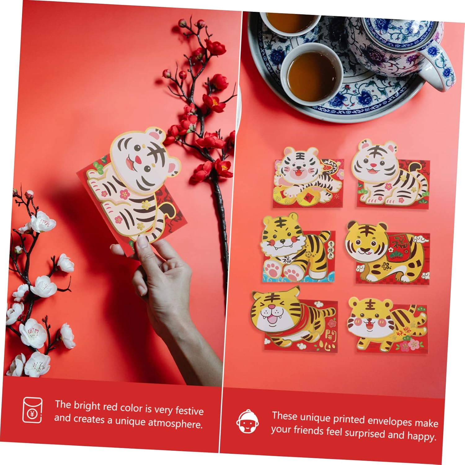 Prodotto con materiale di carta , pratico e durevole da usare. Applicabile a una varietà di scene, come il capodanno cinese, il dando ecc. Ogni busta rossa desidera ai destinatari di gioie, prosperità, buone benedizioni, buona fortuna. Su un capodanno lunare, compleanni, matrimoni e altre occasioni speciali, riempire con soldi, d'oro o gioielli come regali. Queste buste stampate uniche fanno sentire i tuoi amici sorpresi e felici.