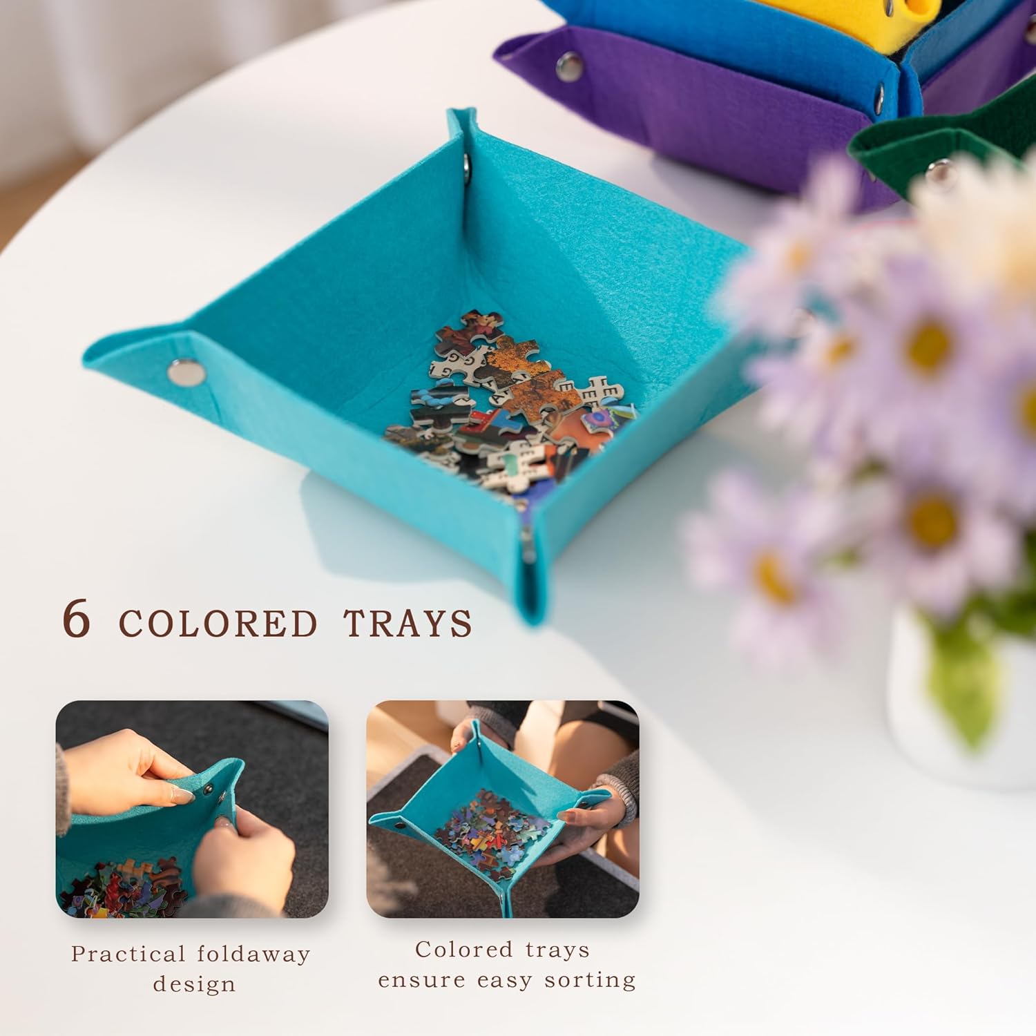 Design pieghevole: la tavola del puzzle può essere piegata fino a raggiungere una dimensione ultra compatta di 40 × 30 × 4 cm per riporla facilmente a casa quando non viene utilizzata. Leggero e pieghevole, si inserisce perfettamente in una borsa per il trasporto e ti consente di portarlo ovunque per continuare il tuo divertimento con i puzzle. Adatto a puzzle da 1000 pezzi: l'area utilizzabile è 76 × 57 cm, perfetta per la maggior parte dei puzzle da 1000 pezzi. La confezione include 10 clip in plastica bianca per fissare i bordi aperti e garantire una superficie piana e stabile. Copertura in feltro inclusa: la copertura in feltro di alta qualità resiste alla polvere e garantisce una facile pulizia. Previene anche la perdita accidentale dei pezzi del puzzle e li protegge da artigli curiosi. Bordo rialzato e materiale premium: la tavola del puzzle presenta bordi rialzati in feltro, con il design a colori a contrasto che aumenta il fascino estetico. Realizzato in materiale durevole e leggero, resistente alla flessione e che garantisce un uso a lungo termine. La superficie è rivestita in tessuto di feltro di alta qualità per garantire una sensazione confortevole e una presa salda per evitare che i pezzi scivolino. Vassoi portaoggetti foderati in feltro con codice colore - Include 6 vassoi di smistamento pieghevoli e colorati in feltro per organizzare i pezzi del puzzle in base al colore e rendere il gioco ancora più semplice. Le ciotole fungono anche da vani portaoggetti per garantire il progresso.