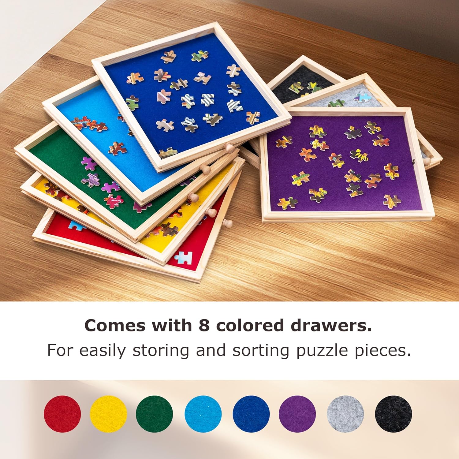 Design pieghevole: la nostra tavola puzzle è progettata pieghevole per renderla facile da usare e risparmiare spazio. Inoltre viene fornito con 2 maniglie in metallo per un facile spostamento. Il design portatile ti consente di goderti il divertimento del puzzle ovunque tu voglia. Si adatta alla maggior parte dei giochi di puzzle per PC da 2.000 - L'area utilizzabile è di 103 × 78 cm. Si applica a giochi di puzzle da 2.000 pezzi quando completamente diffusi, o si adatta a 1.000 giochi di puzzle per pc quando piegato. Racchiuso con una copertura in feltro: racchiuso con una copertura in feltro per resistere alla polvere e agli animali domestici, consente di mettere in pausa il gioco di puzzle e tenerlo al sicuro fino alla prossima volta. Comodo da usare con una consistenza eccellente. Include 8 cassetti colorati: viene fornito con 8 cassetti rivestiti in tessuto di feltro in vari colori per una maggiore efficienza di gioco garantendo una facile ordinazione. Ogni cassetto è progettato con un piccolo magnete per assicurarsi che rimanga chiuso durante il trasporto. Materiale di alta qualità: realizzato in legno di pino di alta qualità, robusto e durevole. Il piano del tavolo è rivestito in tessuto di feltro grigio per evitare che i pezzi del puzzle scivolino via. Il colore grigio è ideale per la maggior parte dei giochi di puzzle in diversi colori di sfondo, mentre il tessuto in feltro è abbastanza spesso da dare una sensazione confortevole