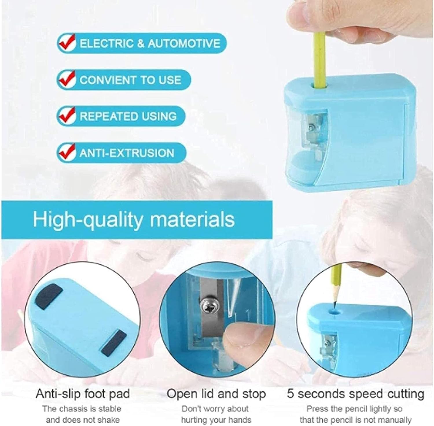【 Sicuro e affidabile 】Grazie al meccanismo di arresto automatico, il tuo bambino può utilizzare in sicurezza questo temperamatite elettrico, perché il rasoio smette automaticamente di funzionare. 【Facile da pulire e senza detriti 】Grazie a un vano di stoccaggio dei trucioli di grande capacità, non c'è bisogno di preoccuparsi che i trucioli si spargano su tutto il posto ed è facile da pulire