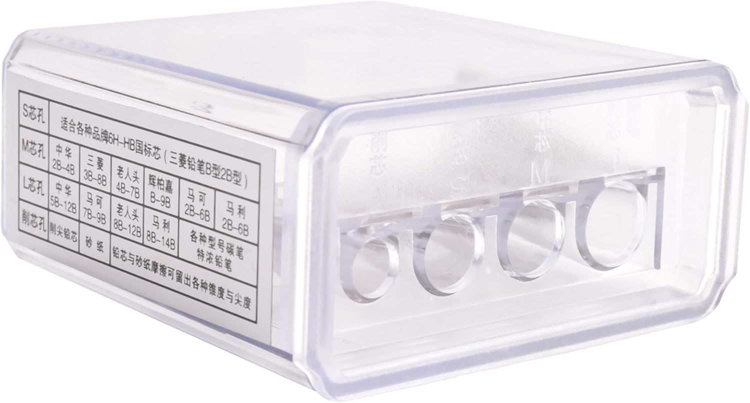Coperchio e scatola: il temperamatite dotato di coperchio in plastica e scatola per proteggere le lame e conservare i trucioli di matita, mantenere l' pulito durante l'uso Ampie applicazioni: il temperamatite manuale può essere applicato per schizzi, carboncino, matite colorate, adatto per adulti, bambini, studenti e altre attività artistiche di apprendimento o pittura Il pacchetto include: riceverai 2 pezzi di temperamatite professionale 4 in 1, il temperamatite manuale può soddisfare le tue esigenze quotidiane, puoi anche condividere con i tuoi friend Design pratico: il temperamatite portatile è progettato con 4 fori, foro L per matite carboncino e spesse, foro M per matita media, foro S per matita piccola, mini foro per affilare le matite fino a un punto, 4 in 1 il temperamatite manuale può soddisfare le tue esigenze e affilare l'intera matita fino alla fine Dimensioni e materiale: il temperamatite manuale misura ca. 6 x 6 x 3 cm/ 2,36 x 2,36 x 1,18 pollici, realizzato in plastica trasparente di qualità, resistente e non facile da danneggiare, può essere applicato a lungo, la dimensione corretta è facile da trasportare